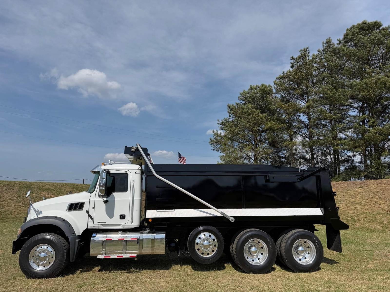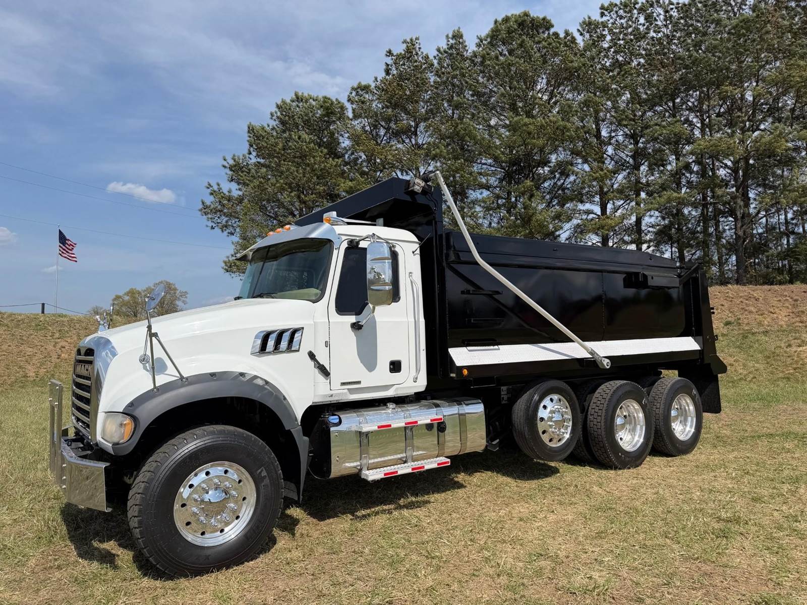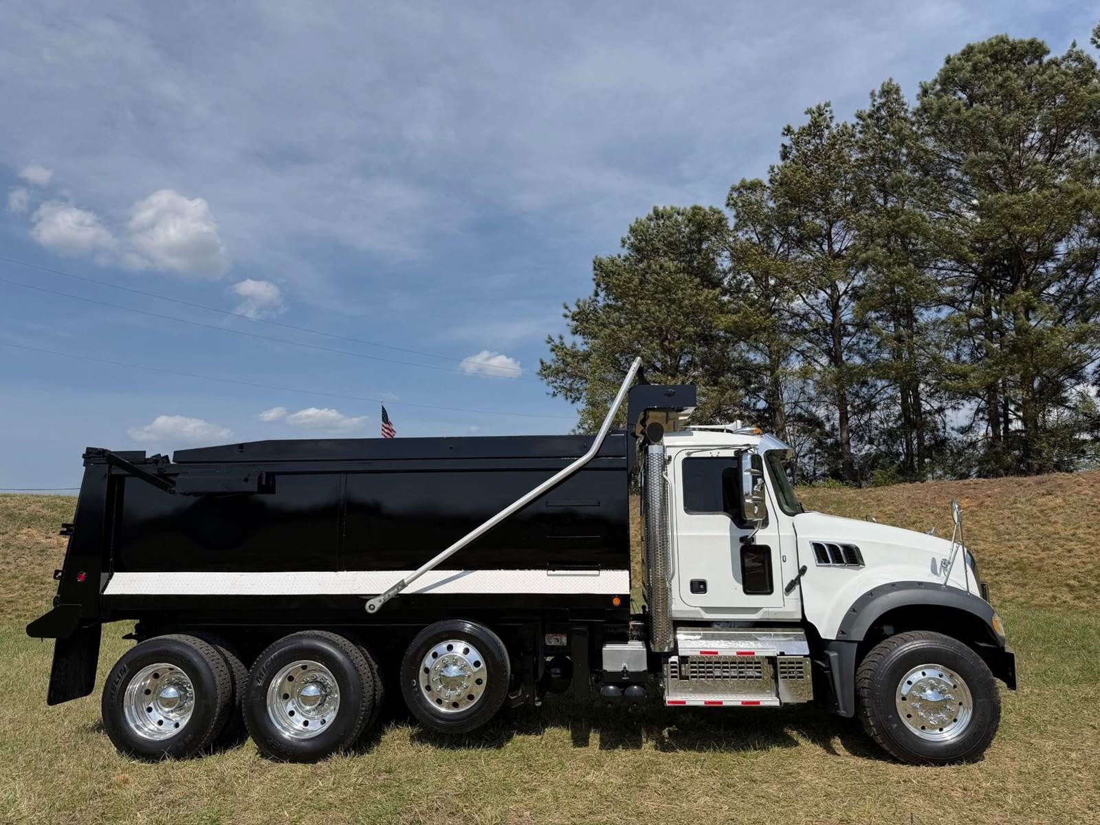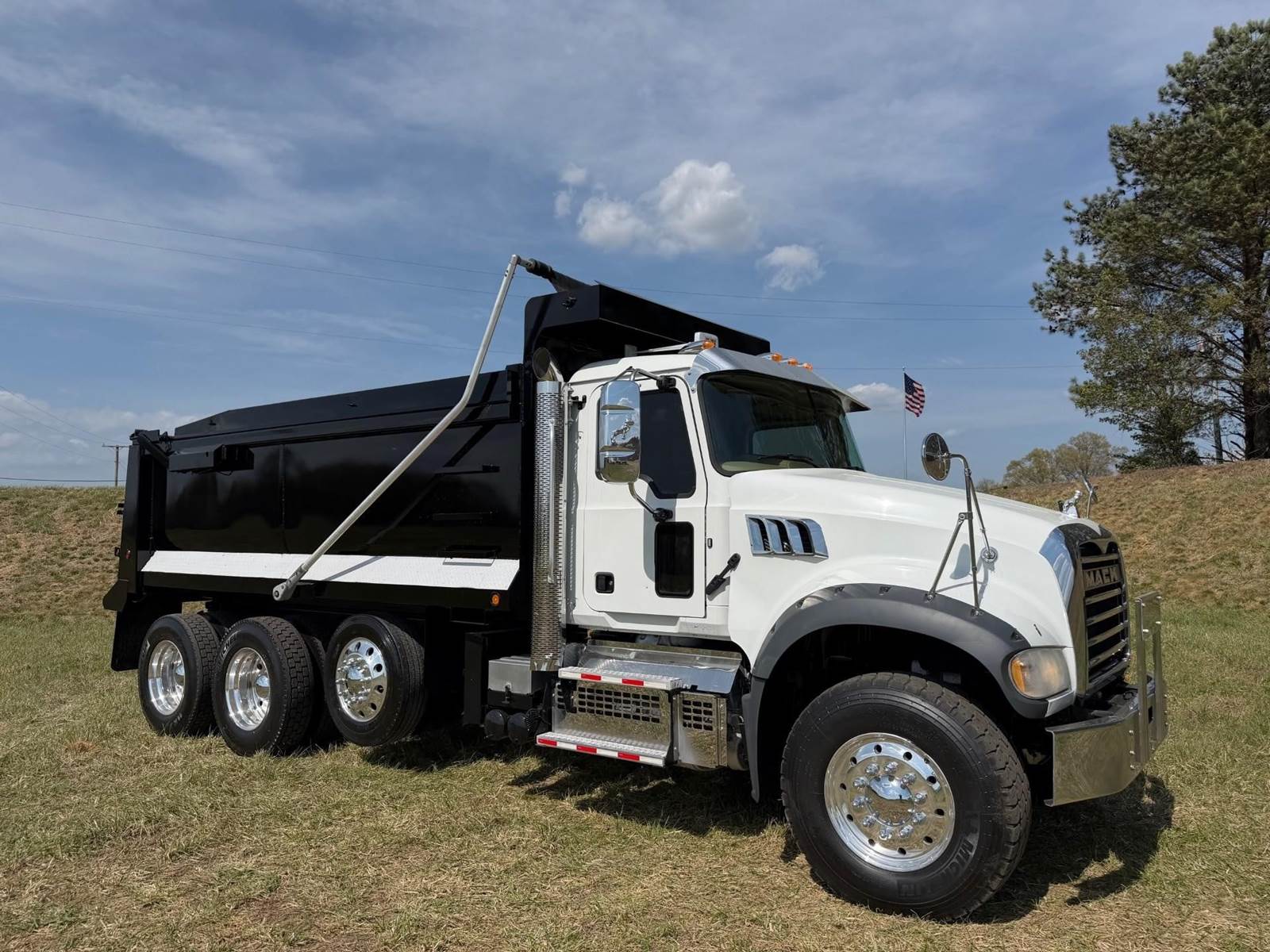Triaxle, 17' Double A Steel Dump w/50" Sides, High Lift Gate, MP8 Mack 455 HP, Allison Automatic, 3.98 Ratio, 3 Stage Engine Brake, Camelback, Double Frame, 20K FA, 46K RA, Steerable L/A, 230" WB, 21'4" Bridge, Diff Lock, Wheel Lock, Electric Tarp, Air/High Lift Tailgate, Bed Vibrator, P/S, A/C, AM/FM CD Bluetooth, Heated Mirrors, Cruise, Tilt/Tele Wheel, Power Windows, Locks, and Mirrors, High Back Seats, 125 Gallon Aluminum Fuel Tank, 385/65R22.5 Steer Tires on Aluminum Wheels, 11R24.5 Drive Tires on All Aluminum Wheels, Chrome Bumper