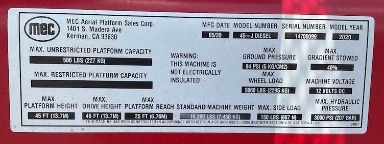 The 2020 MEC 45J-D Boom Lift is a dependable diesel-powered articulating boom designed to deliver the reach, stability, and efficiency needed for professional elevated work. Built for durability on demanding job sites, this 45-foot class lift offers smooth, precise controls and excellent maneuverability, making it ideal for construction, maintenance, facility work, and industrial applications.