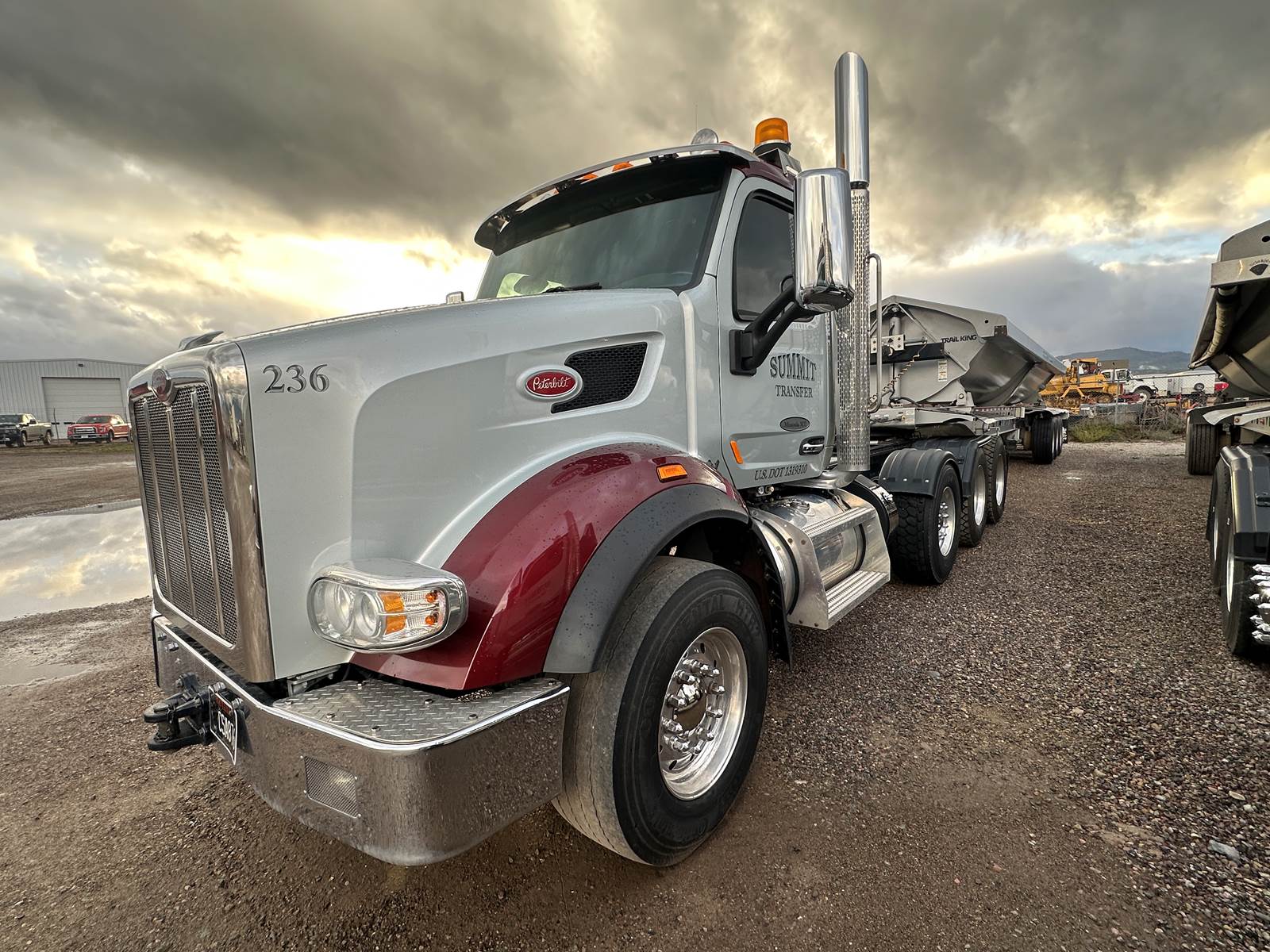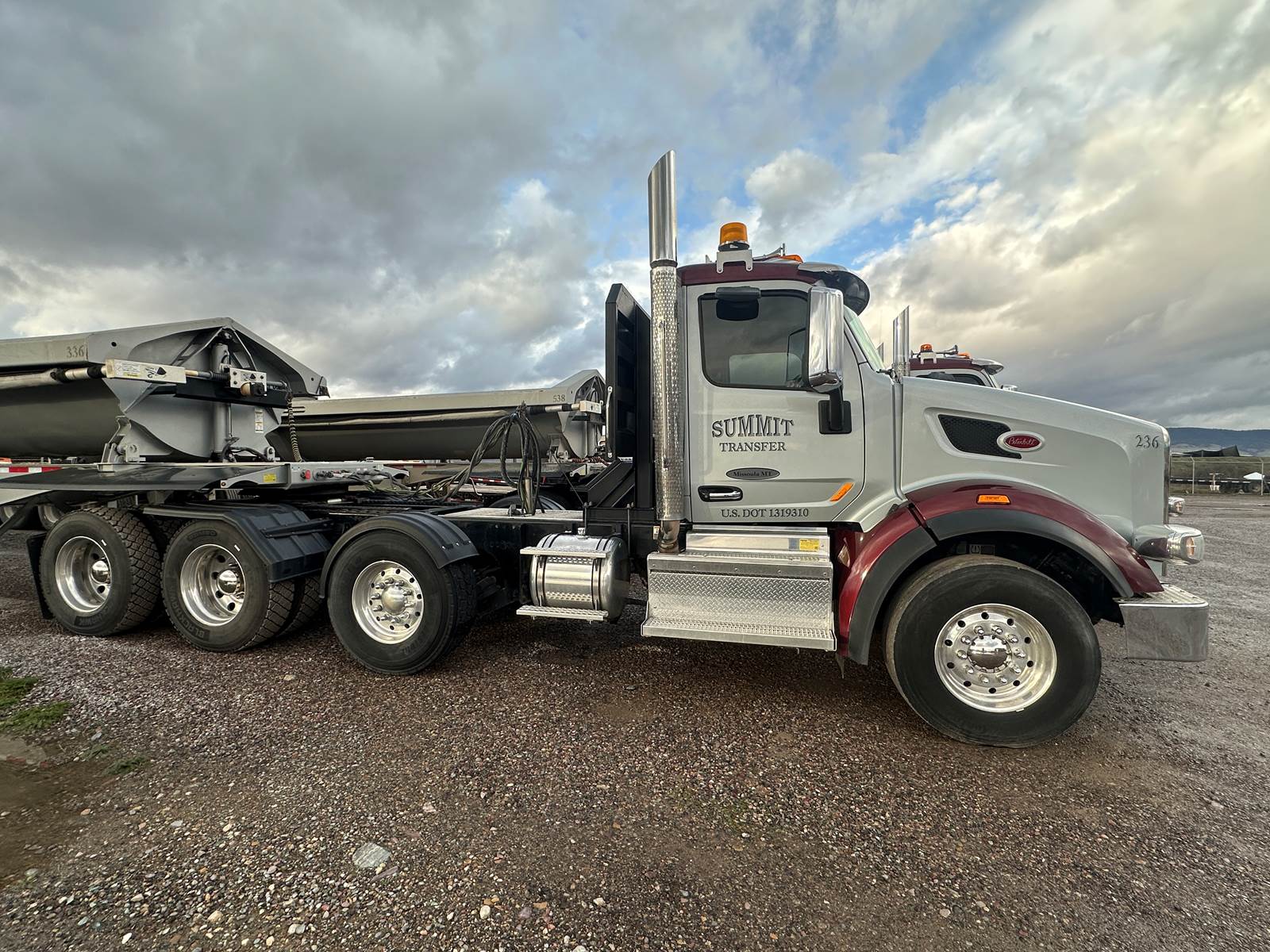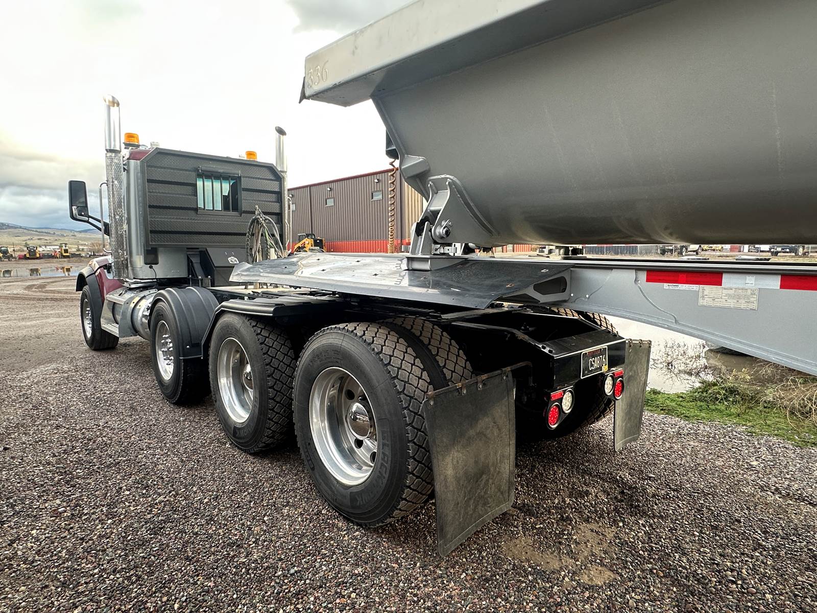 Truck is set up for lowboy, belly dump & side dump.