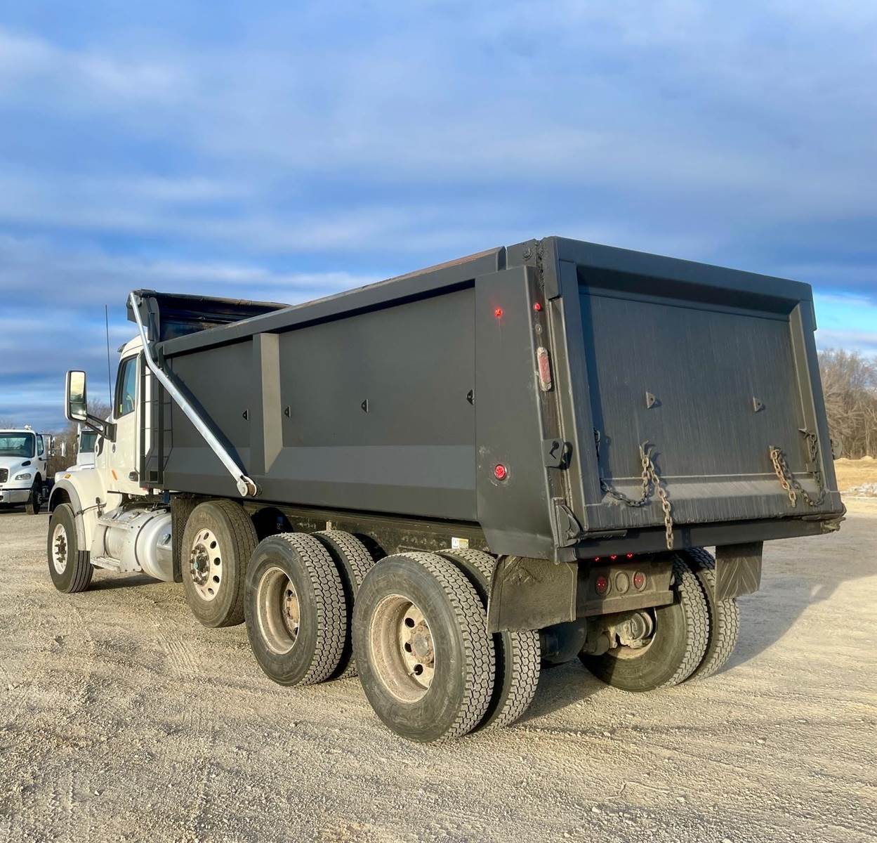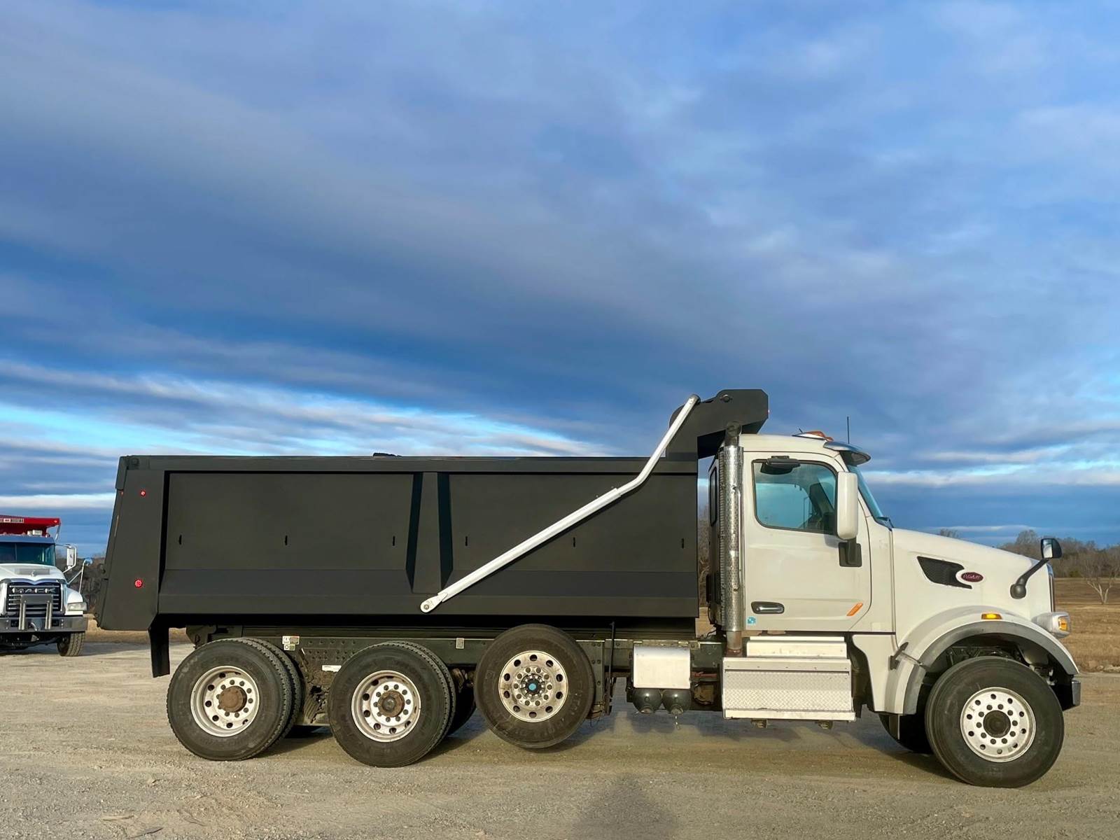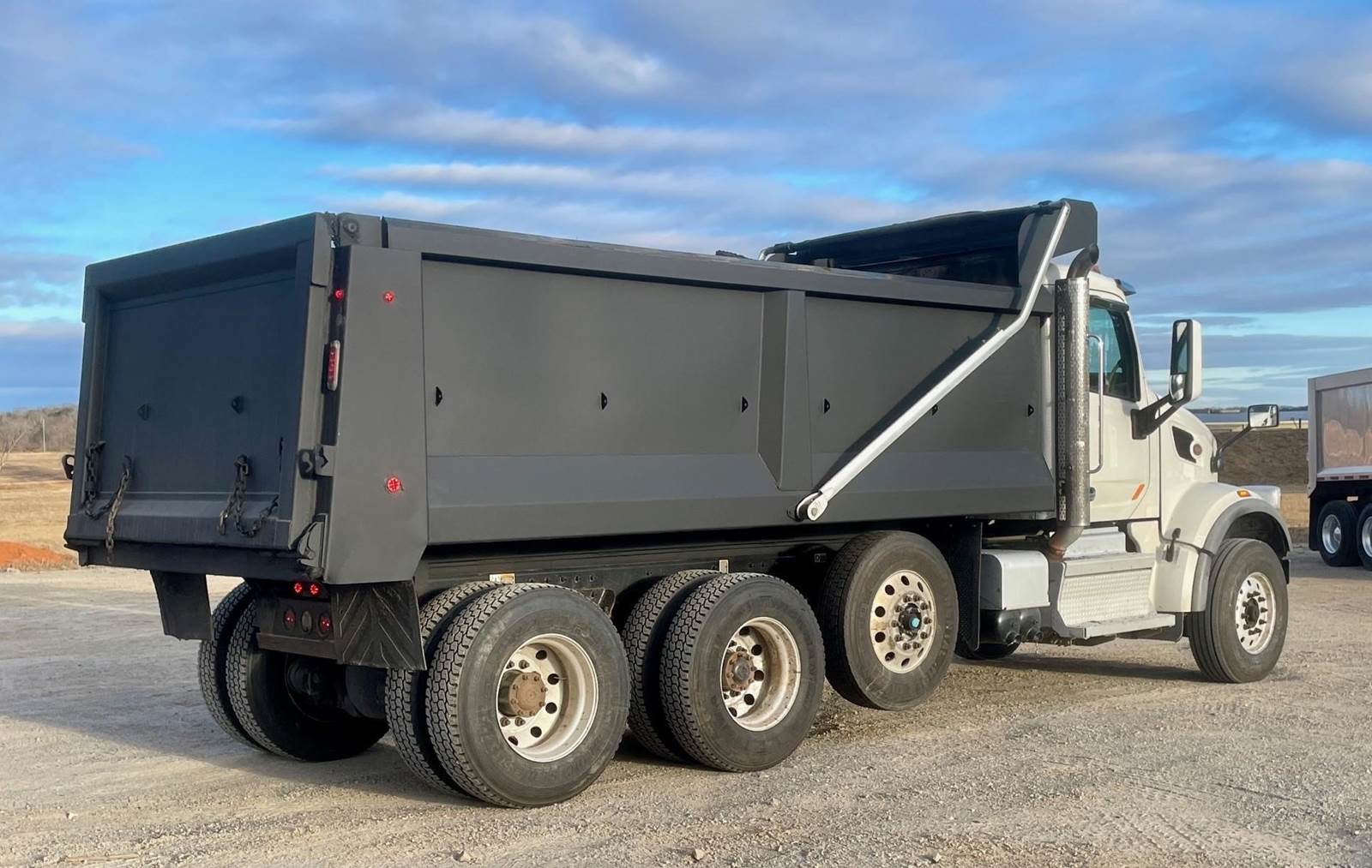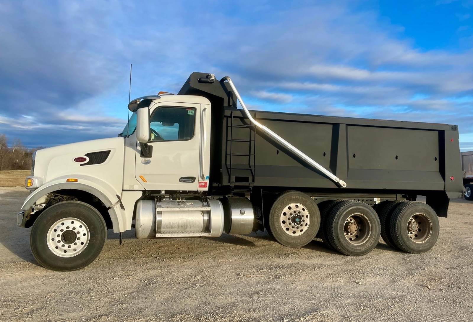 Triaxle, 17' Tebco Steel Dump, Sloped Sides 56" - 52", Electric Tarp, Air Gate, 252,862 miles, 11,257 Hours, Paccar 430 HP, Allison Auto, Three Stage Engine Brake, P/S, A/C, AM/FM Bluetooth, Heated Mirrors, Cruise, Tilt/Telescopic Wheel, Power Windows/Locks/Mirrors, Dual High Back Seats, Dual Power Steering Boxes, 20,000 F/A, 46,000 R/A, Steerable Lift Axle, Haulmaax Suspension, 120 Gallon Aluminum Fuel Tank, 315/80R22.5 Steer Tires On Aluminum, 11R22.5 Drive Tires On Aluminum, 226" W/B, 254" Bridge