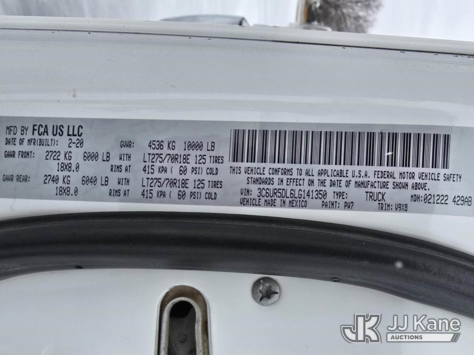 2020 RAM 2500 Crew-Cab Pickup Truck, 6.7L Turbo Diesel 4wd, 6-Speed Automatic, A/C, (094,663 miles) (Seller States: Runs & Moves) (Needs New Battery, Potentially Wiring Issue, Sometimes Gets Stuck In ACC Mode) This is a Titled Item NOTE: This unit is being sold AS IS/WHERE IS via Timed Auction and is located in Greeley, CO. For more information contact Austin Scott @ (816) 205-2291. Removal by appointment only, Buyer/Hauler must present copy of paid invoice or release form upon arrival. Purchaser acknowledges ALL lots must be removed within 10 business days of Auction, or a storage fee may be incurred. For load out and pick up information, please reference the release form sent out after purchase. (Buyer is responsible for removal. Assistance by consignor or JJ Kane Auctions is not assured). Dealer License Number 47109. (Buyer is responsible for removal. Assistance by consignor or JJ Kane Auctions is not assured.)