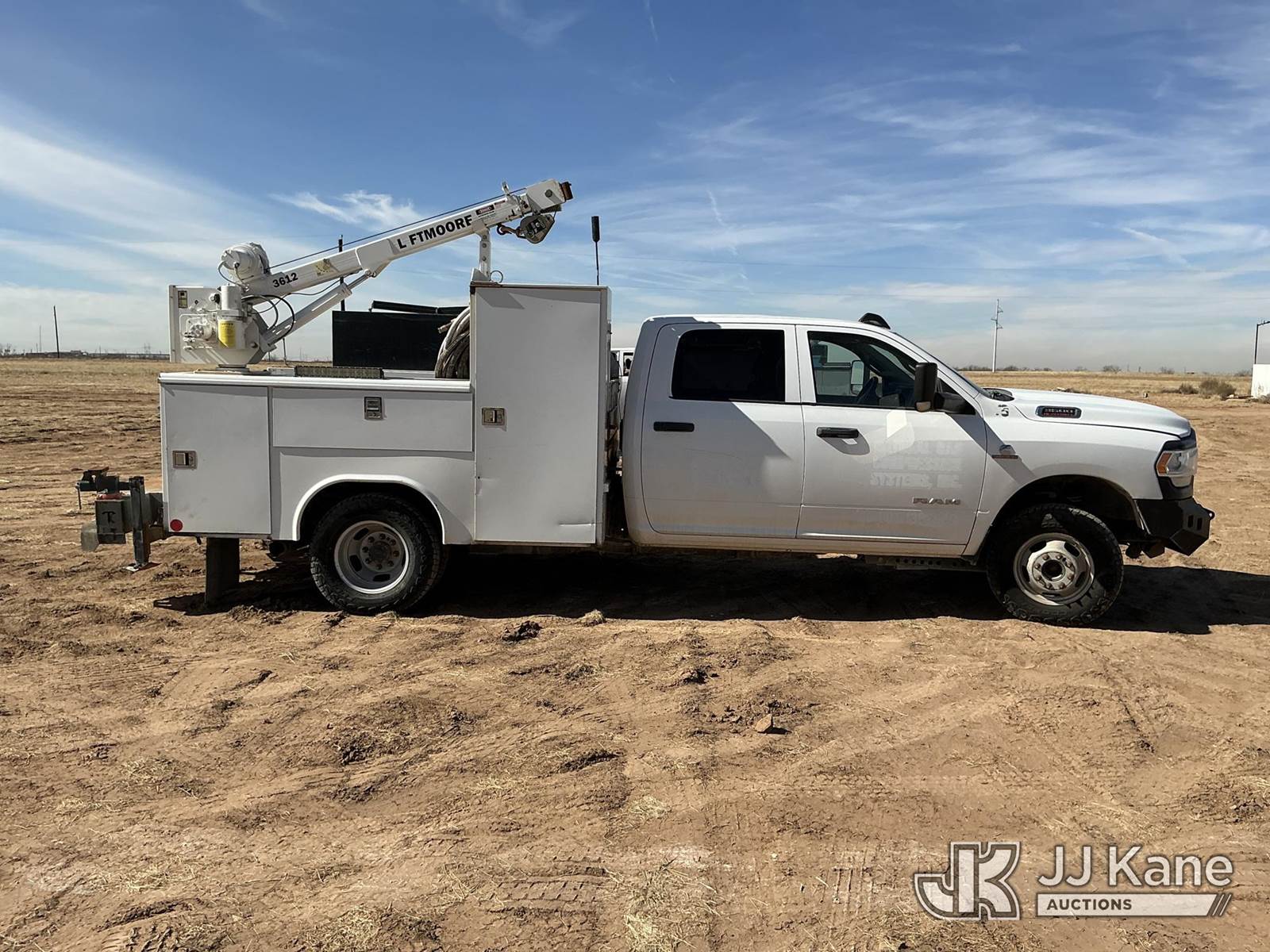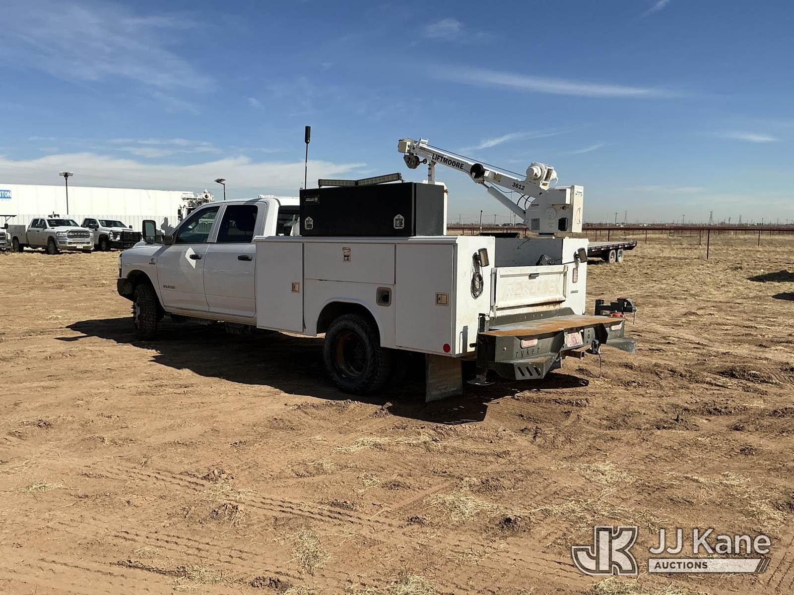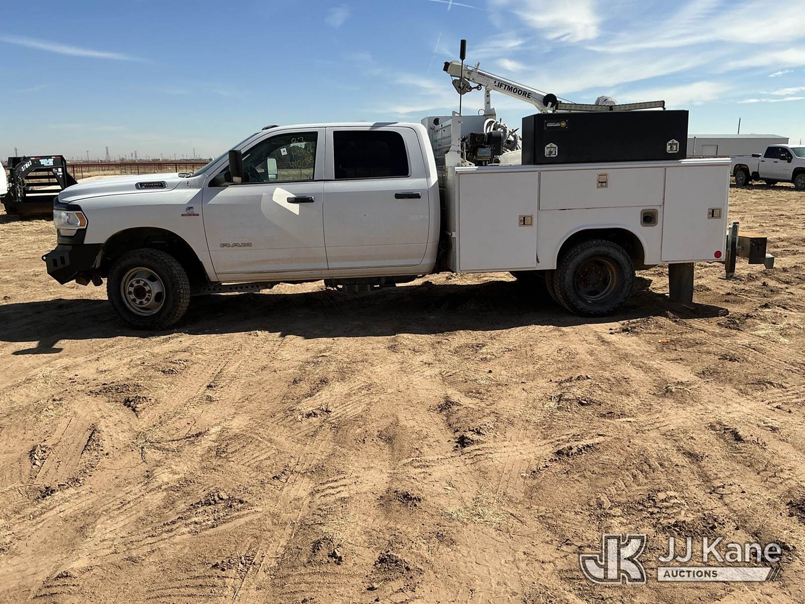 2020 RAM 3500 Crew Cab 4WD DRW Mechanics Service Truck, 6.7L L6 OHV 24V TURBO DIESEL 6-Speed Automatic, A/C, with Liftmoore 3612 Crane, Cab Mounted Power Inverter, Air Compressor, Toolbox, Vise, Spare Tire, (193,850 miles) (Runs & Moves, Upper Does Not Operate Condition Unknown)(Check Engine Light Is On, DEF System Light Is On, Windshield Is Cracked) (Reads 10,268 hours) This is a Titled Item NOTE: This unit is being sold AS IS/WHERE IS via Timed Auction and is located in Stanton, TX. For more information & removal arrangements please contact Jeremy Walters @ jeremy.walters@jjkane.com. (Buyer is responsible for removal. Assistance by consignor or JJ Kane Auctions is not assured.)