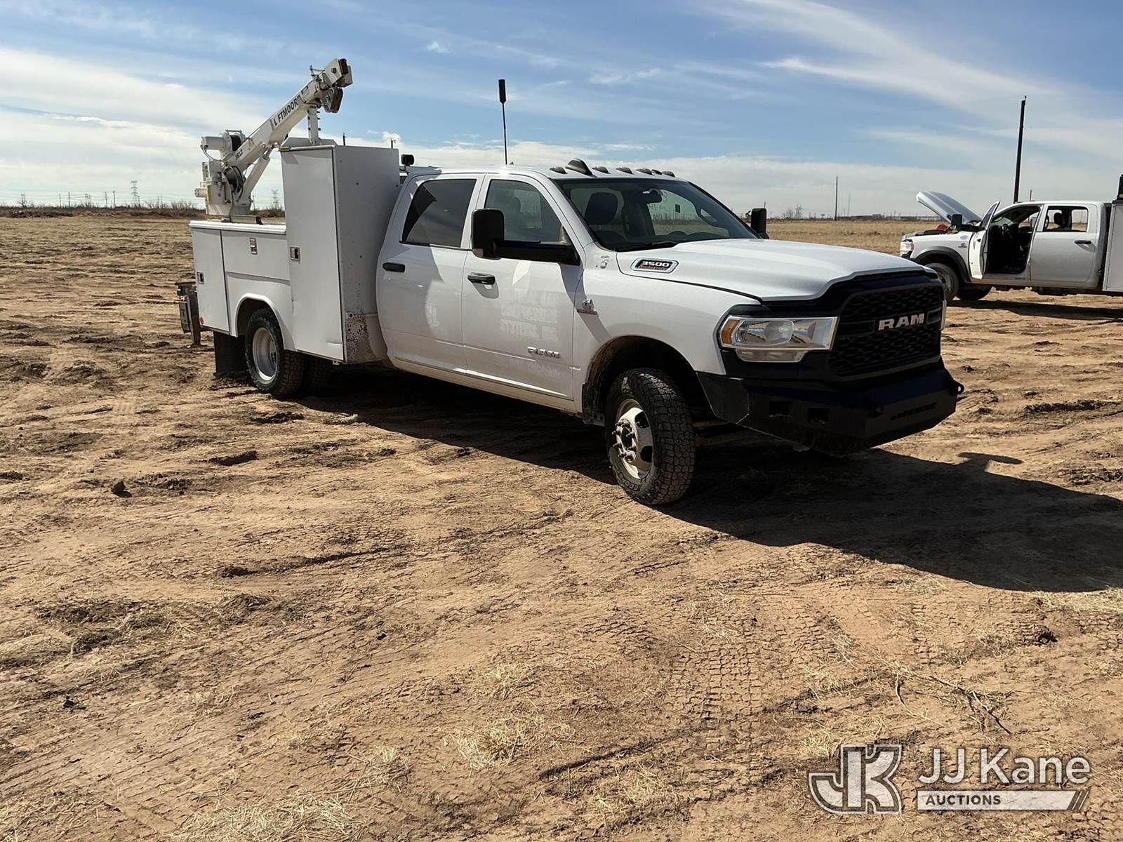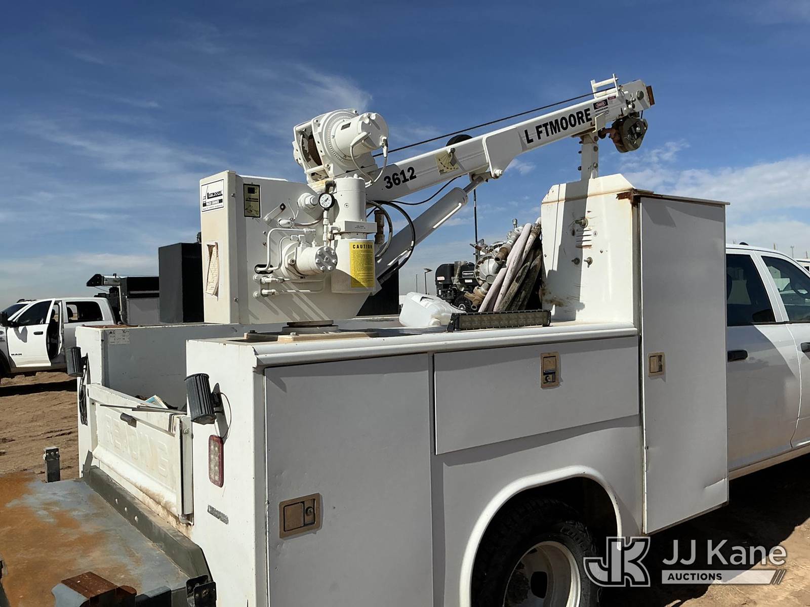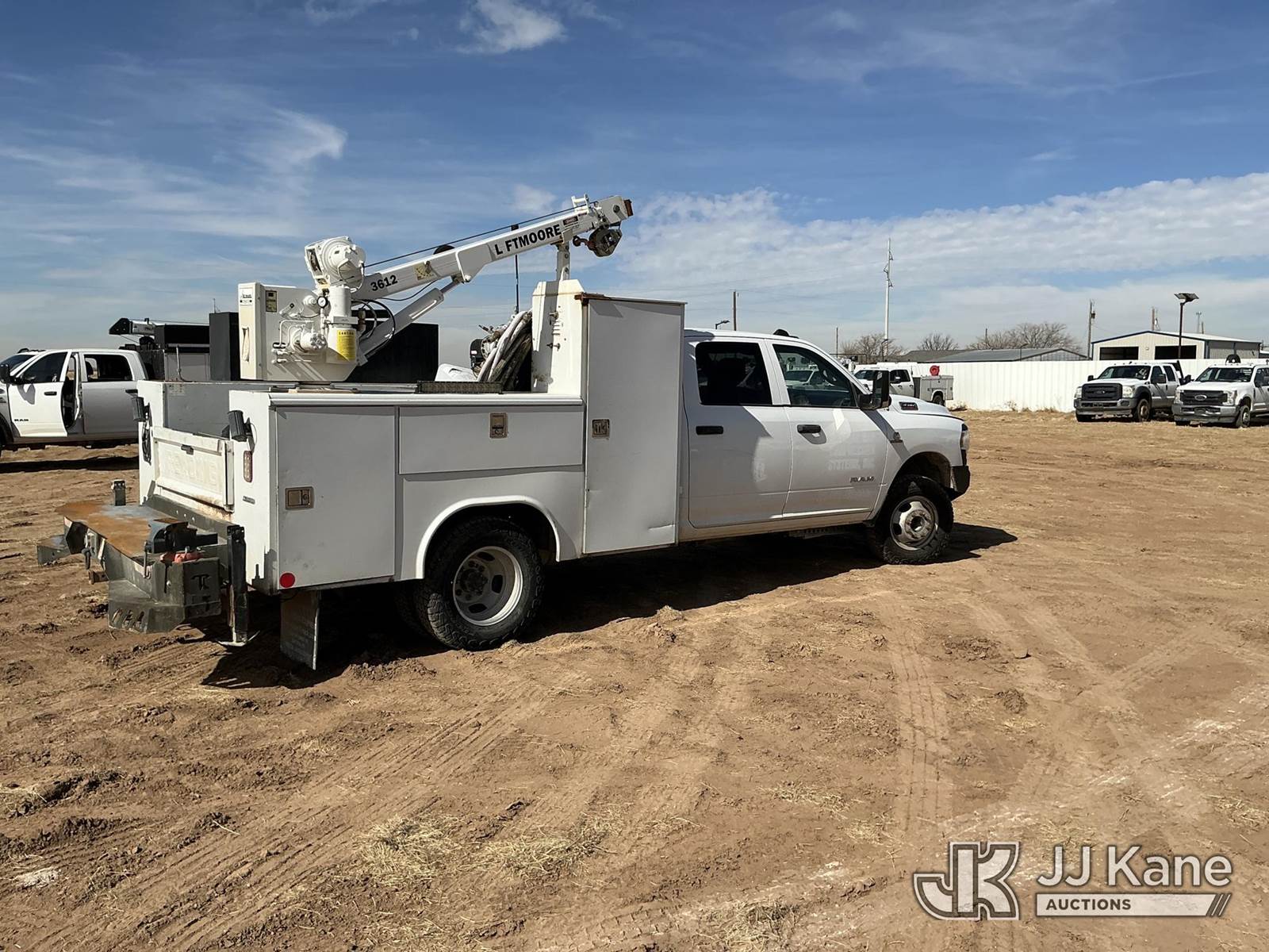2020 RAM 3500 Crew Cab 4WD DRW Mechanics Service Truck, 6.7L L6 OHV 24V TURBO DIESEL 6-Speed Automatic, A/C, with Liftmoore 3612 Crane, Cab Mounted Power Inverter, Air Compressor, Toolbox, Vise, Spare Tire, (193,850 miles) (Runs & Moves, Upper Does Not Operate Condition Unknown)(Check Engine Light Is On, DEF System Light Is On, Windshield Is Cracked) (Reads 10,268 hours) This is a Titled Item NOTE: This unit is being sold AS IS/WHERE IS via Timed Auction and is located in Stanton, TX. For more information & removal arrangements please contact Jeremy Walters @ jeremy.walters@jjkane.com. (Buyer is responsible for removal. Assistance by consignor or JJ Kane Auctions is not assured.)