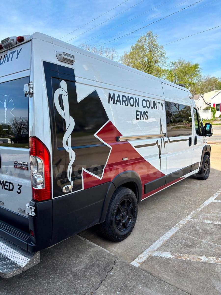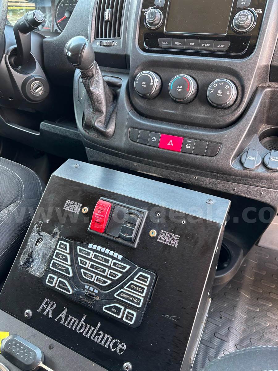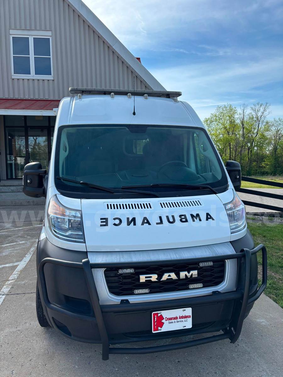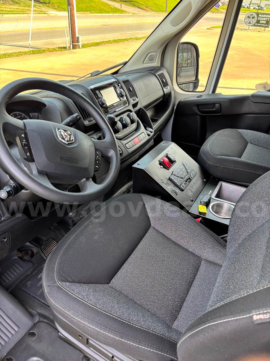 2020 RAM Promaster Ambulance, 3.6L V6. Vehicle starts, runs, and drives. Gas engine is operable. Automatic transmission is operable. Exterior is white, red, and black. No cracked glass. Interior is in good shape. AC/Heat works well. Interior height of rear compartment is 72".