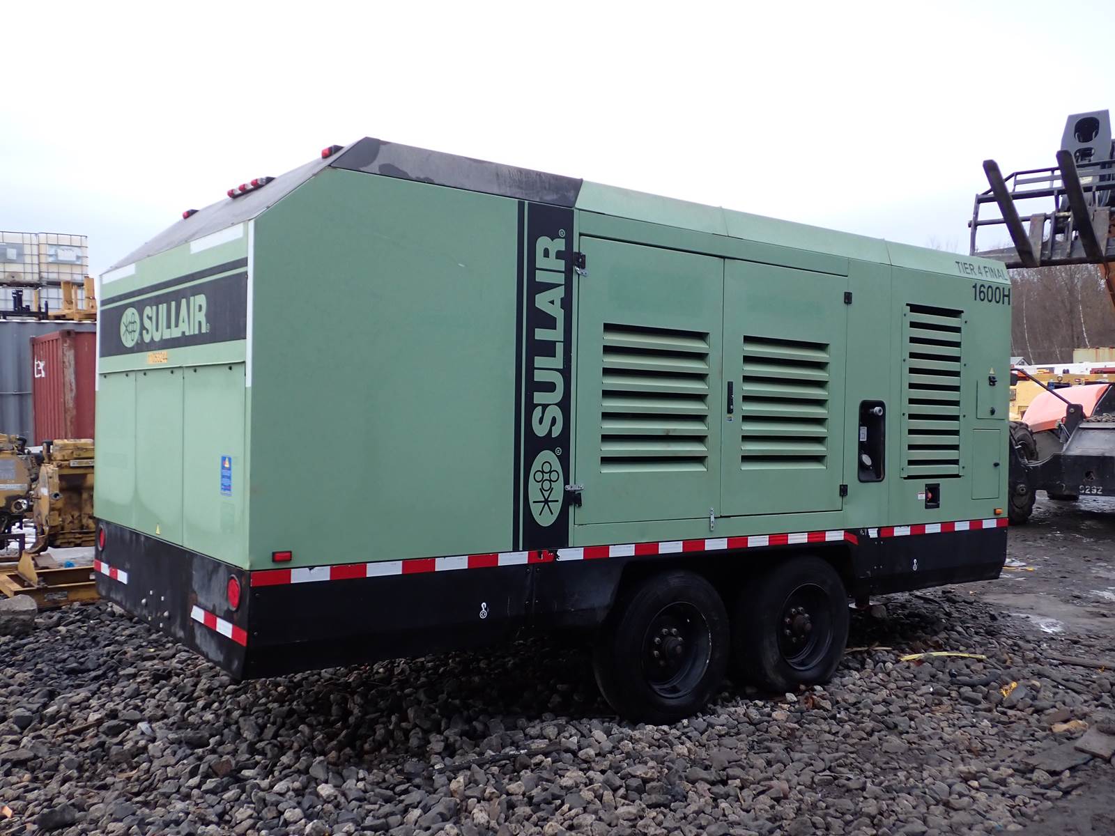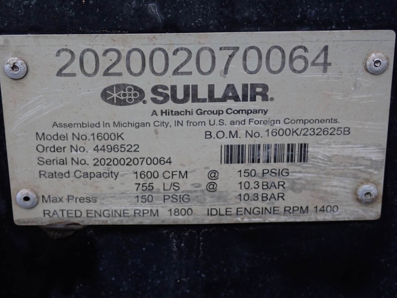 2020 Sullair 1600K air compressor, 1600H series, 1600 CFM output at 150 PSI pressure rating, high/low pressure switch, selectable, Cummins QSX/X15 turbo diesel engine, tier 4 final emissions rating, trailer mounted, towable, 3360 total hours. NICE RUNNING COMPRESSOR, SEE VIDEO. RUNS AND OPERATES, CLEAN CONDITION OVERALL -- LATE & GREAT MODEL AS PICTURED -- LOW TIME -- NICE UNIT !!