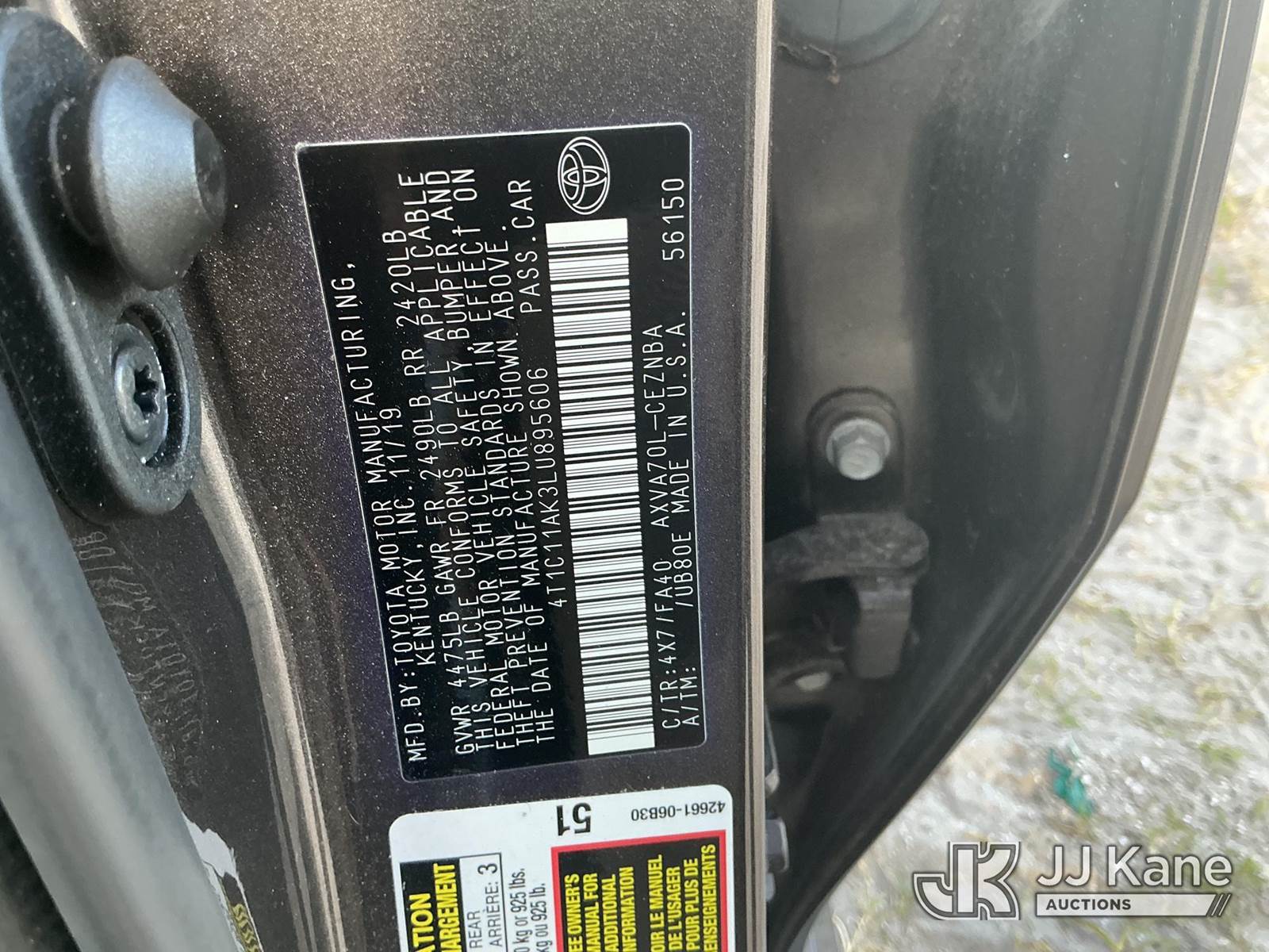 2020 Toyota Camry 4-Door Sedan, 4-cyl gas, Auto, A/C, (15,515 miles) (State of FL Unit) (Runs & Moves) (Jump To Start, Paint/Body Damage) (FL Residents Purchasing Titled Items - tax, title & registration fees will be collected at the maximum rate of $400.00 under 25,999 and $800.00 for Over 26,000 and $250.00 trailers - Proof of insurance is mandatory; Out of State Residents Purchasing Title Items - tax will be collected based upon your state rate.) (Branded Title - Police Vehicle) This is a Titled Item NOTE: This unit is being sold AS IS/WHERE IS via Timed Auction and is located in Thonotosassa, FL. Inspection & preview days for this unit are the 2 business days prior to the first day of items closing for this auction, item is located at 11720 N US 301 Thonotosassa, Fl 33592 and hours of operations are 8a-4p. For pre-sale questions, please contact Office Staff @ (813) 986-2485. (Buyer is responsible for removal. Assistance by consignor or JJ Kane Auctioneers is not assured.)