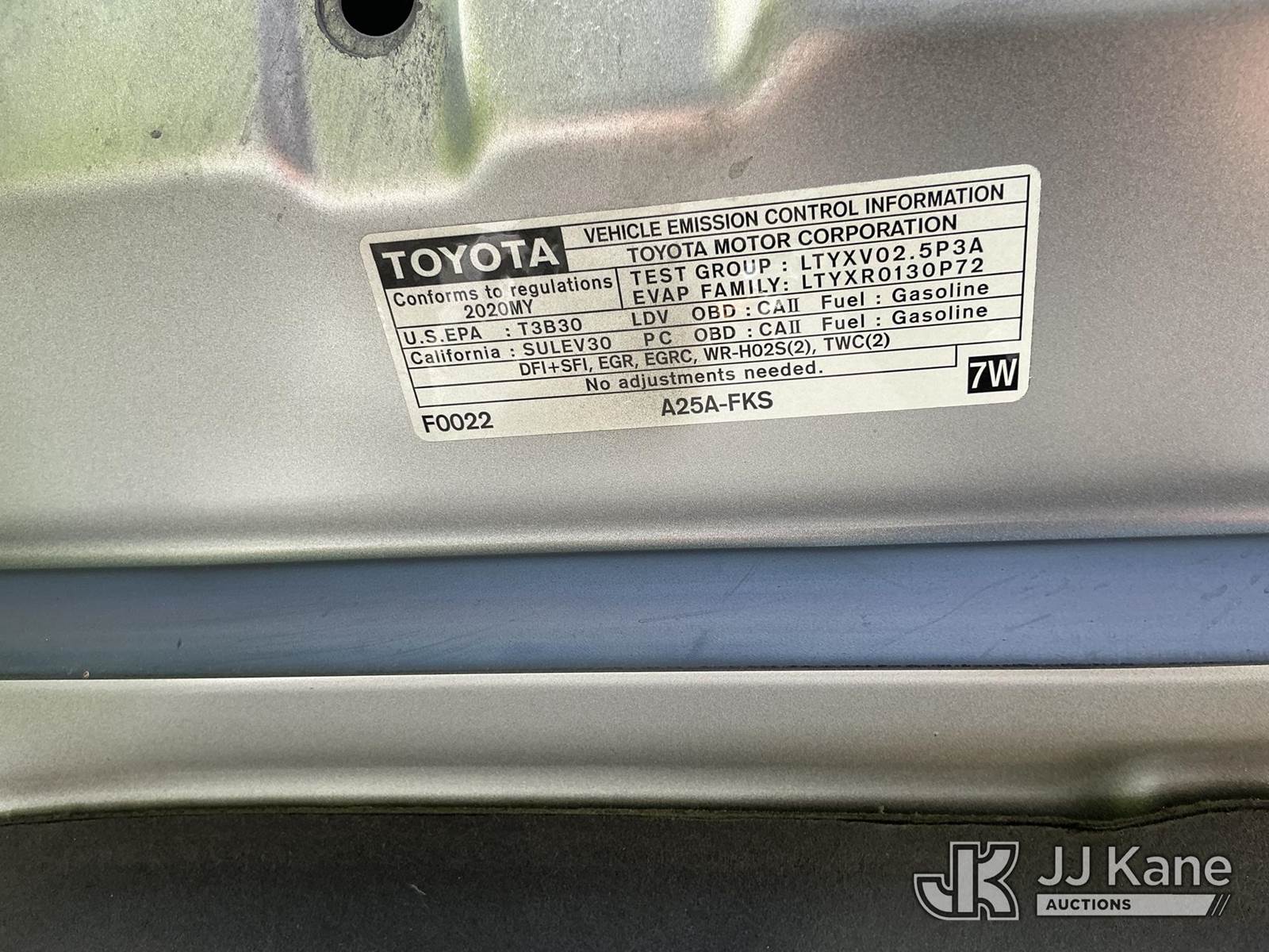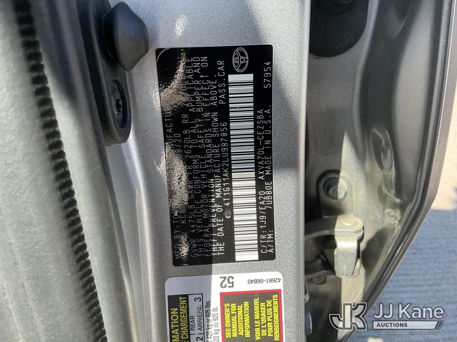 2020 Toyota Camry SE 4-Door Sedan, s/n 4T1G11AK2LU987856, 2.5L L4 DOHC 16V FWD, GAS, 8-Speed Automatic, A/C, (57,760 miles) (Runs & Moves (Vehicle previously used with a ‘cold plate’ or protected record registration. Due to the prior status, VIN may not yet appear in NMVTIS, which could affect DMV title/registration processing. Buyer acknowledges and accepts this) This is a Titled Item NOTE: This unit is being sold AS IS/WHERE IS via Timed Auction and is located in Dixon, CA. Inspection & preview days for this unit are the 2 business days prior to the first day of items closing for this auction, item is located at 8668 Sparling Ln Dixon, CA 95620 and hours of operations are 8a-4p. For pre-sale questions, please contact JJ Kane Staff at (707) 678-8060 (dixon@jjkane.com). Dealer License Number 45696. (Buyer is responsible for removal. Assistance by consignor or JJ Kane Auctions is not assured.)