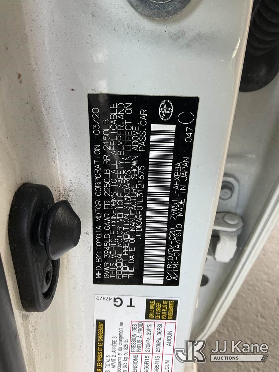 2020 Toyota Prius 4-Door Hatch Back, s/n JTDKARFU1L3121675, 1.8L L4 DOHC 16V FWD, HYBRID, Continuously Variable Transmission, A/C, (131,155 miles) (Runs & Moves) This is a Titled Item NOTE: This unit is being sold AS IS/WHERE IS via Timed Auction and is located in Jurupa Valley, CA. Inspection & preview days for this unit are the 2 business days prior to the first day of items closing for this auction, item is located at 4510 Muth Way Jurupa Valley, CA 92509 and hours of operations are 8a-4p. For pre-sale questions, please contact please contact Office Staff @ (310) 353-7140. Dealer License Number 45696. (Buyer is responsible for removal. Assistance by consignor or JJ Kane Auctions is not assured.)