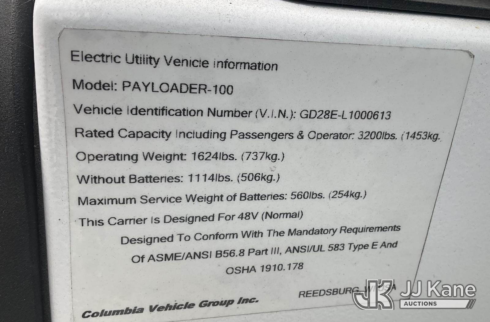 2020 Utility Cart, s/n GD28E-L1000613, Battery electric, 2020 COLUMBIA PAYLOADER100 (Does Not Start, Stripped Of Parts, Missing 3 Tires, Operation Unknown) NOTE: This unit is being sold AS IS/WHERE IS via Timed Auction and is located in Jurupa Valley, CA. Inspection & preview days for this unit are the 2 business days prior to the first day of items closing for this auction, item is located at 4510 Muth Way Jurupa Valley, CA 92509 and hours of operations are 8a-4p. For pre-sale questions, please contact please contact Office Staff @ (310) 353-7140. Dealer License Number 45696. (Buyer is responsible for removal. Assistance by consignor or JJ Kane Auctions is not assured.)