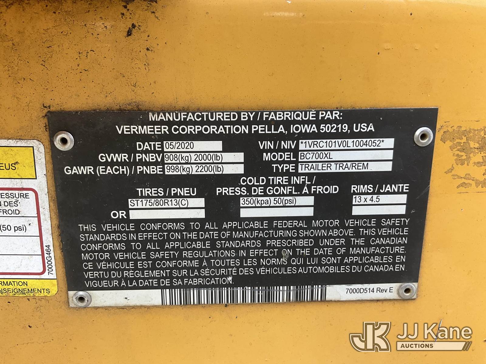 2020 Vermeer Corporation BC700XL Chipper (6in Disc), s/n 1VRC101V0L1004052, Kohler Hydrostatic, gas, (No Title) (Runs & Operates) (Body Damage) (Reads 573 hours) NOTE: This unit is being sold AS IS/WHERE IS via Timed Auction and is located in China Grove, NC. Inspection & preview days for this unit are the 2 business days prior to the first day of items closing for this auction, item is located at 820 E NC Hwy 152 China Grove, NC 28023 and hours of operations are 8a-4p. For pre-sale questions, please contact Office Staff @ (704) 674-1113. (Buyer is responsible for removal. Assistance by consignor or JJ Kane Auctioneers is not assured.)