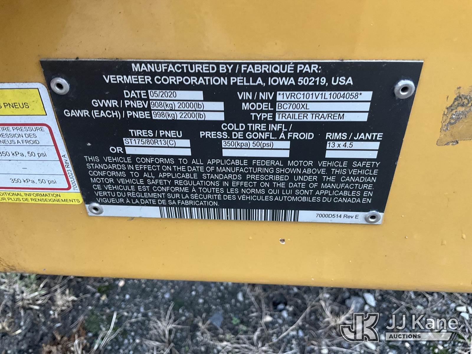 2020 Vermeer Corporation BC700XL Portable Chipper (7in Disc), s/n 1VRC101V1L1004058, gas Trailer Mtd. (No Title) (Runs) (Reads 332 hours) NOTE: This unit is being sold AS IS/WHERE IS via Timed Auction and is located in Plymouth Meeting, PA. Inspection & preview days for this unit are the 2 business days prior to the first day of items closing for this auction, item is located at 1402 Conshohocken Rd Plymouth Meeting, PA 19462 and hours of operations are 8a-4p. For pre-sale questions, please contact Bruce Thomas @ (267) 887-0392 or bruce.thomas.jr@jjkane.com. (Buyer is responsible for removal. Assistance by consignor or JJ Kane Auctioneers is not assured.)