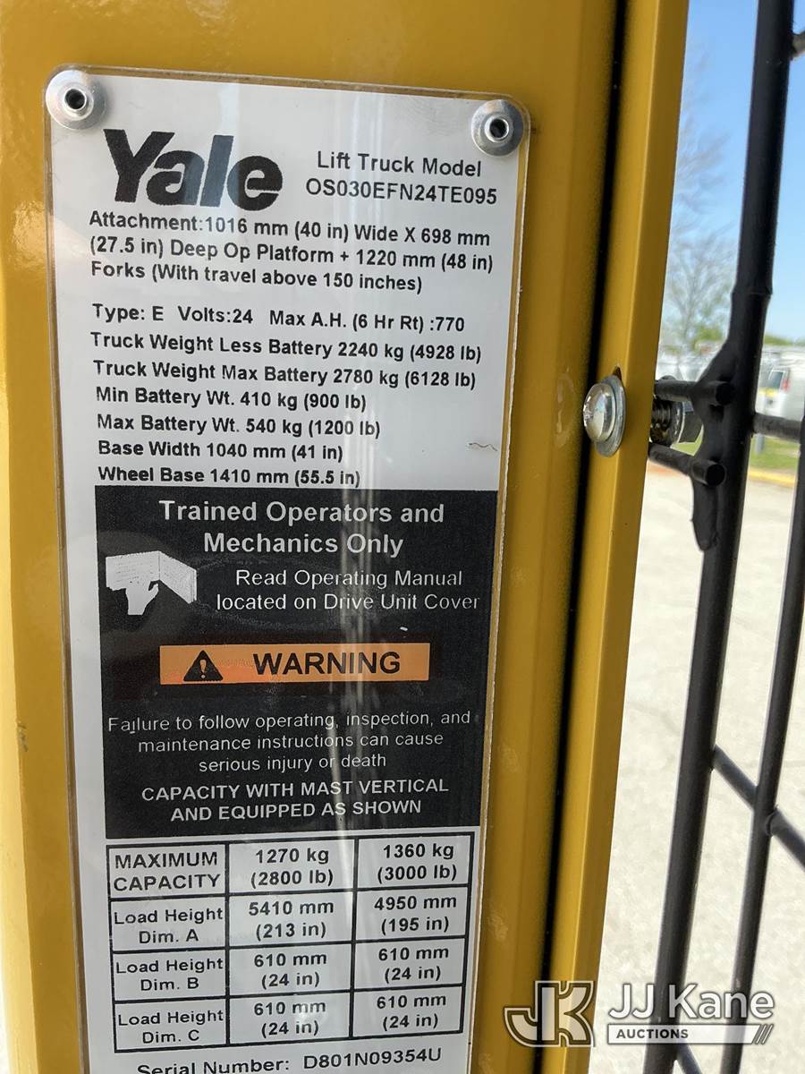 2020 Yale OS030BFN24TE Stand-Up Forklift Order Picker, s/n D801N09354U, battery powered, Hydrostatic, with Max. Capacity 3000lbs, (Runs, Moves & Operates) (Reads 394 hours) NOTE: This unit is being sold AS IS/WHERE IS via Timed Auction and is located in Kansas City, MO. Inspection & preview days for this unit are the 2 business days prior to the first day of items closing for this auction, item is located at 962 Tel Aviv Ave Kansas City, MO 64153 and hours of operations are 8a-4p. For pre-sale questions, please contact Ricky McPherson @ (816) 610-2250. (Buyer is responsible for removal. Assistance by consignor or JJ Kane Auctions is not assured.)