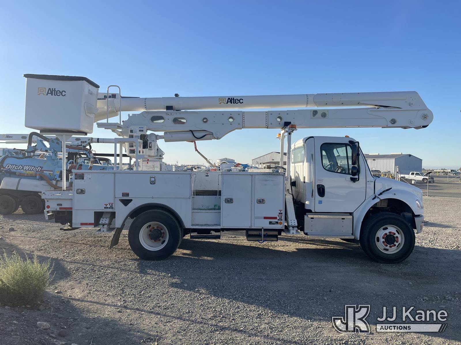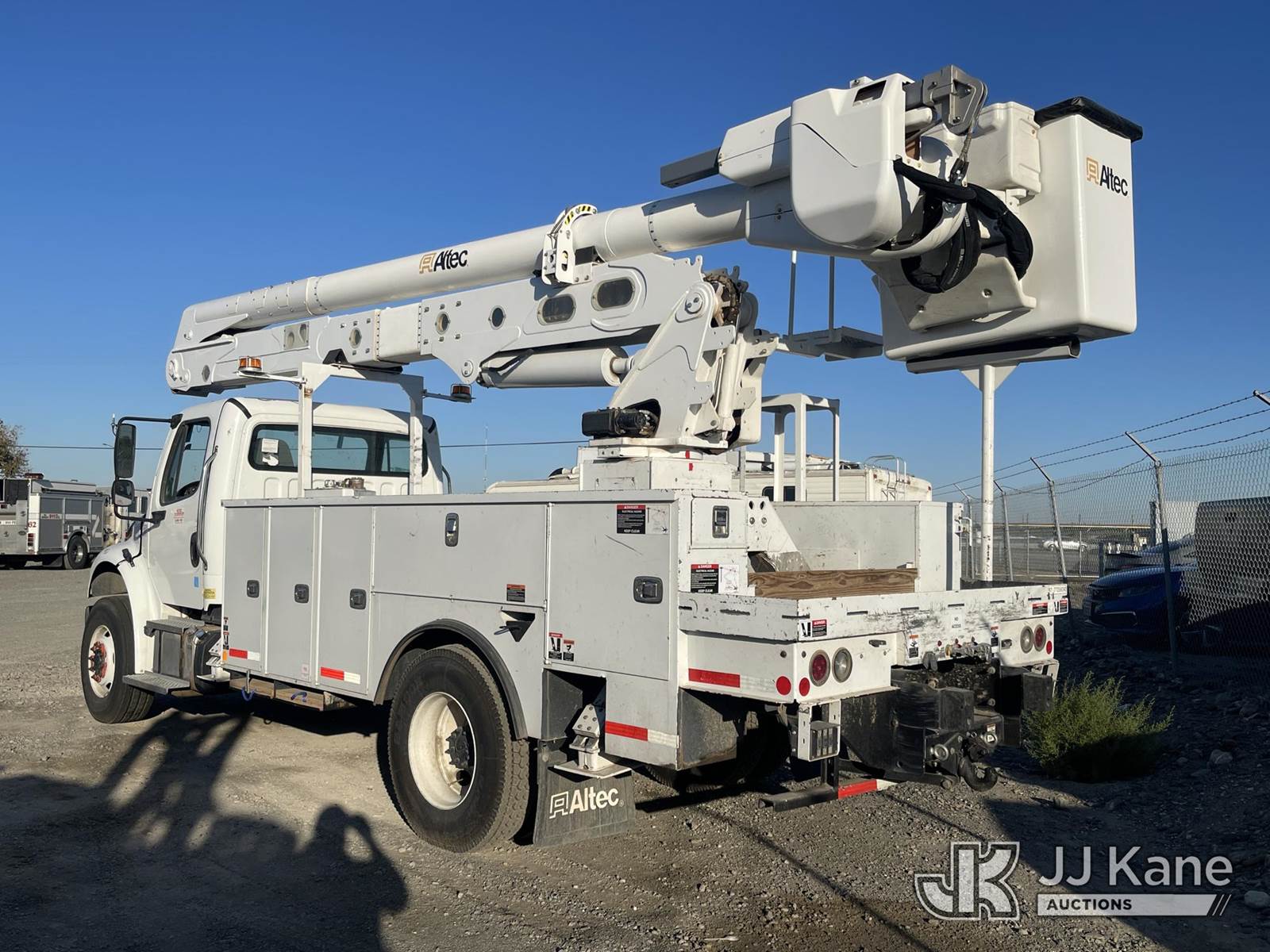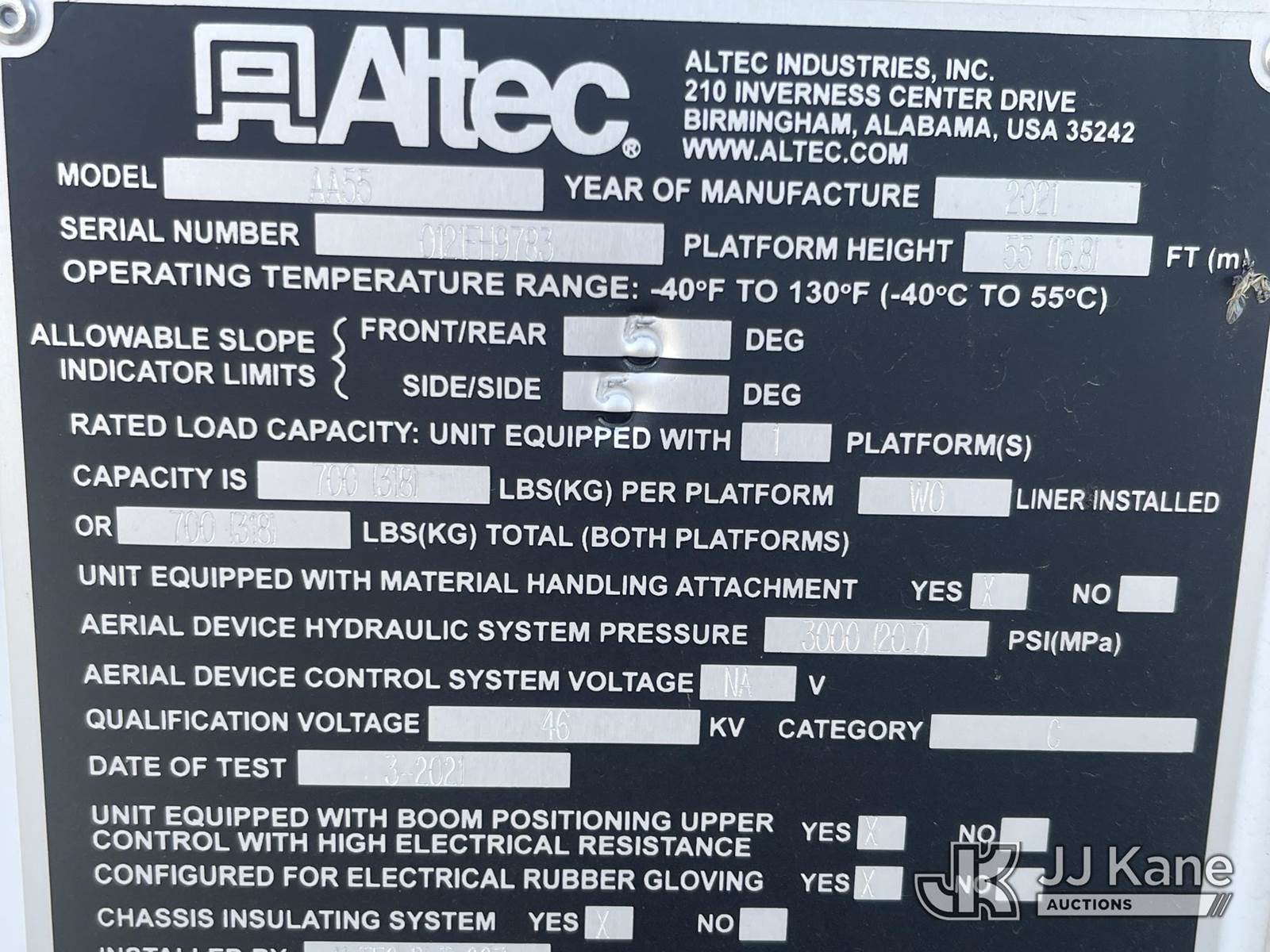 Altec AA55-MH, 59 ft, Articulating Material Handling Bucket Truck s/n 0121FH9783, with two man bucket, material handler, 4 hyd outriggers, rear mounted on 2021 Freightliner M2 106 Utility Truck, Cummins Auto, diesel, A/C, (55,320 miles) (Runs, Does Not Move, Upper Operates) (Drive Shaft Disconnected, Fan/Pulley/Belt Removed, Check Engine Light On) (Bidding Restricted to Licensed Vehicle Dealers Only), May be subject to ARB Regulations This is a Titled Item NOTE: This unit is being sold AS IS/WHERE IS via Timed Auction and is located in Dixon, CA. Inspection & preview days for this unit are the 2 business days prior to the first day of items closing for this auction, item is located at 8668 Sparling Ln Dixon, CA 95620 and hours of operations are 8a-4p. For pre-sale questions, please contact JJ Kane Staff at (707) 678-8060 (dixon@jjkane.com). Dealer License Number 45696. (Manuals provided in cab) (Buyer is responsible for removal. Assistance by consignor or JJ Kane Auctioneers is not assured.)