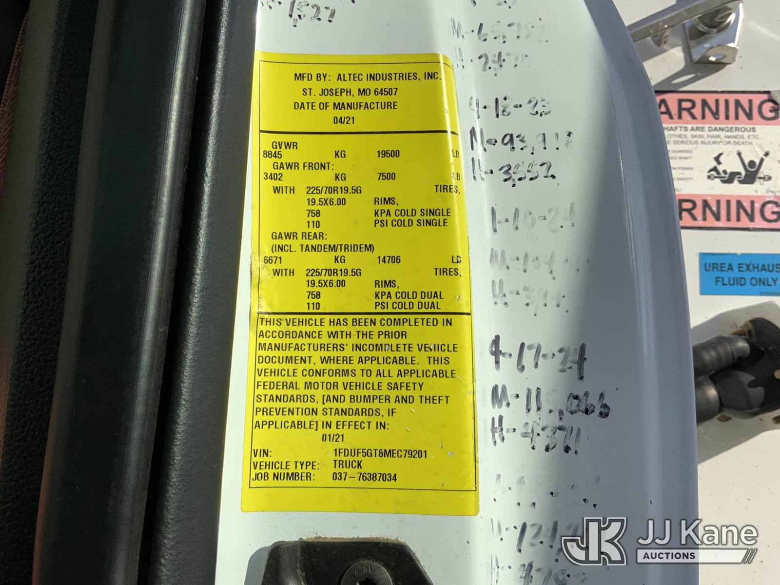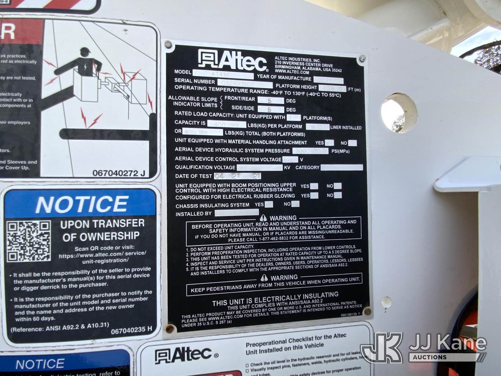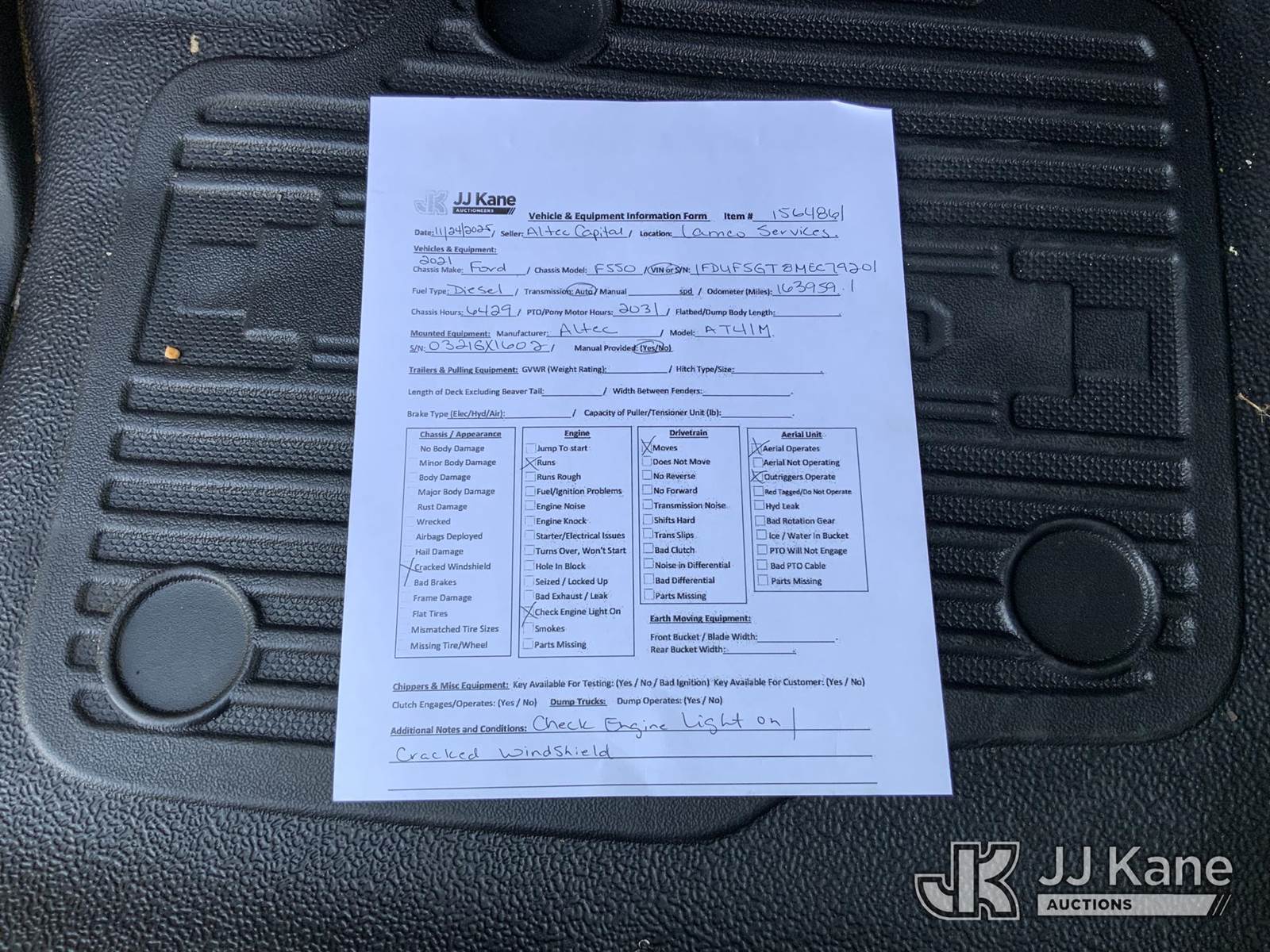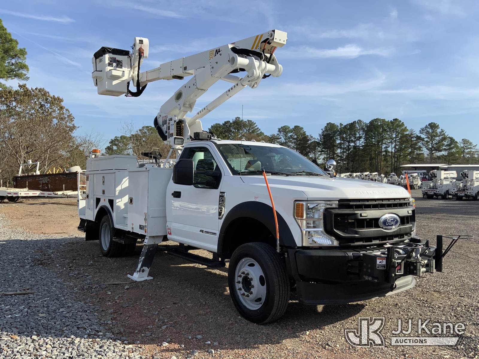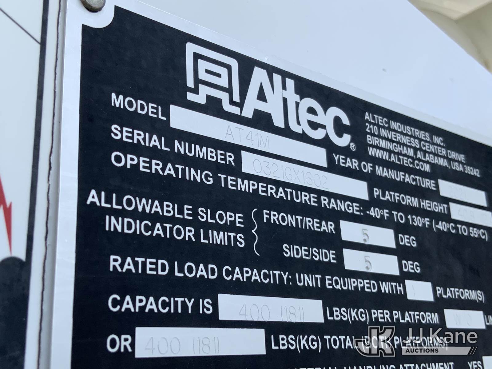 Altec AT41M, 46 ft, Articulating & Telescopic Material Handling Bucket Truck s/n 0321GX1602, with single-man bucket & 2 hyd outriggers, mounted behind cab on 2021 Ford F550 Service Truck, 6.7L V8 OHV 16V DIESEL Auto, RWD, A/C, with front winch, (163,959 miles) (Runs, Moves & Upper Operates) This is a Titled Item NOTE: This unit is being sold AS IS/WHERE IS via Timed Auction and is located in Graysville, AL. For more information & removal arrangements please contact Jarrod.Bains@JJKane.com. Alabama Auctioneer Michael Whitebread - License # 5592 (Missing manuals, See Auction Company for Manufacturers Information to obtain manuals) (Buyer is responsible for removal. Assistance by consignor or JJ Kane Auctioneers is not assured.)