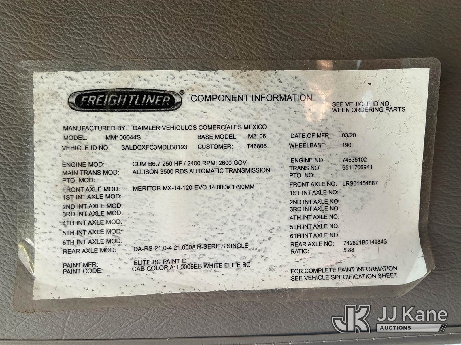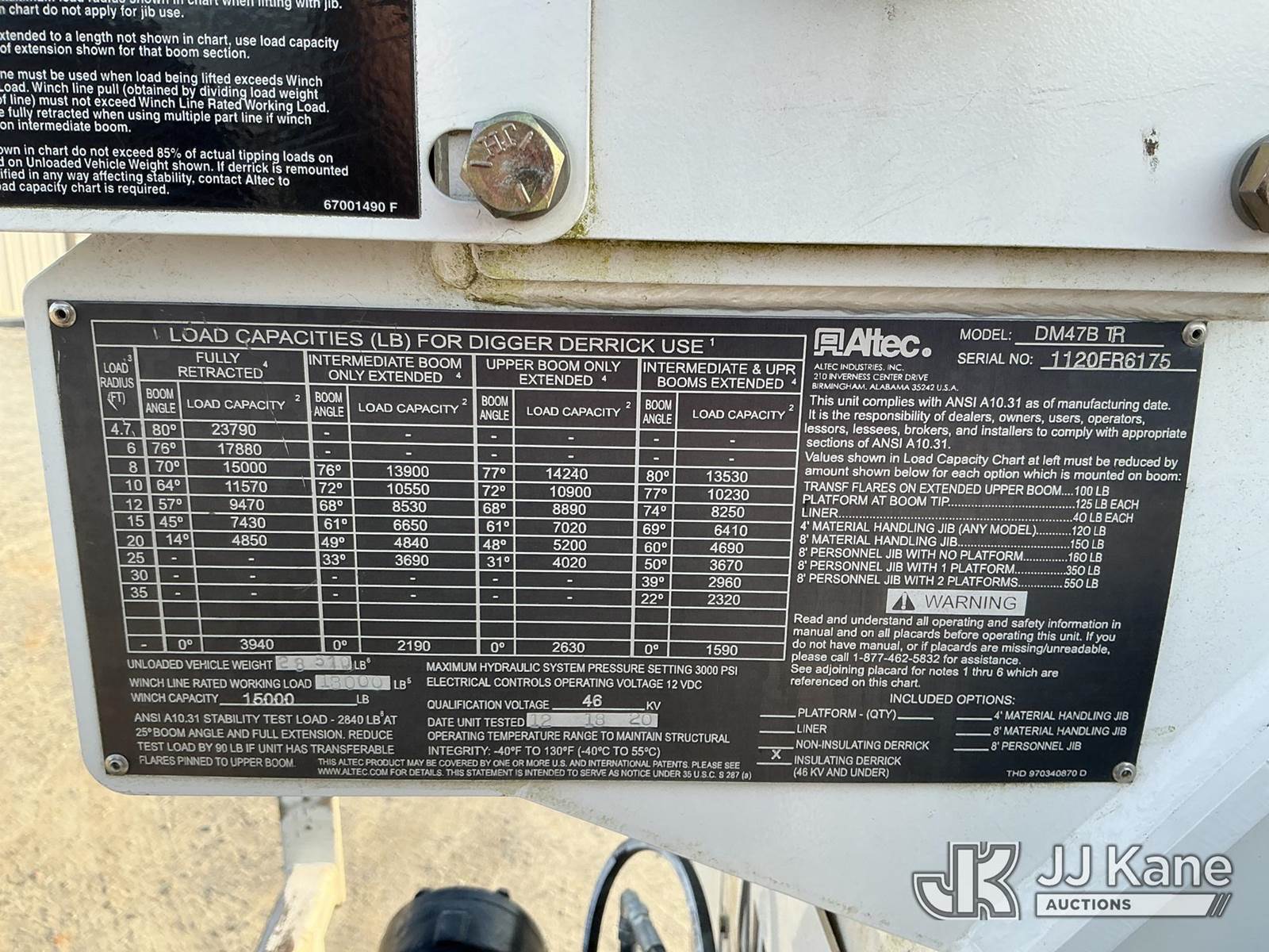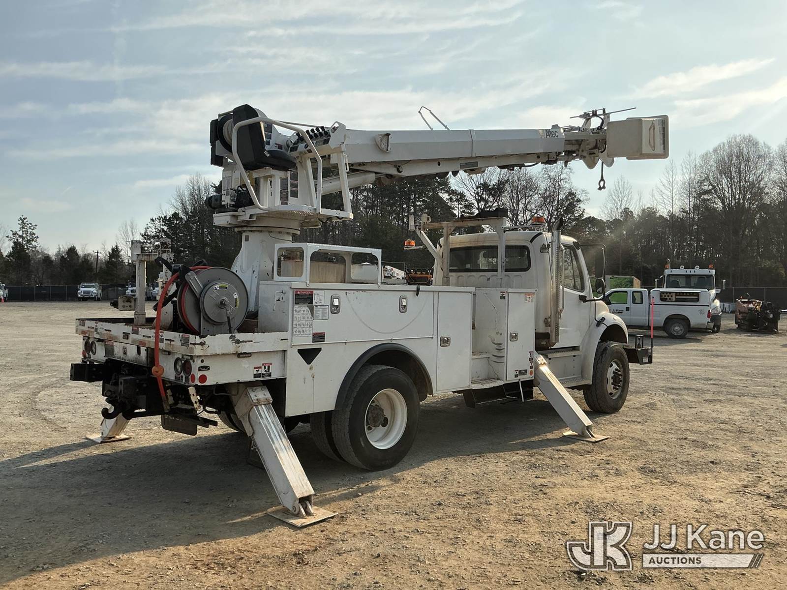 Altec DM47B-TR, 23,790 Lb Digger Derrick s/n 1120FR6175, with 47 ft sheave height, 2spd digger, heel winch, upper controls, pin on bucket, pole grabs & riding console w/ wireless remote, rear mounted on 2021 Freightliner M2 106 4x4 Utility Truck, Cummins ISB-250 6.7L diesel, Auto, A/C, with front winch , (62,257 miles) (Runs, Moves & Upper Operates ) This is a Titled Item NOTE: This unit is being sold AS IS/WHERE IS via Timed Auction and is located in China Grove, NC. Inspection & preview days for this unit are the 2 business days prior to the first day of items closing for this auction, item is located at 820 E NC Hwy 152 China Grove, NC 28023 and hours of operations are 8a-4p. For pre-sale questions, please contact Office Staff @ (704) 674-1113. (Manuals provided in cab) (Buyer is responsible for removal. Assistance by consignor or JJ Kane Auctions is not assured.)