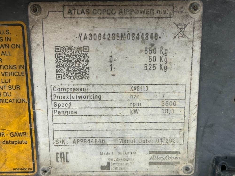 2021 ATLAS COPCO XAS110KD8 AIR COMPRESSOR, 110cfm, diesel, portable. s/n:APP844846