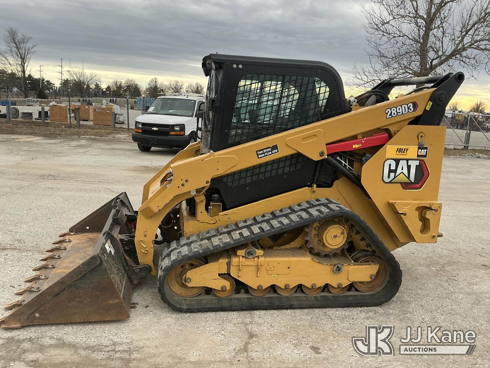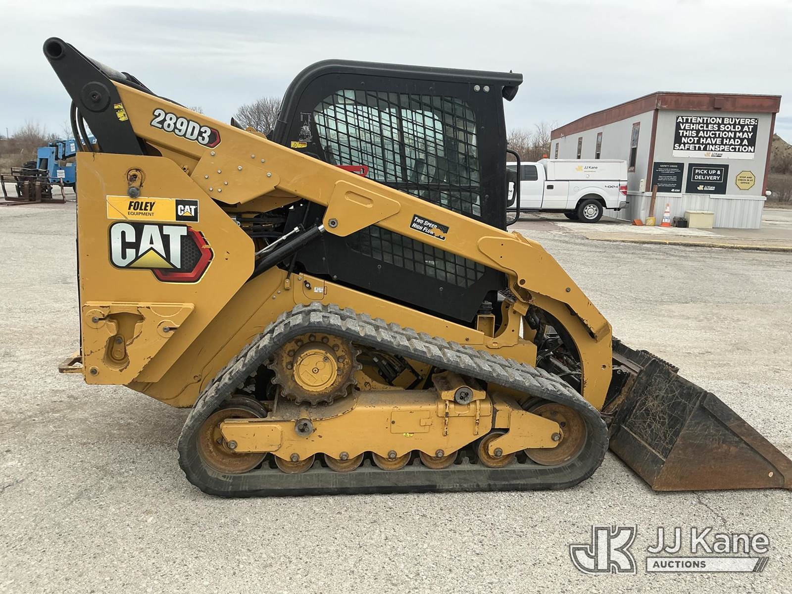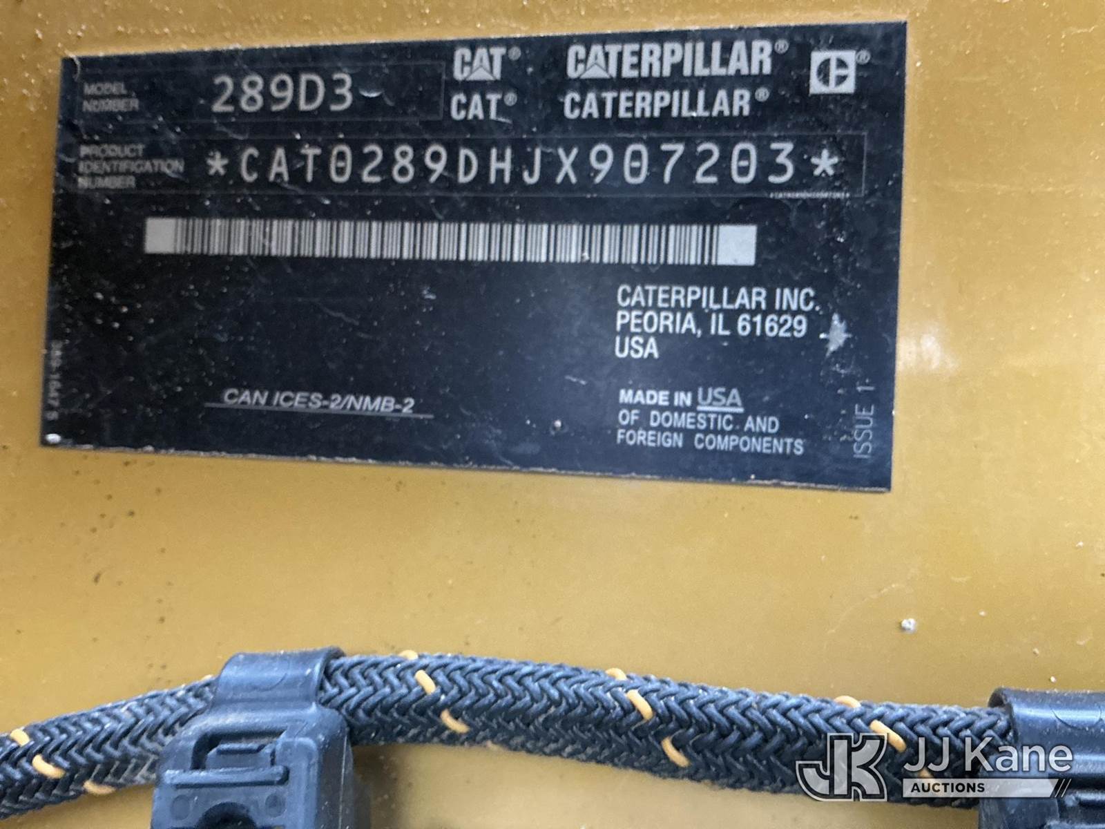 2021 Cat 289D3 Skid Steer Loader, s/n 0JX907203, Cat Hydrostatic, diesel, with GP loader bucket w/ rock teeth, aux hydraulics, rear counterweights, rubber tracks, EROPS w/ AC, (Runs, Moves & Operates) (Damage To Rear Door) (Reads 1,796 hours) NOTE: This unit is being sold AS IS/WHERE IS via Timed Auction and is located in Kansas City, MO. For more information & removal arrangements please contact Ricky McPherson @ 816-610-2250. (Buyer is responsible for removal. Assistance by consignor or JJ Kane Auctions is not assured.)