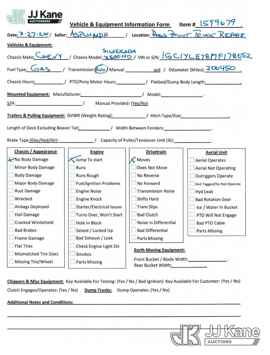 2021 Chevrolet Silverado 2500HD Crew-Cab Pickup Truck, 8-cyl gas, 4WD, Auto, A/C, (206,450 miles) (Jump to Start, Moves, Check Engine Light On) (Seller States: Transmission is out and engine died.) This is a Titled Item NOTE: This unit is being sold AS IS/WHERE IS via Timed Auction and is located in Post Falls, ID. For more information & removal arrangements please contact Jeremy Walters @ jeremy.walters@jjkane.com. (Buyer is responsible for removal. Assistance by consignor or JJ Kane Auctions is not assured.)