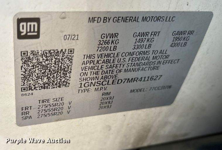 2021 Chevrolet Tahoe SUV, Miles: 97,623 on odometer, VIN: 1GNSCLEDXMR411606, Unit #: 2107, Engine, Displacement: 5.3L, Cylinders: 8, Fuel...