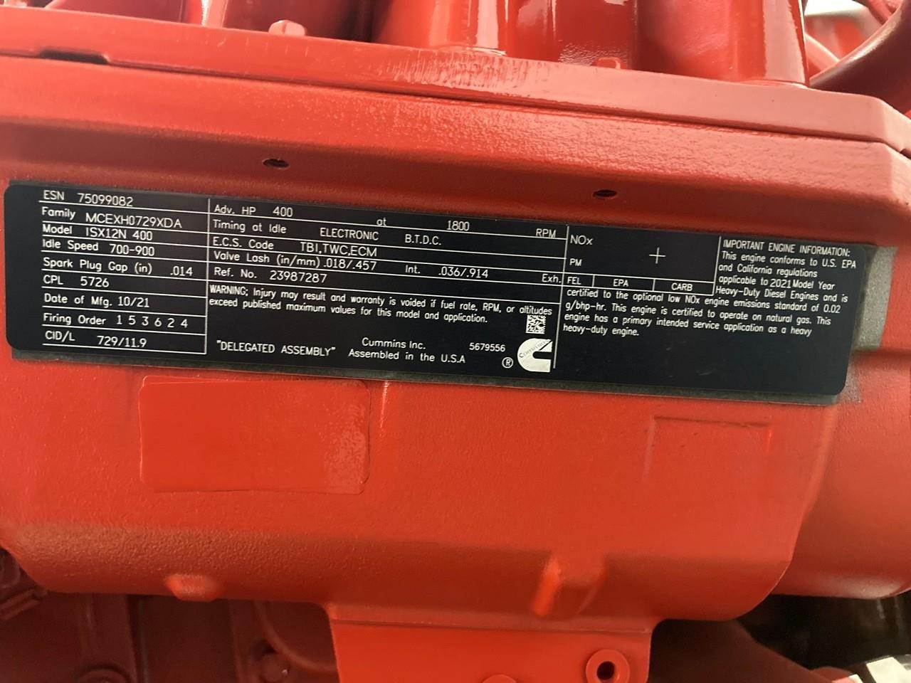 NEW 2021 CUMMINS ISX12N 400HP NATURAL GAS ENGINE FOR SALE at ADELMAN’S TRUCK PARTS in CANTON, OHIO. COMPLETE with STARTER, FLYWHEEL, and ECM (MINUS ALTERNATOR), CM2380 FUEL SYSTEM, 400 HP @ 1800 RPM, CPL # 5726, MCEXH0729XDA FAMILY #, with TBI, TWC, & ECM EMISSION CONTROL SYSTEMS.