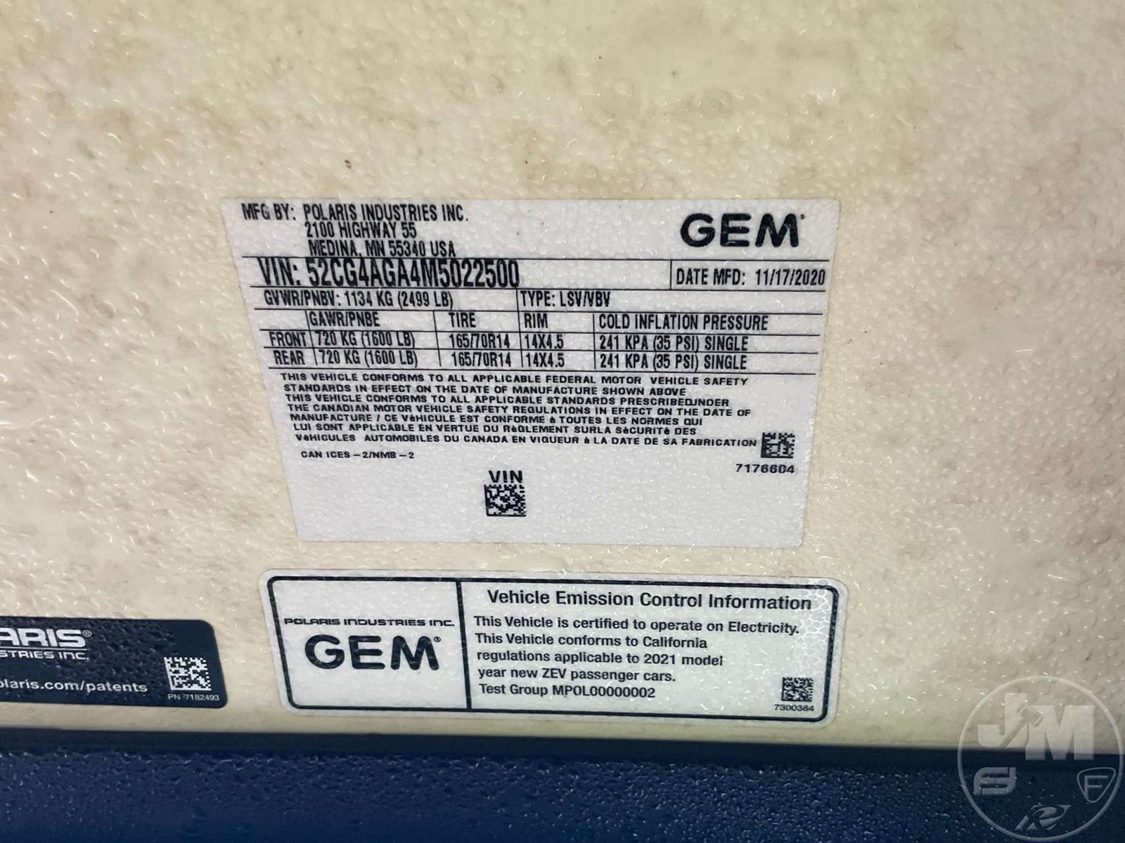 GEM GOLF CART, ELECTRIC, WHITE, 6 SEAT, WINDSHIELD, LIGHTS, ON BOARD CHARGER, DIRECT FWD, 48V AC INDUCTION MOTOR WITH 6.7HP, DELIVERING A TOP SPEED OF 25 MPH, POWER IS SUPPLIED BY A BANK OF EIGHT 6V, 224AH MAINTENANCE-FREE BATTERIES, ALL-ALUMINUM CHASSIS AND SUPERSTRUCTURE, SAFETY FEATURES INCLUDE A CERTIFIED OCCUPANT PROTECTION SYSTEM, 3-POINT SEAT BELTS, & AN AUTOMOTIVE GLASS WS, ***CHARGING CORD LOCATED AT CHECKOUT***