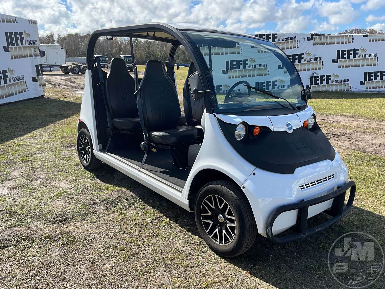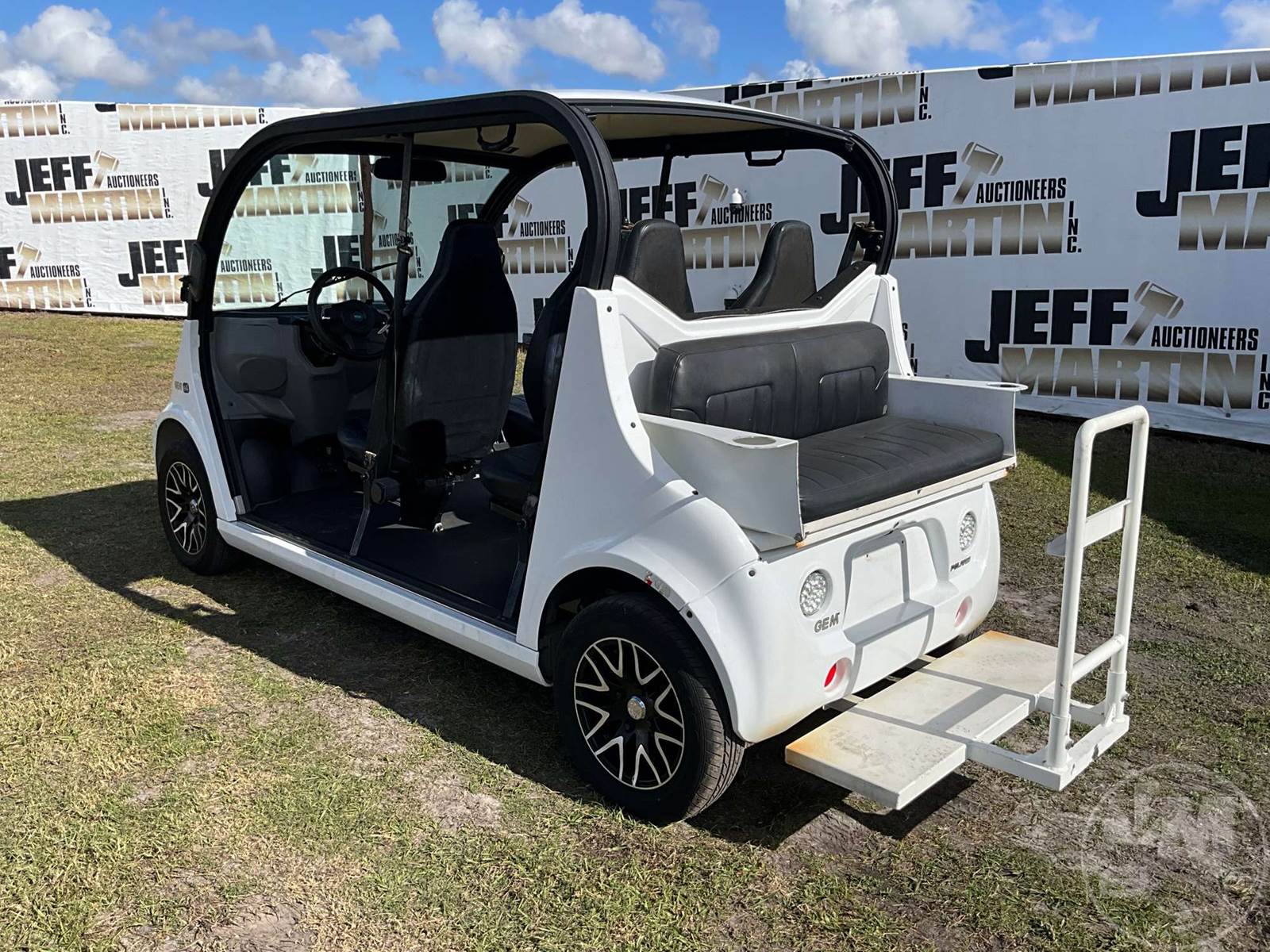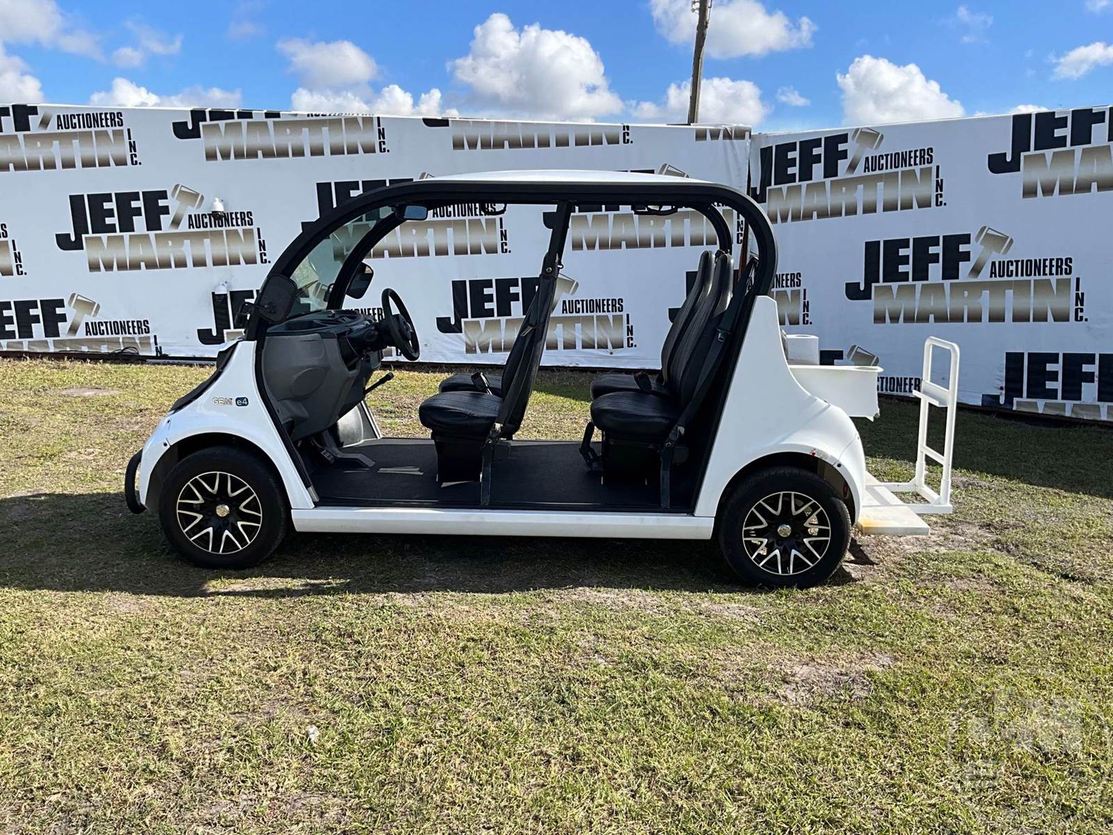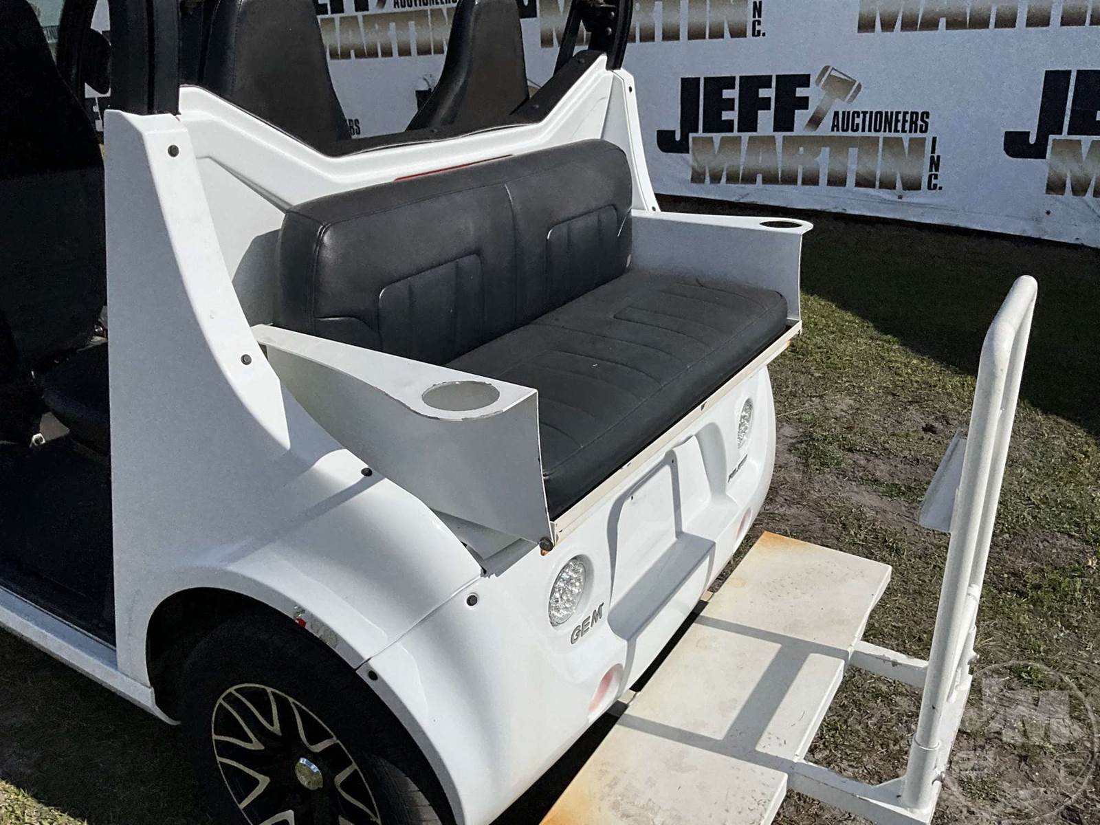 GEM GOLF CART, ELECTRIC, WHITE, 6 SEAT, CANOPY, WINDSHIELD, LIGHTS, ON BOARD CHARGER, DIRECT FWD, 48V AC INDUCTION MOTOR WITH 6.7HP, DELIVERING A TOP SPEED OF 25 MPH, POWER IS SUPPLIED BY A BANK OF EIGHT 6V, 224AH MAINTENANCE-FREE BATTERIES, ALL-ALUMINUM CHASSIS AND SUPERSTRUCTURE, SAFETY FEATURES INCLUDE A CERTIFIED OCCUPANT PROTECTION SYSTEM, 3-POINT SEAT BELTS, & AN AUTOMOTIVE GLASS WS, ODOMETER READS: 8354