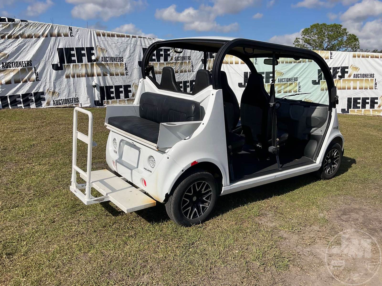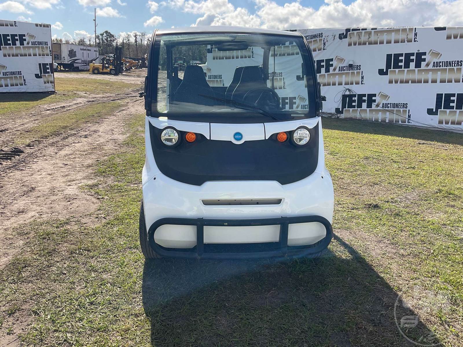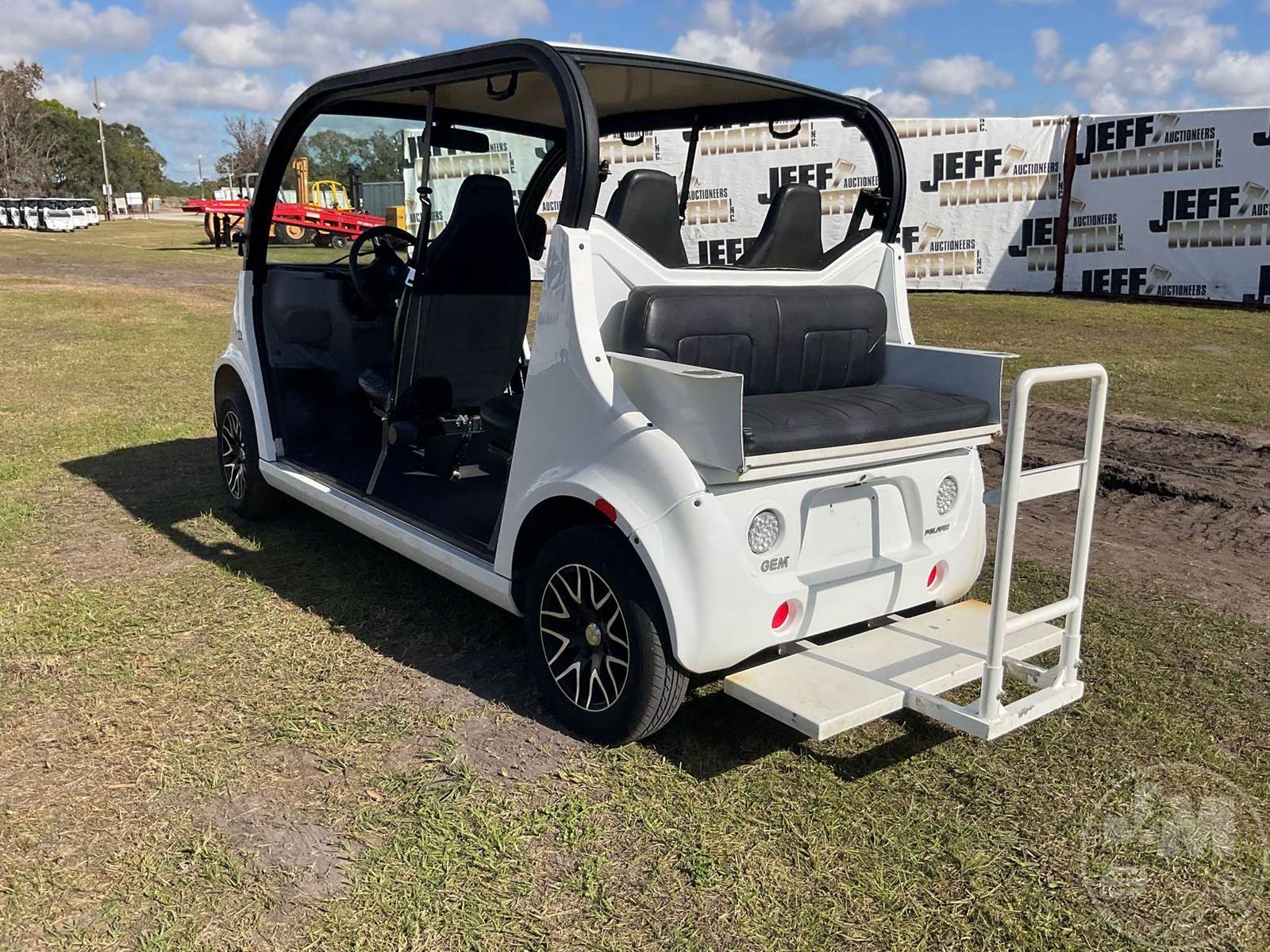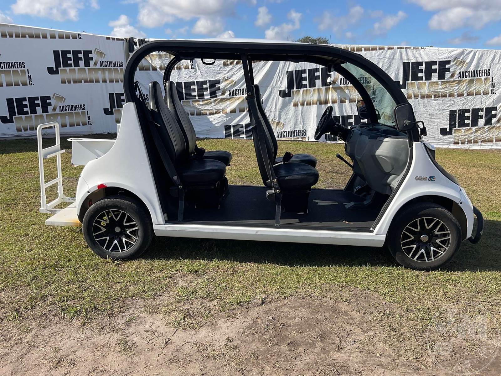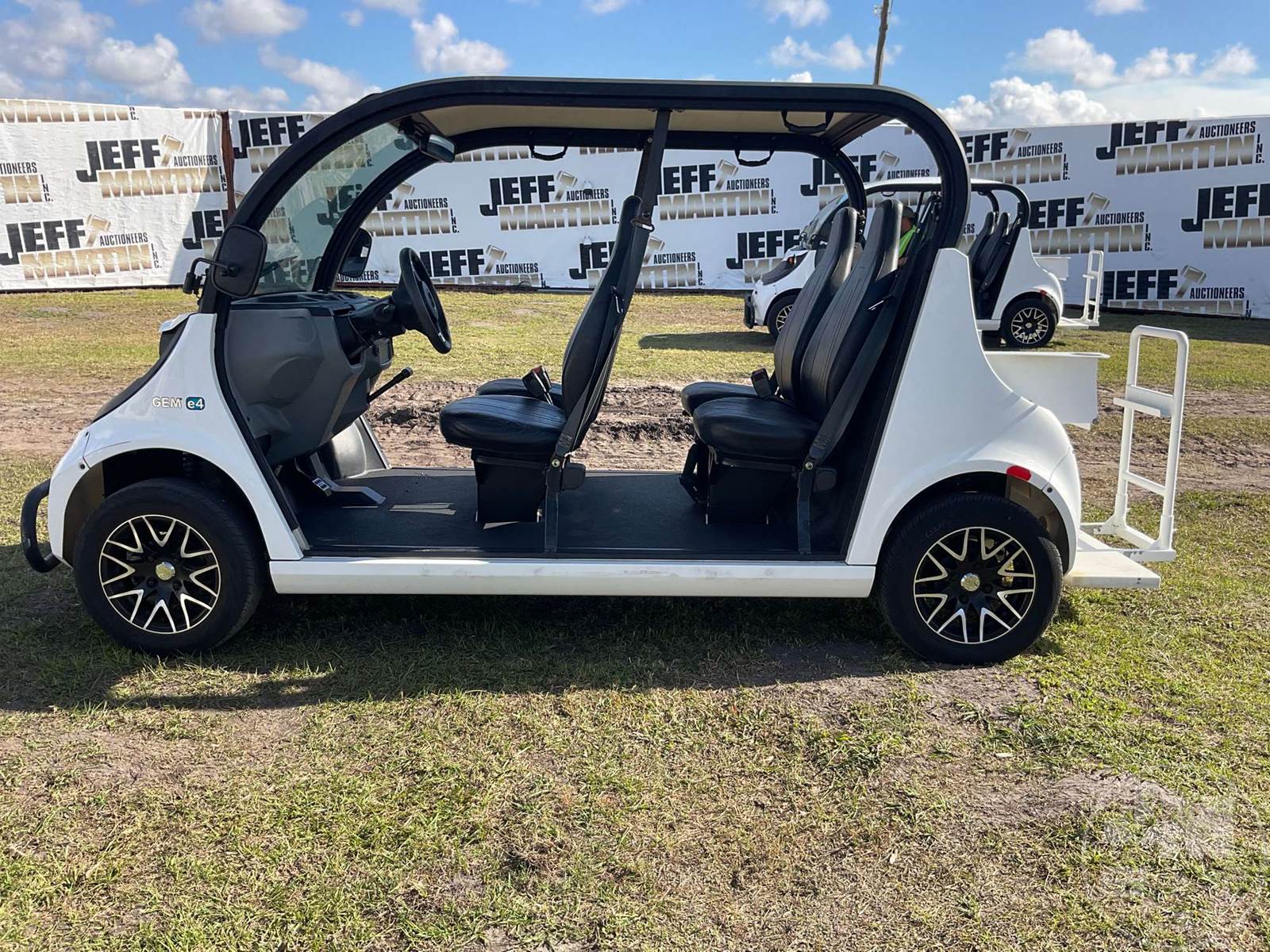 GEM GOLF CART, ELECTRIC, WHITE, 6 SEAT, CANOPY, WINDSHIELD, LIGHTS, ON BOARD CHARGER, DIRECT FWD, 48V AC INDUCTION MOTOR WITH 6.7HP, DELIVERING A TOP SPEED OF 25 MPH, POWER IS SUPPLIED BY A BANK OF EIGHT 6V, 224AH MAINTENANCE-FREE BATTERIES, ALL-ALUMINUM CHASSIS AND SUPERSTRUCTURE, SAFETY FEATURES INCLUDE A CERTIFIED OCCUPANT PROTECTION SYSTEM, 3-POINT SEAT BELTS, & AN AUTOMOTIVE GLASS WS, ODOMETER READS: 8398