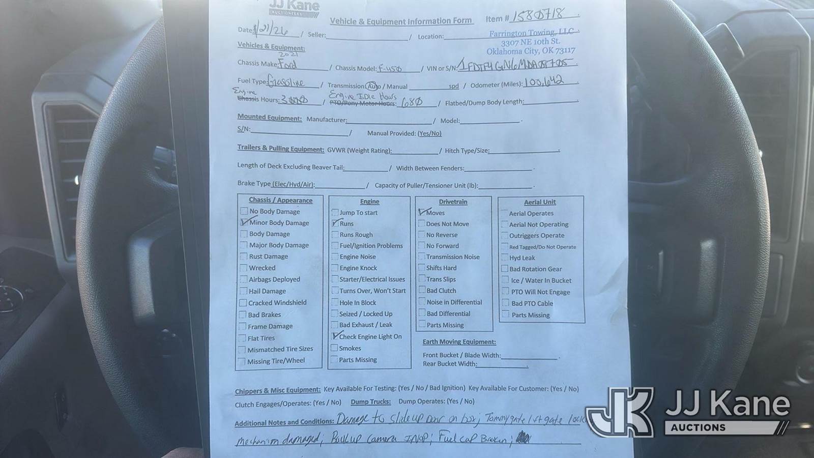 2021 Ford F-450 SD Van Body Truck, 8-cyl gas, Auto, A/C, with Liftgate, (100,642 miles) (Runs & Moves) (Check Engine Light On, Has Minor Body Damage, Damage to Rear Cargo Door, Tommy Gate Locking Mechanism Damaged, Back Up Camera Inoperable, Fuel Cap Broken) This is a Titled Item NOTE: This unit is being sold AS IS/WHERE IS via Timed Auction and is located in Oklahoma City, OK. Inspection & preview days for this unit are the 2 business days prior to the first day of items closing for this auction, item is located at 820 E NC Hwy 152 China Grove, NC 28023 and hours of operations are 8a-4p. For pre-sale questions, please contact Office Staff @ (704) 674-1113. (Buyer is responsible for removal. Assistance by consignor or JJ Kane Auctions is not assured.)