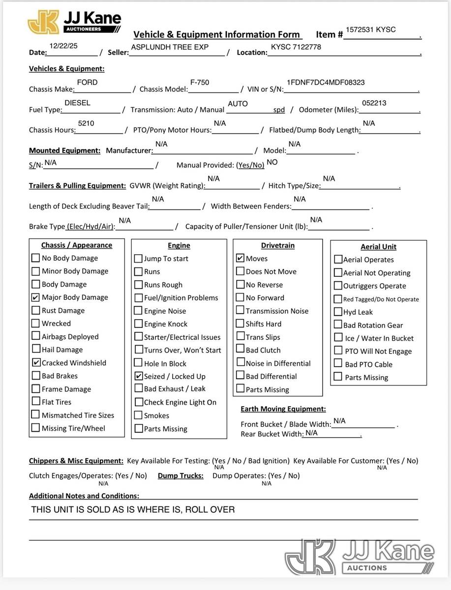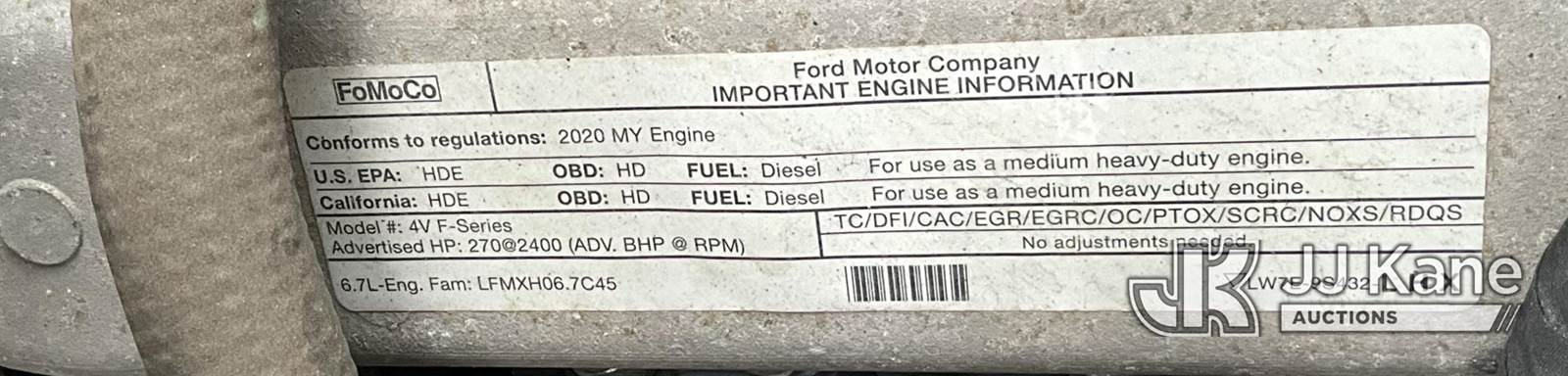 2021 Ford F-750 Flatbed/Utility Truck, 6.7L V8 diesel, Auto, 4X2, (52,213 miles) (Wrecked, Not Running, Truck Rolled Over, Engine Seized/ Locked Up, Condition Unknown, Cracked Windshield) (Former Bucket Truck, Boom Removed) This is a Titled Item NOTE: This unit is being sold AS IS/WHERE IS via Timed Auction and is located in Elizabethtown, KY. Inspection & preview days for this unit are by appointment only; please contact us at contact@jjkane.com or 84-Go-JJKane for more details. Kentucky Auctioneer Michael Whitebread - License # 256617 (Buyer is responsible for removal. Assistance by consignor or JJ Kane Auctions is not assured.)