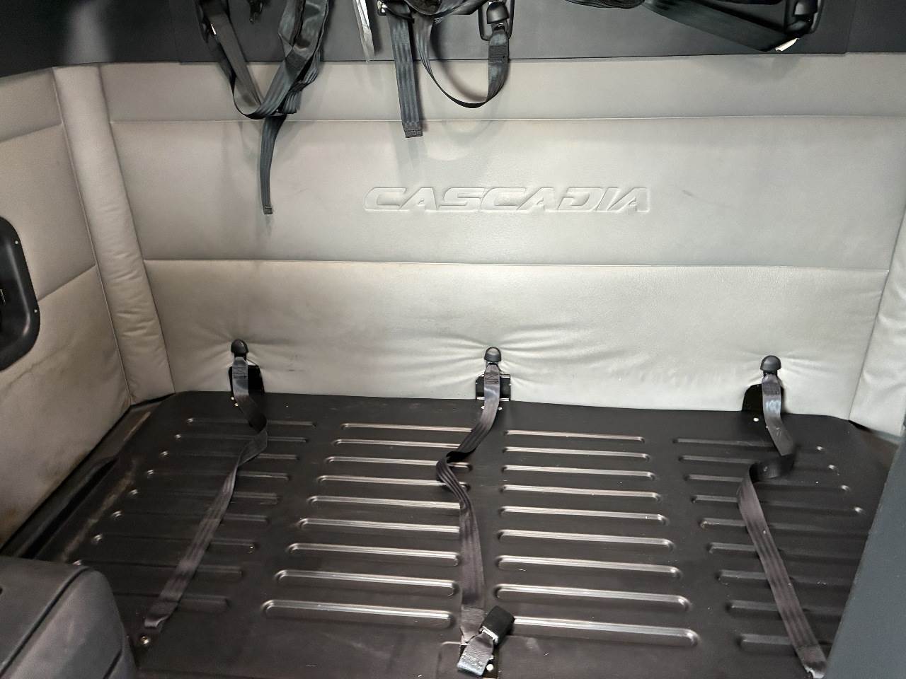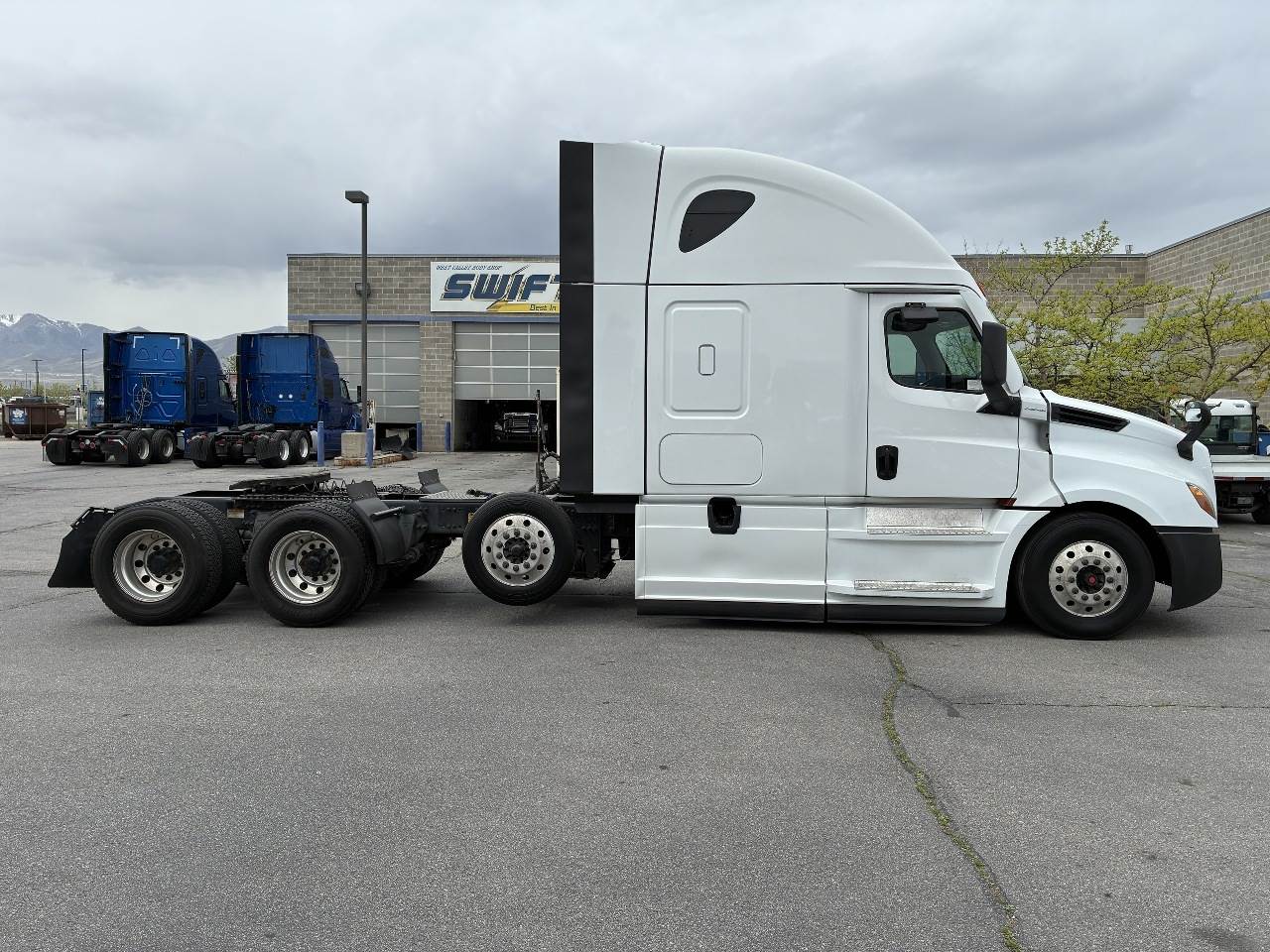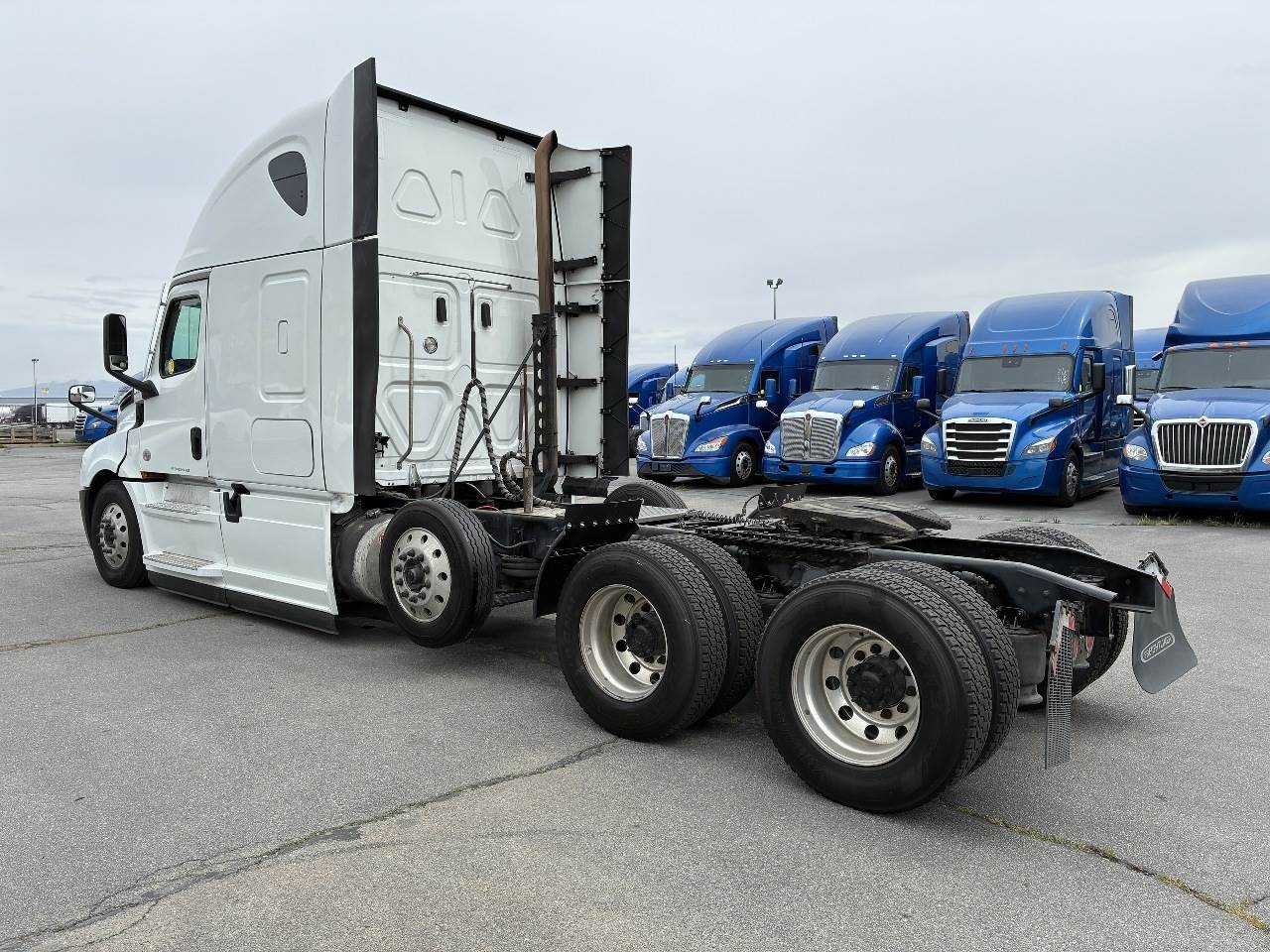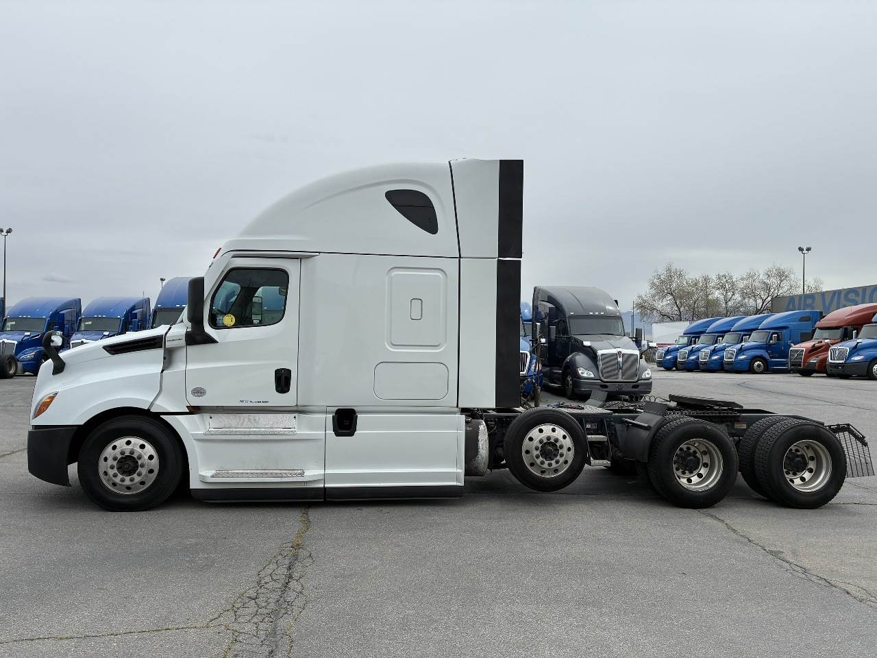 2021 Freightliner Cascadia 126 double bunk sleeper with drop axle - multiple units available, all equipped with a Detroit DD15 14.8 L 455 HP engine with engine brake paired with a Detroit DT12 1750 OH1 HD 12 speed automatic transmission and a Meritor 3.25 rear axle ratio. These trucks feature a tri axle configuration with a pusher drop axle. Steer axle is rated at 13,300 pounds on the front axle and 40,000 pounds on the rear axles with a 64,320 pound GVWR. Each unit includes dual aluminum fuel tanks totaling 200 gallons, a vertical exhaust, a steel frame, air ride suspension, and a 269 inch wheelbase. They are equipped with aluminum wheels and 295 75R22.5 tires along with an air slide fifth wheel. The 72 inch sleeper includes dual bunks, gray and black interior, dual high back seats with an air ride passenger seat, dual power mirrors, operational air conditioning, an AM FM Bluetooth radio, and Espar bunk heaters. Additional equipment includes heated mirrors, full fairings, and collision avoidance. The exterior is white with a painted bumper