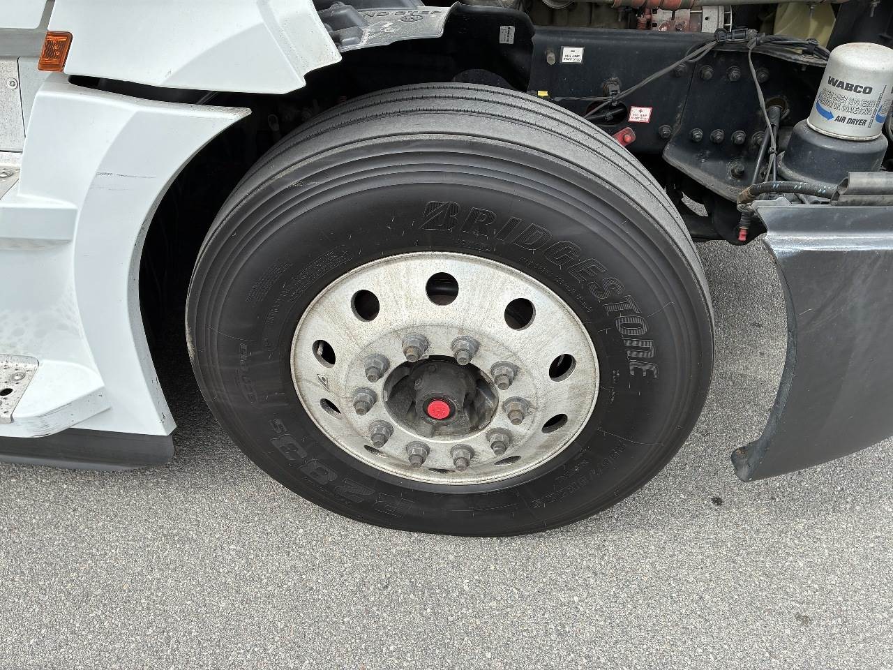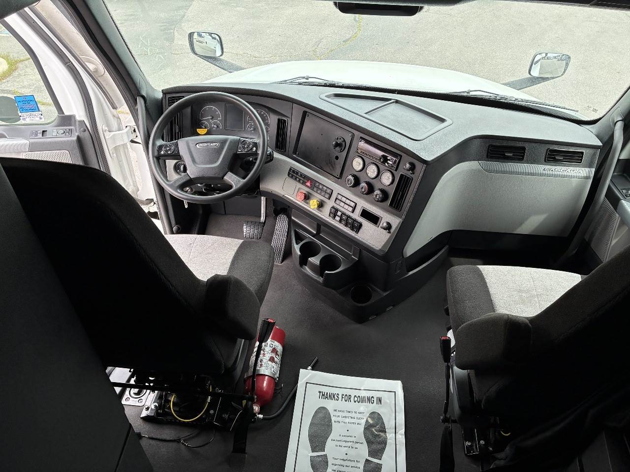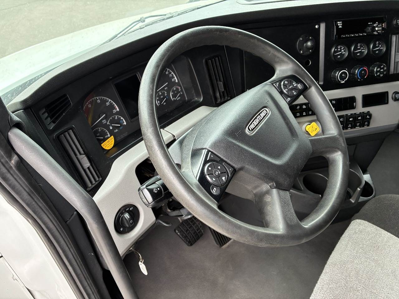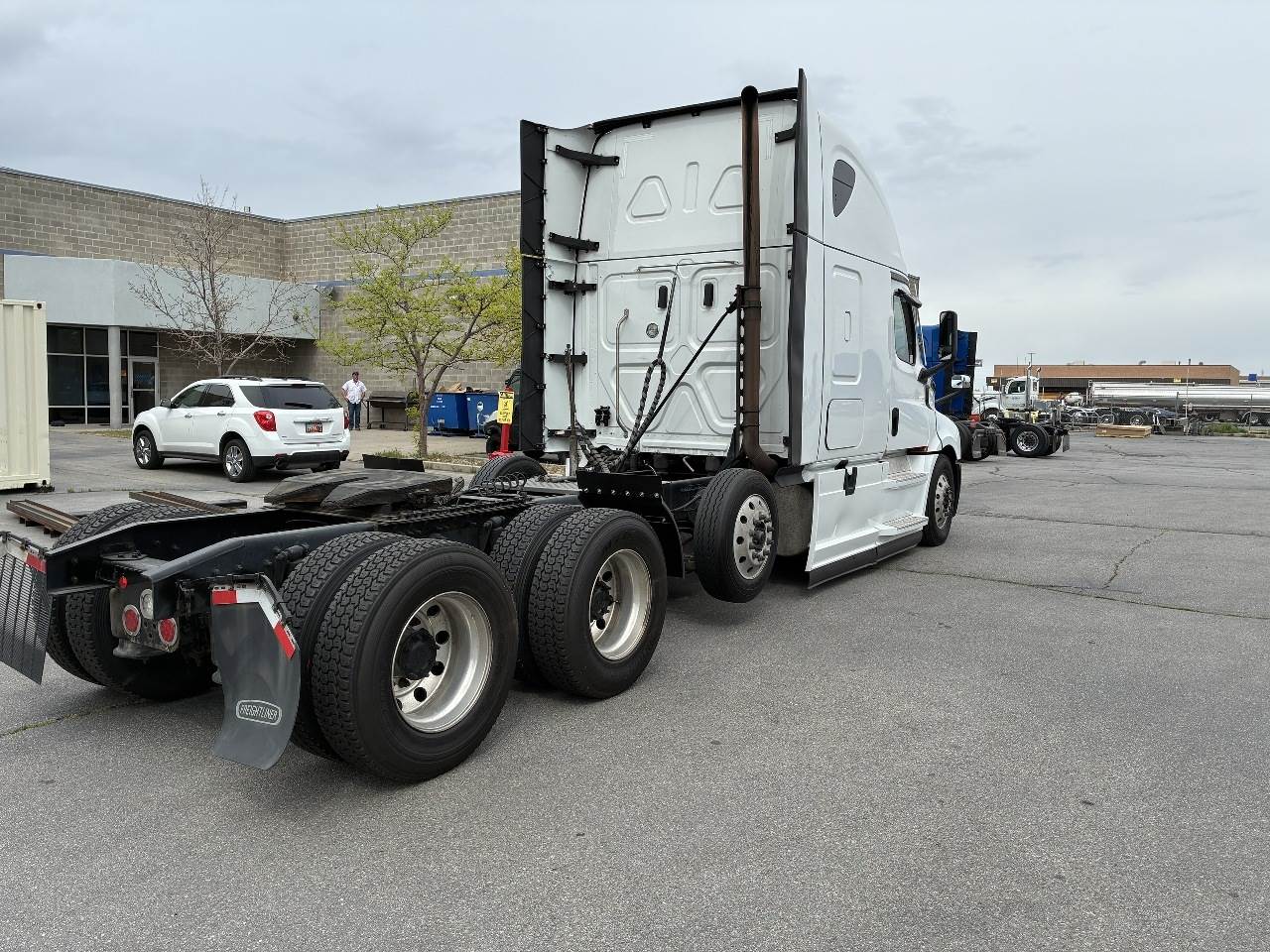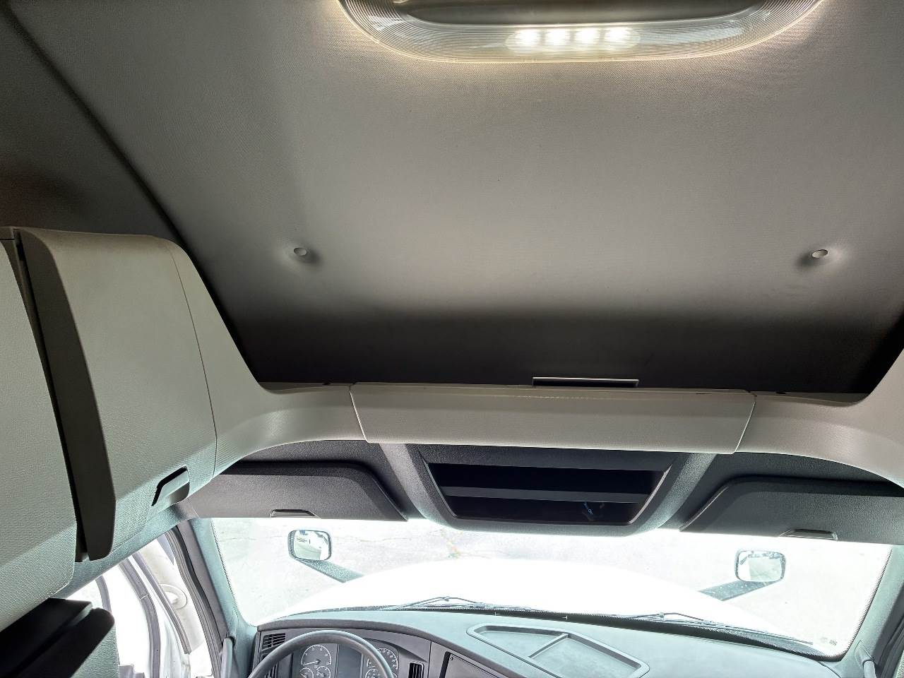 2021 Freightliner Cascadia 126 double bunk sleeper with drop axle - multiple units available, all equipped with a Detroit DD15 14.8 L 455 HP engine with engine brake paired with a Detroit DT12 1750 OH1 HD 12 speed automatic transmission and a Meritor 3.25 rear axle ratio. These trucks feature a tri axle configuration with a pusher drop axle. Steer axle is rated at 13,300 pounds on the front axle and 40,000 pounds on the rear axles with a 64,320 pound GVWR. Each unit includes dual aluminum fuel tanks totaling 200 gallons, a vertical exhaust, a steel frame, air ride suspension, and a 269 inch wheelbase. They are equipped with aluminum wheels and 295 75R22.5 tires along with an air slide fifth wheel. The 72 inch sleeper includes dual bunks, gray and black interior, dual high back seats with an air ride passenger seat, dual power mirrors, operational air conditioning, an AM FM Bluetooth radio, and Espar bunk heaters. Additional equipment includes heated mirrors, full fairings, and collision avoidance. The exterior is white with a painted bumper