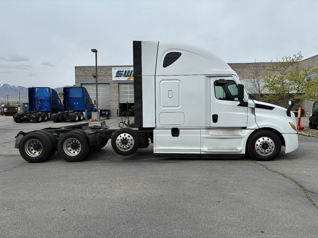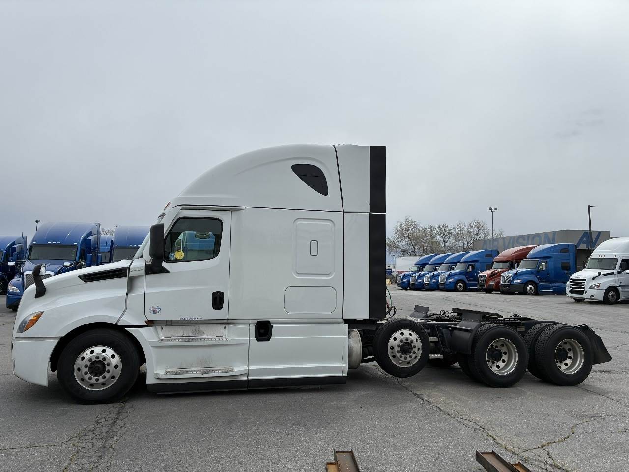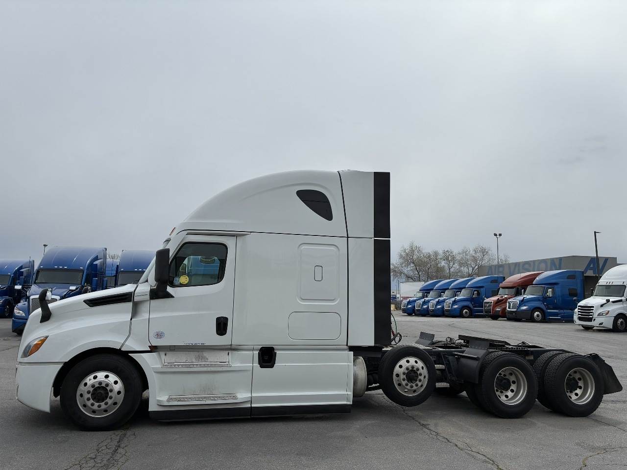 2021 Freightliner Cascadia 126 double bunk sleeper with drop axle - multiple units available, all equipped with a Detroit DD15 14.8 L 455 HP engine with engine brake paired with a Detroit DT12 1750 OH1 HD 12 speed automatic transmission and a Meritor 3.25 rear axle ratio. These trucks feature a tri axle configuration with a pusher drop axle. Steer axle is rated at 13,300 pounds on the front axle and 40,000 pounds on the rear axles with a 64,320 pound GVWR. Each unit includes dual aluminum fuel tanks totaling 200 gallons, a vertical exhaust, a steel frame, air ride suspension, and a 269 inch wheelbase. They are equipped with aluminum wheels and 295 75R22.5 tires along with an air slide fifth wheel. The 72 inch sleeper includes dual bunks, gray and black interior, dual high back seats with an air ride passenger seat, dual power mirrors, operational air conditioning, an AM FM Bluetooth radio, and Espar bunk heaters. Additional equipment includes heated mirrors, full fairings, and collision avoidance. The exterior is white with a painted bumper