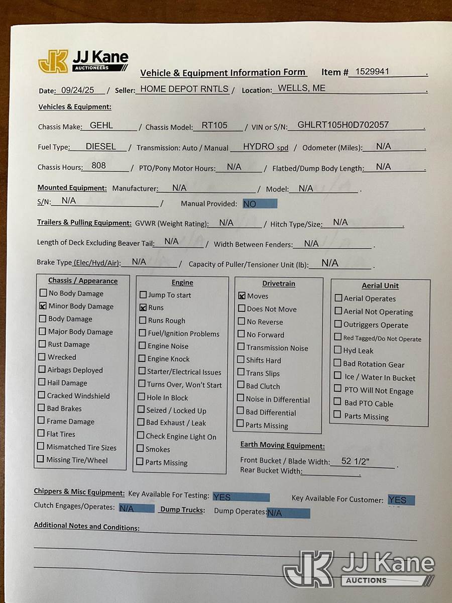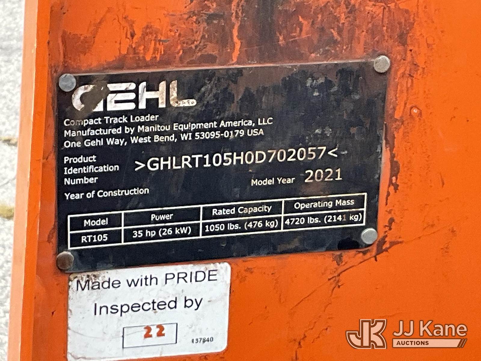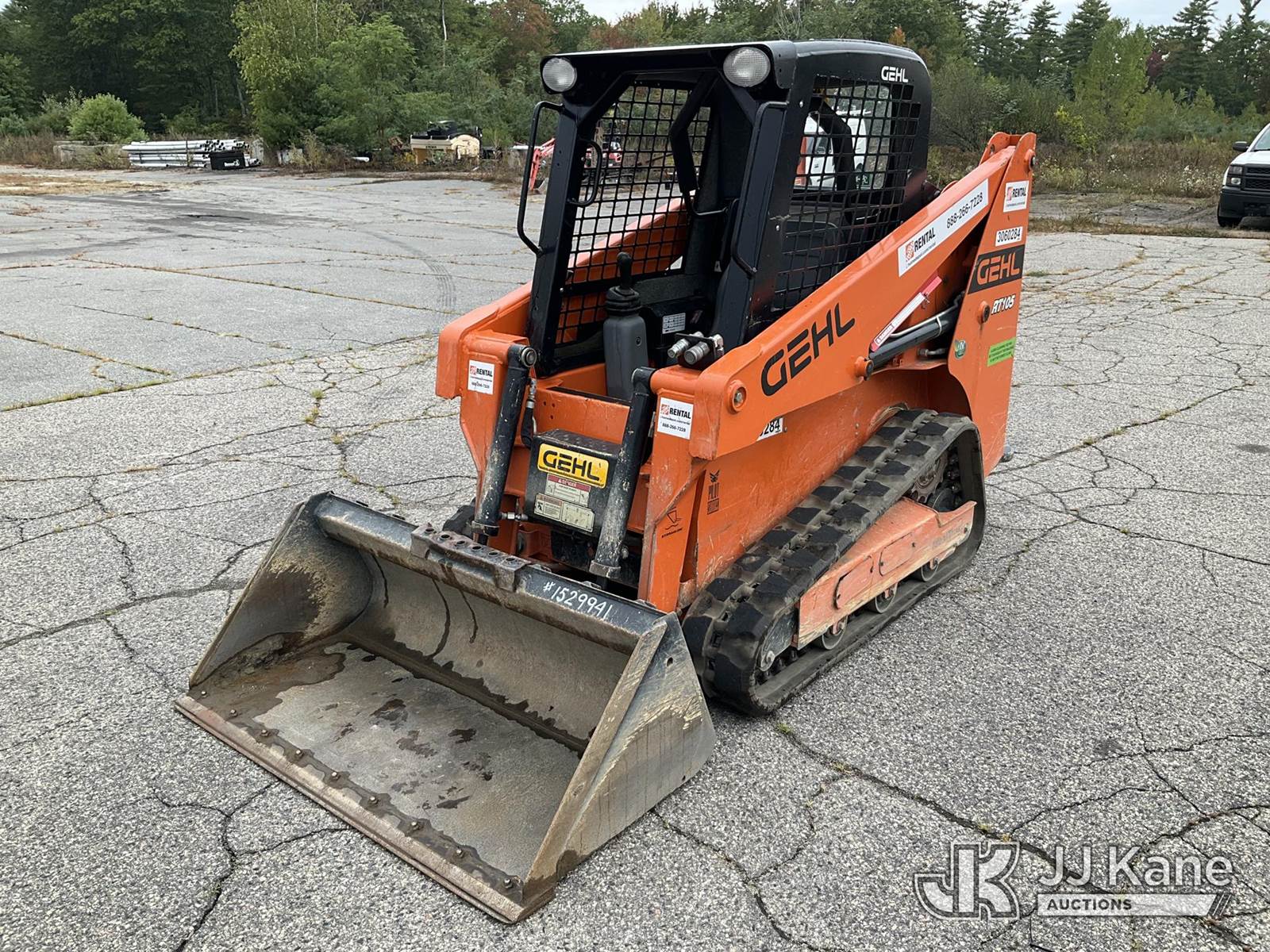 2021 Gehl RT105 Crawler Skid Steer Loader, s/n GHLRT105H0D702057, Yanmar diesel, Hydraulic Drive, with GP loader bucket, aux hyd outlets, rubber tracks & ROPS, (Runs, Moves & Operates) (Removal is by Appointment Only, Buyer MUST make a appointment prior to picking up, Buyer/Transporter Must have PAID IN FULL RELEASE. No onsite assistance available, Please Come prepared.) (Reads 808 hours) NOTE: This unit is being sold AS IS/WHERE IS via Timed Auction and is located in Wells, ME. Inspection days are the Tuesday through Thursday prior to the auction. (Buyer is responsible for removal. Assistance by consignor or JJ Kane Auctioneers is not assured.)