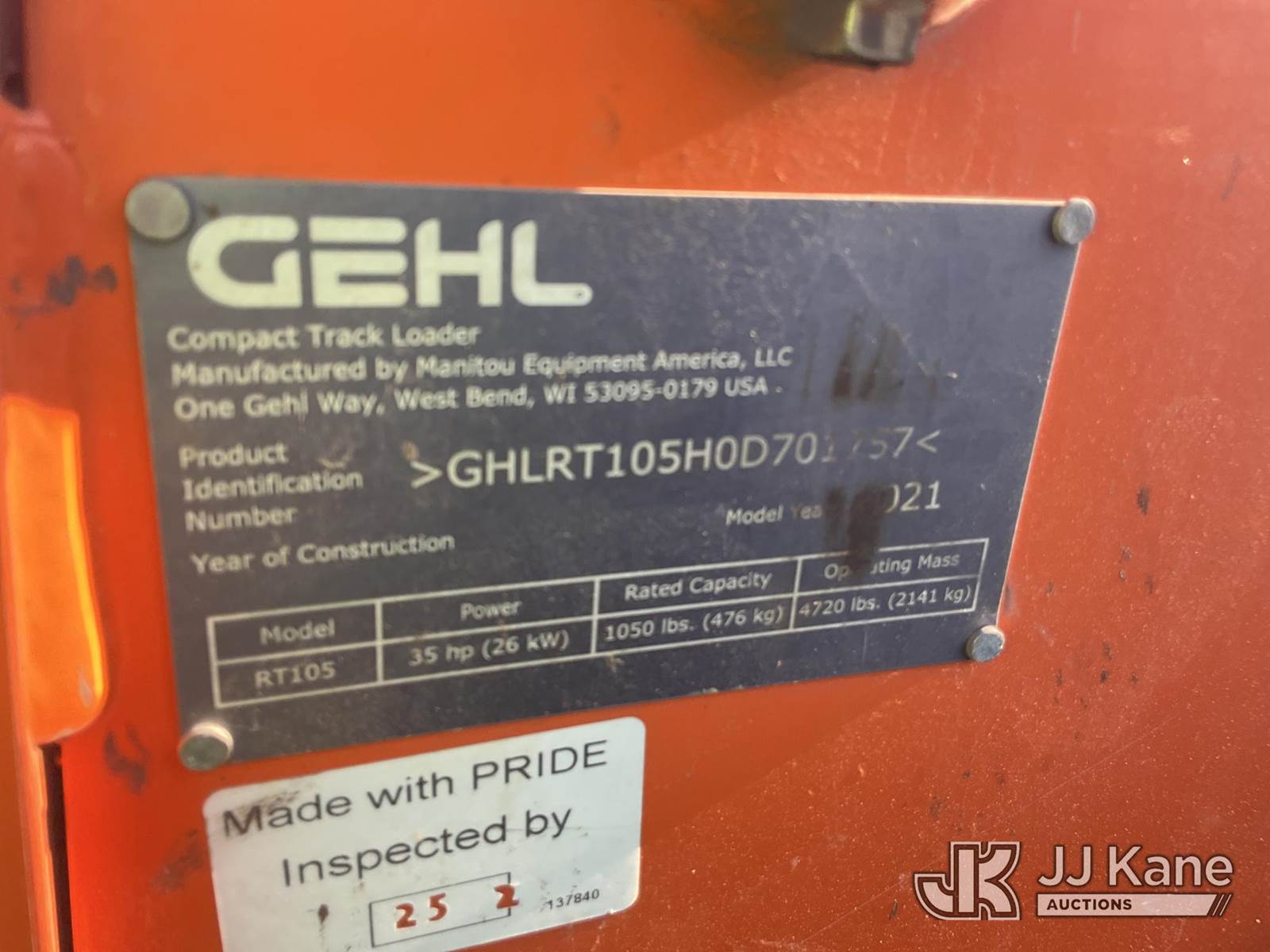 2021 Gehl RT105 Crawler Skid Steer Loader, s/n GHLR105H0D701757, Yanmar Hydraulic Drive, diesel, with Rubber Tracks, QD Loader Bucket, Aux. Hyd. Outlet & ROPS, (Runs, Seat Safety Bar Does Not Stay In The Up Position ) (Reads 909 hours) NOTE: This unit is being sold AS IS/WHERE IS via Timed Auction and is located in Plymouth Meeting, PA. Inspection & preview days for this unit are the 2 business days prior to the first day of items closing for this auction, item is located at 1402 Conshohocken Rd Plymouth Meeting, PA 19462 and hours of operations are 8a-4p. For pre-sale questions, please contact Bruce Thomas @ (267)-887--0392 or bruce.thomas.jr@jjkane.com. (Buyer is responsible for removal. Assistance by consignor or JJ Kane Auctioneers is not assured.)