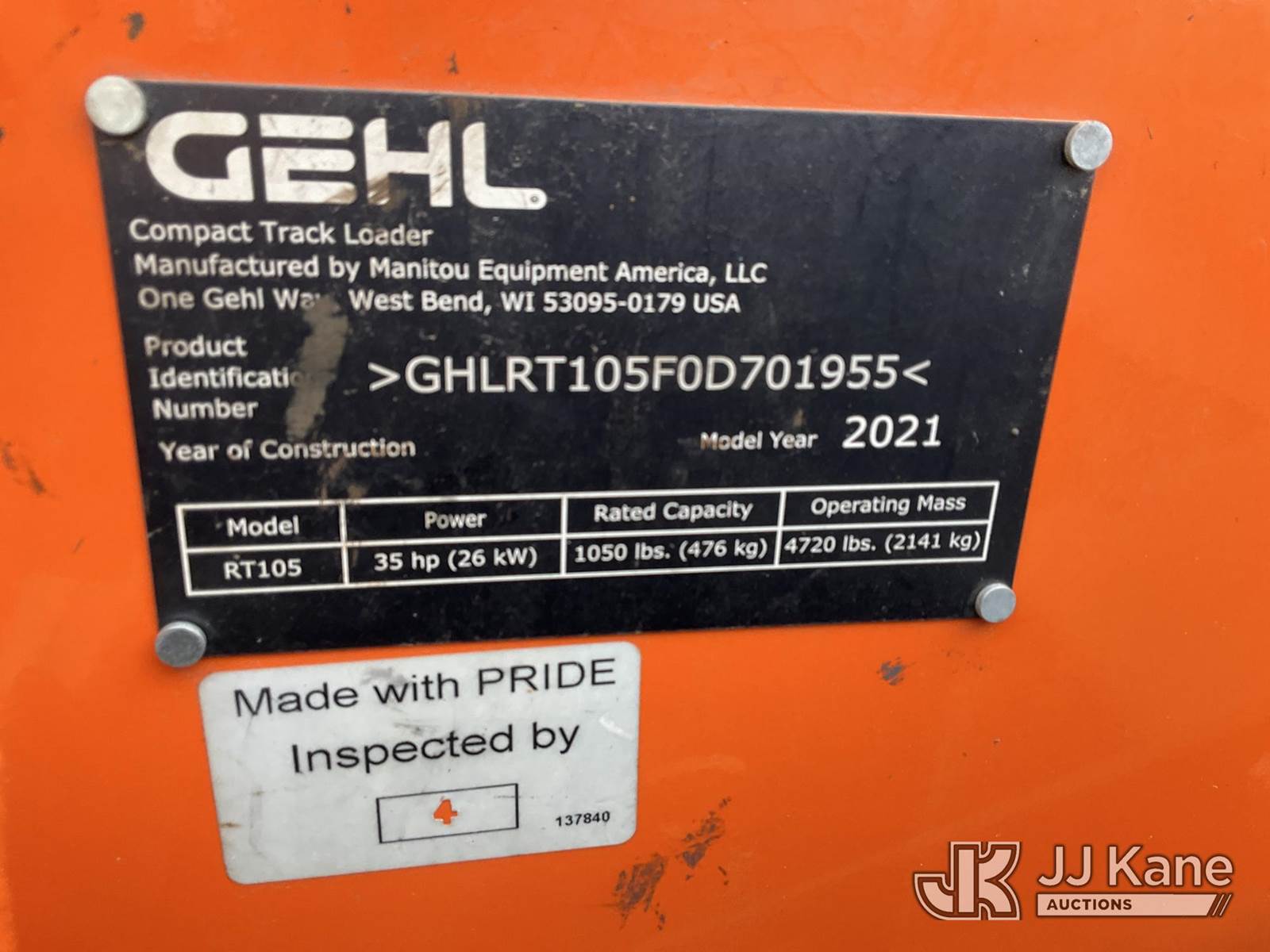 2021 Gehl RT105 Crawler Skid Steer Loader, s/n GHLRT105F0D701955, Yanmar diesel, Hydraulic Driven, with GP bucket, aux hyd, rubber tracks & ROPS, (Runs, Moves, Operates ) (Reads 883 hours) NOTE: This unit is being sold AS IS/WHERE IS via Timed Auction and is located in South Beloit, IL. Inspection & preview days for this unit are the 2 business days prior to the first day of items closing for this auction, item is located at 14354 Dearborn Ave South Beloit, IL and hours of operations are 8a-4p. For pre-sale questions, please contact Derek Eklund at (608) 904-0618 or (derek.eklund@jjkane.com). (Buyer is responsible for removal. Assistance by consignor or JJ Kane Auctions is not assured.)