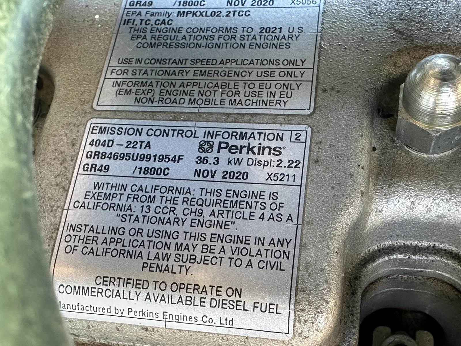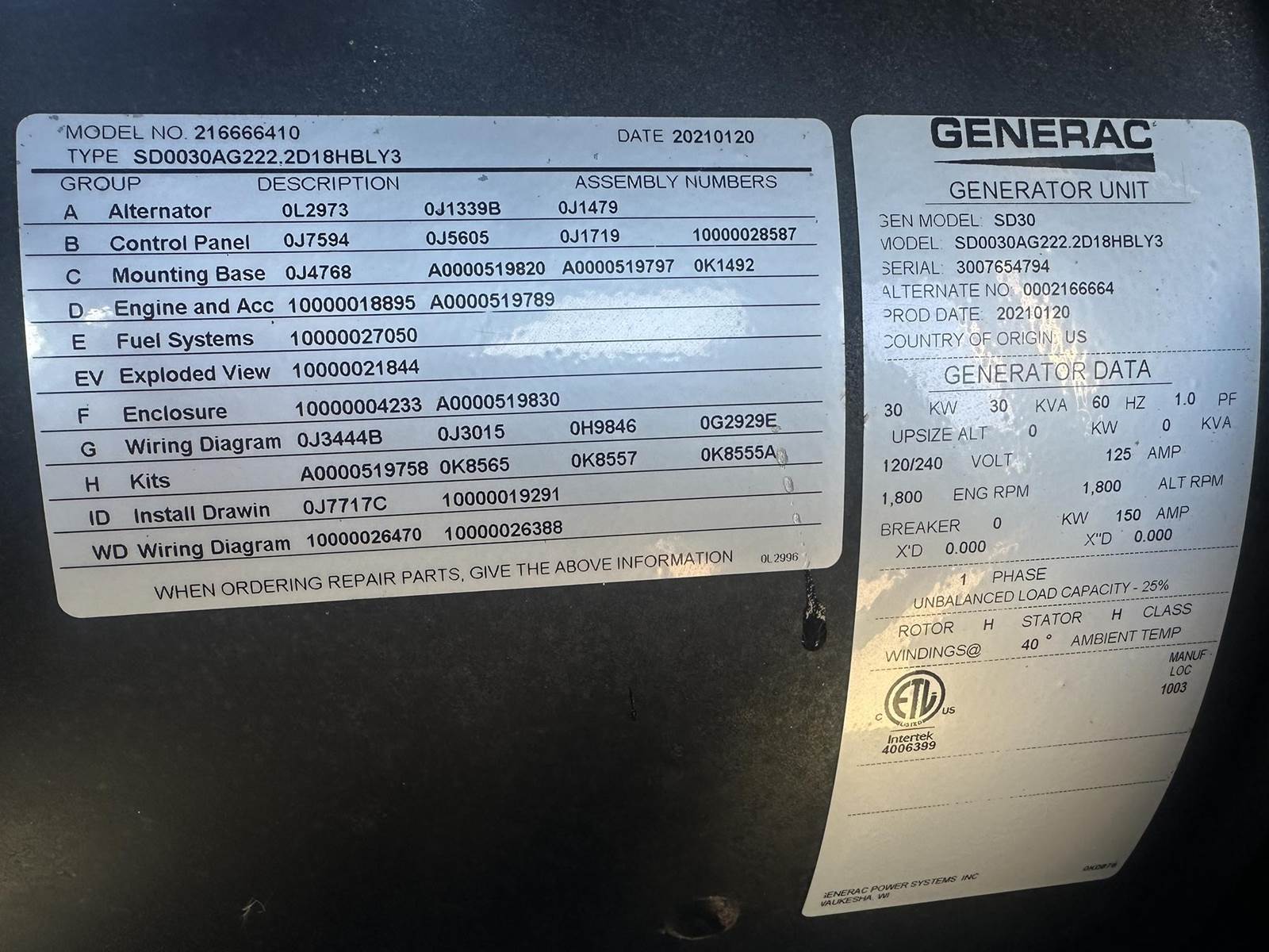 Used Generac 30 kW standby (27 kW prime) diesel generator set, model SD30, SN-3007654794. Perkins 404D-22TA engine rated 49 HP at 1800 RPM, SN-GR84695U991954F. 1/60/120/240V, non-reconnectable to other voltages. 150 Amp main-line circuit breaker. Generac digital H control panel. Coolant heater. Sound attenuated enclosure. 200 gallon UL listed sub-base fuel tank with secondary containment. 86 Hrs. Yr 2021. Load test pending. Overall dimensions 38W x 106L x 93H, 3000 Lbs. FOB Waukesha, WI