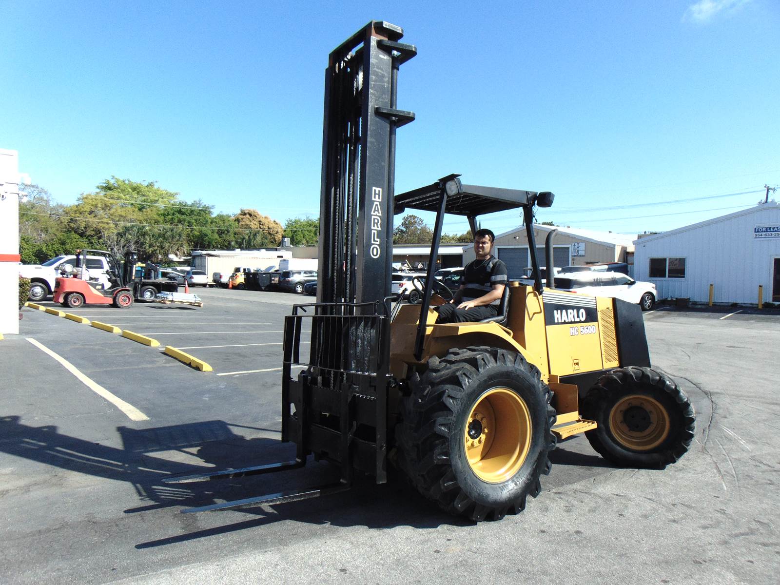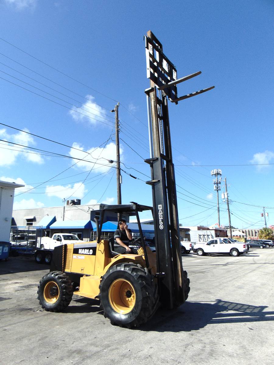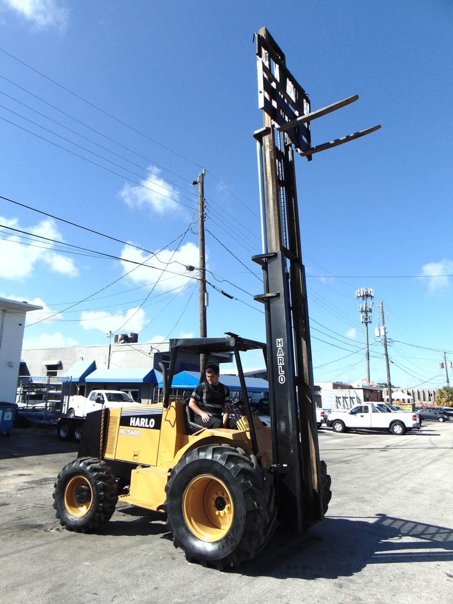 PRO-QUIPLLC.COM CALL 954-367-3867 2001 HARLO HC5600 ROUGH TERRAIN FORKLIFT CUMMINS DIESEL 4 SPEED TRANSMISSION 4 WHEEL DRIVE 3-STAGE MAST...