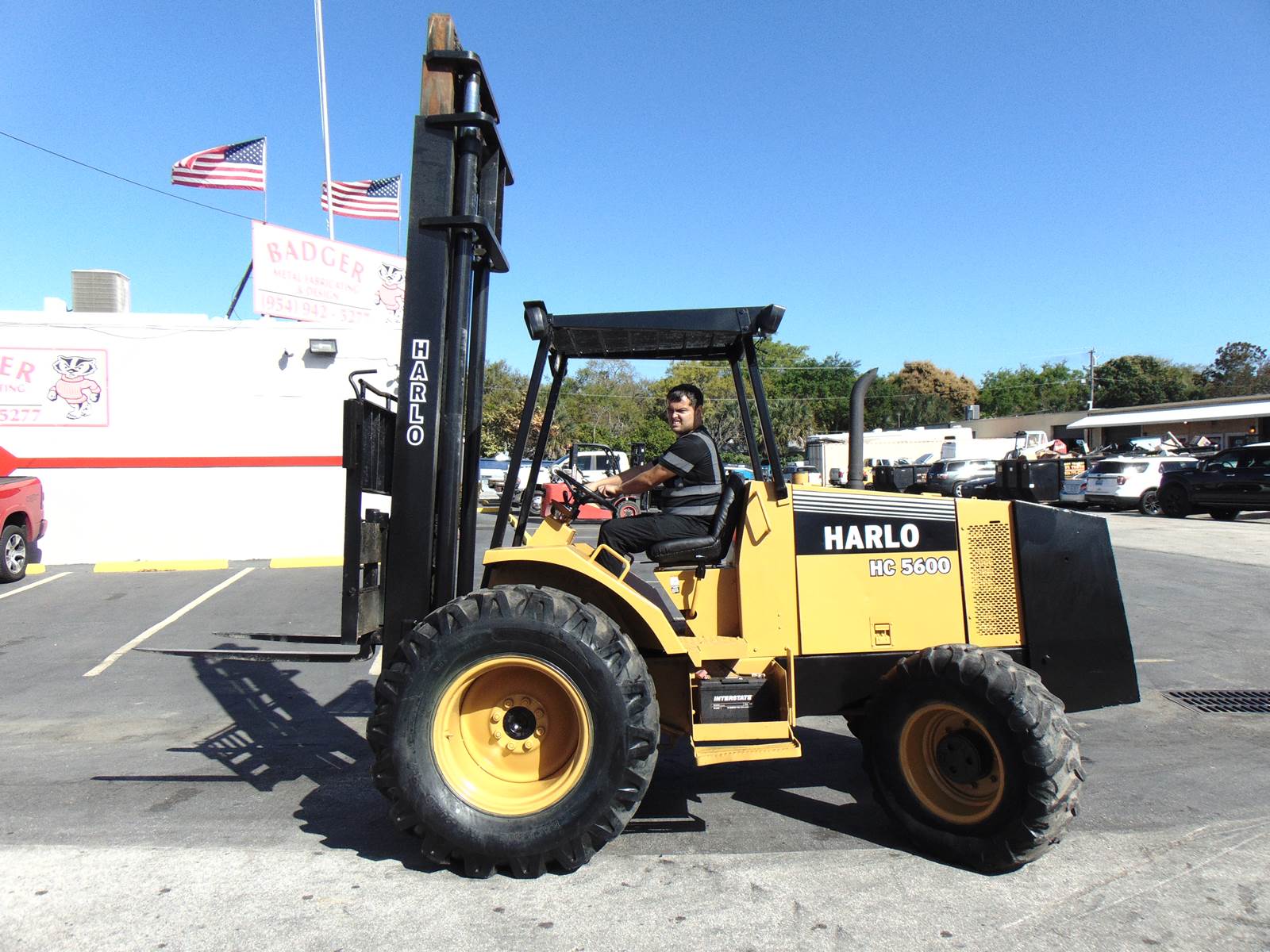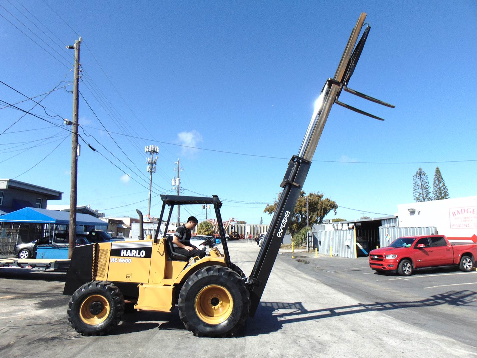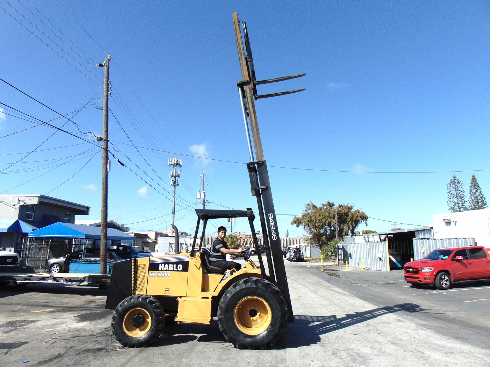 2002 2001 HARLO HC5600 ROUGH TERRAIN 4WD TRIPLE MAST FORKLIFT - 5,000 POUNDS - 28 FT HEIGHT - SIDE SHIFTER - CUMMINS DIESEL - SERVICED AND JOB READY