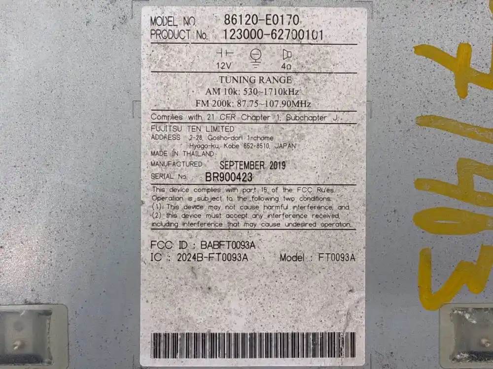 (Used) 2021 Hino 268, RADIO- Part Number: 86120-E0170, Serial Number: BR900423, Type: Hino, Factory, Plays: AM/FM, Disc, USB, AUX, Model No. 86120-E0170, FCC ID: BABFT00936A, IC: 2024N-FT0093A, For more information about this item, give us a call. We ship Worldwide! (CRG HEAVY TRUCK PARTS) 929 W PULASKI HWY ELKTON, MD 21921