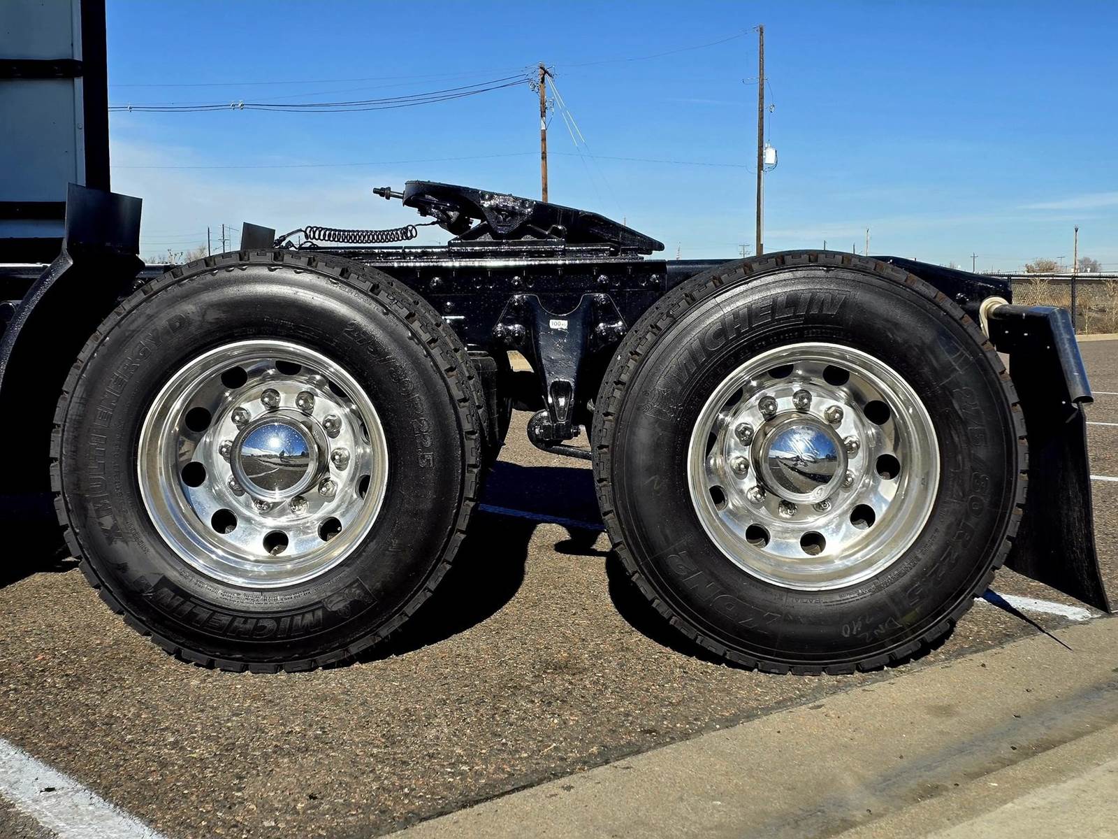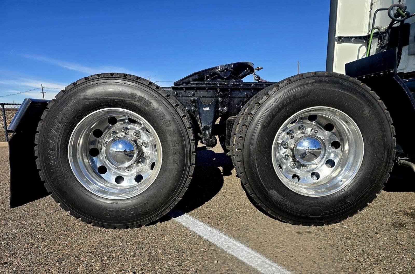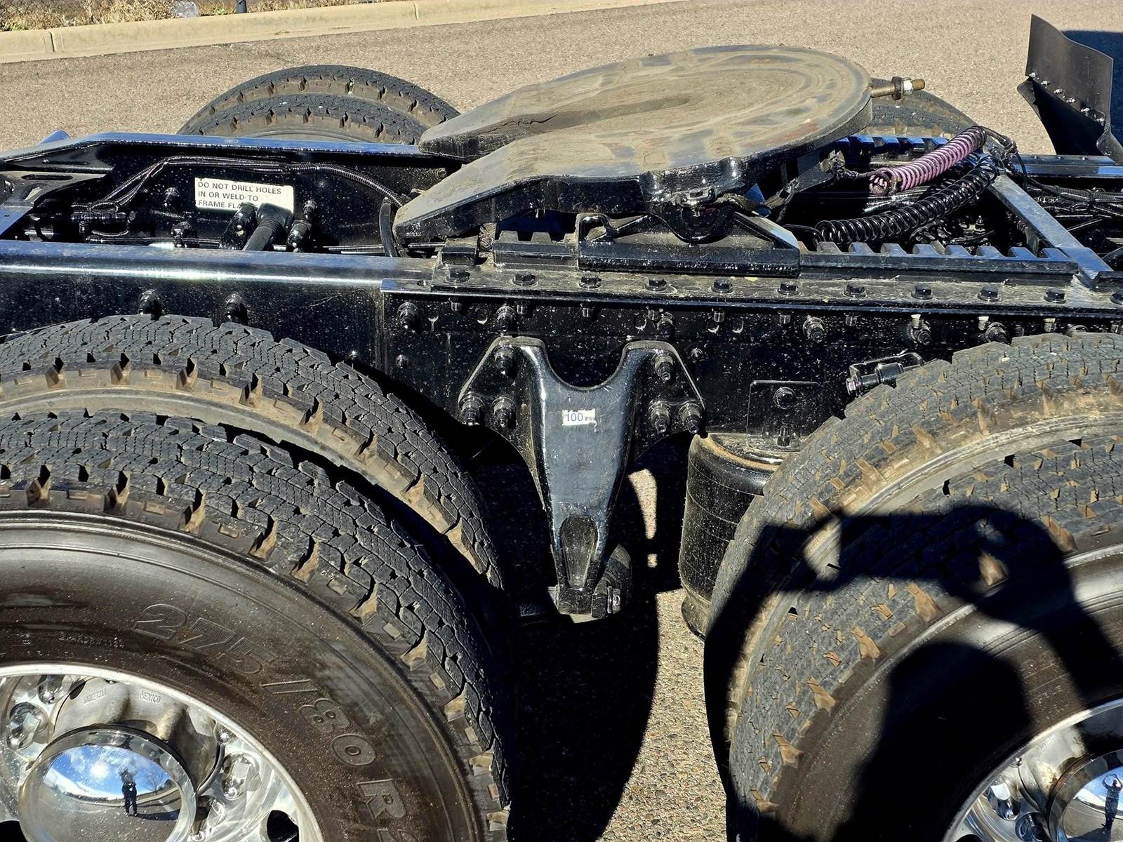 This vehicle features a 6x4 drive with an air ride suspension and a tandem rear axle. It has a Class 8 gross vehicle weight rating of 33,001 lbs or greater, with a total weight of 53,200 lbs. The front axle weighs 13,200 lbs, and the rear axle is rated at 40,000 lbs. It is equipped with 22.5-inch tires that are 75% worn and all-aluminum wheels. The wheelbase measures 228 inches, and it has a sliding 5th wheel with a drum brake system.