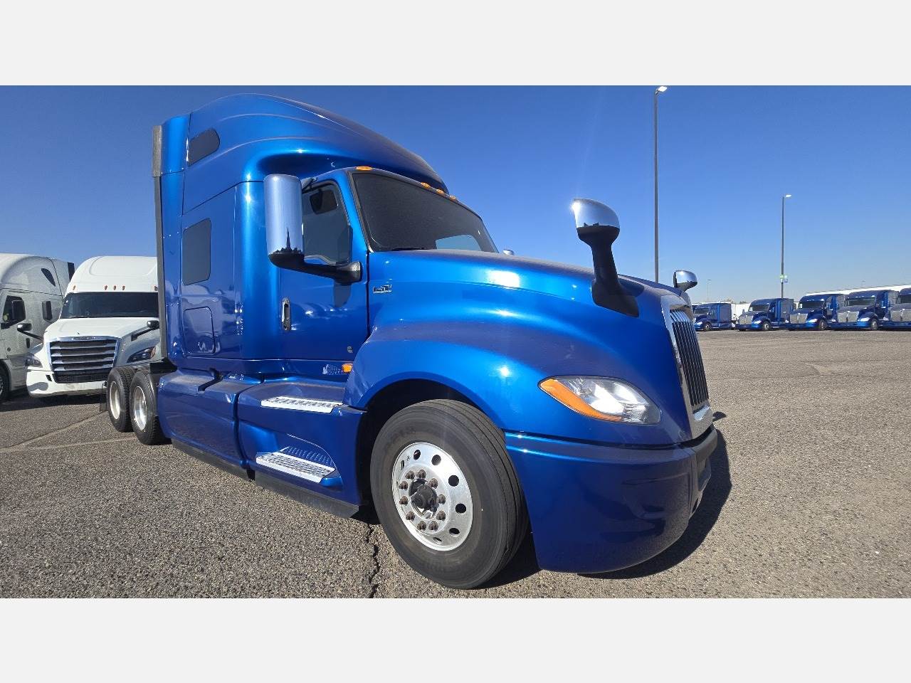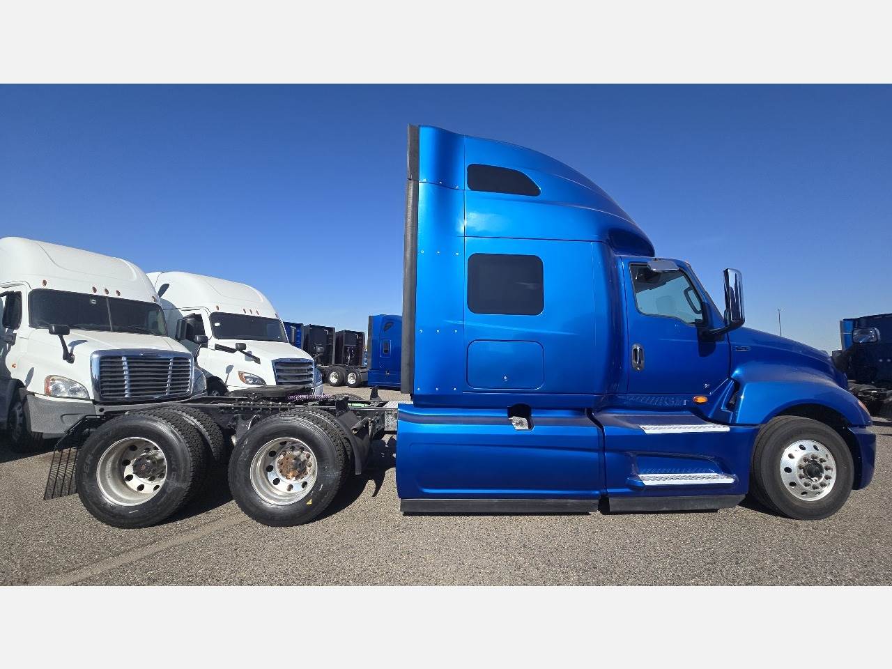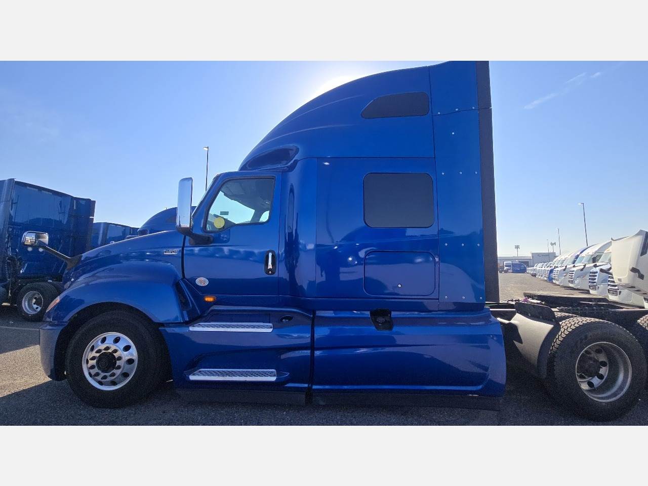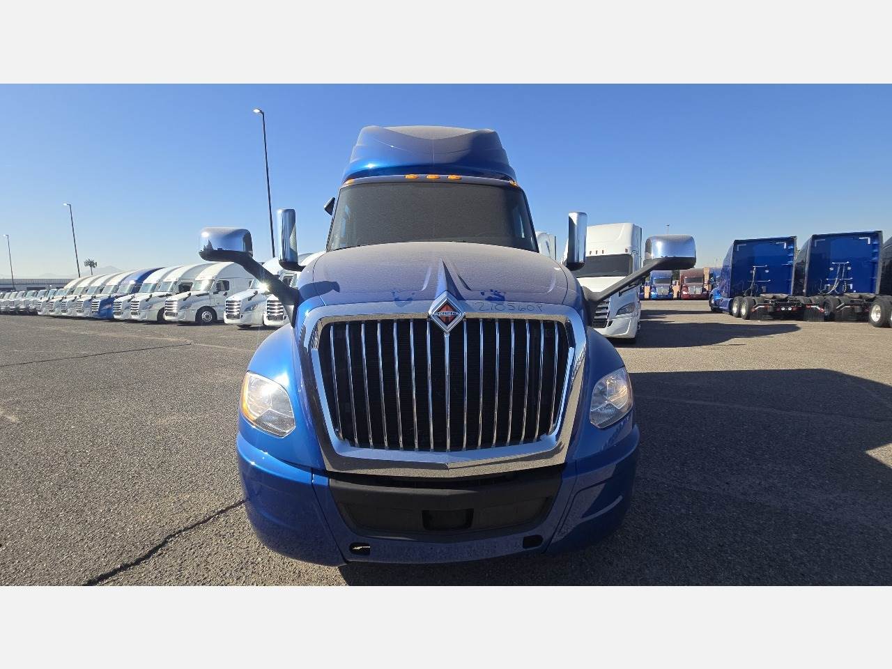 Phoenix, AZ - 2021 International LT625 with 425,532 miles. Powered by a Cummins X15 14.9L engine rated at 400 HP, paired with an Eaton 12-speed automatic transmission. Equipped with engine brake, power steering, cruise control, overdrive, and dual 100-gallon aluminum fuel tanks. Features include Meritor 2.64 rear end, tandem axles rated F 12,350 lb / R 40,000 lb, steel frame, air ride suspension, GVWR 52,350 lbs, and a 226" wheelbase. Tires are 295/75R22.5 on aluminum wheels with an air slide fifth wheel. The truck has a 73" sleeper with dual bunks, dual high-back seats, an air ride passenger seat, gray interior, air conditioning, AM/FM Bluetooth radio, and dual power mirrors. Exterior is blue with heated mirrors, full fairings, and collision avoidance system.