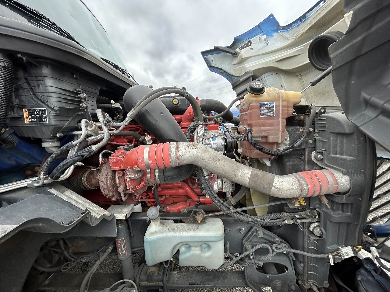 2021 International LT625E with 489,826 miles. Powered by a Cummins X15 engine rated at 450 HP, paired with an Eaton 12-speed automatic transmission. Equipped with engine brake, power steering, cruise control, overdrive, and dual 200-gallon aluminum fuel tanks. Features include Meritor 2.64 rear end, tandem axles rated F 12,350 lb / R 40,000 lb, steel frame, air ride suspension, GVWR 52,350 lbs, and a 226" wheelbase. Tires are 295/75R22.5 on aluminum wheels with an air slide fifth wheel. The truck has a 76" sleeper with dual bunks, dual high-back seats, an air ride passenger seat, grey interior, operational air conditioning, AM/FM Bluetooth radio, and dual power mirrors. Exterior is blue with painted bumper, heated mirrors, full fairings, and collision avoidance system.