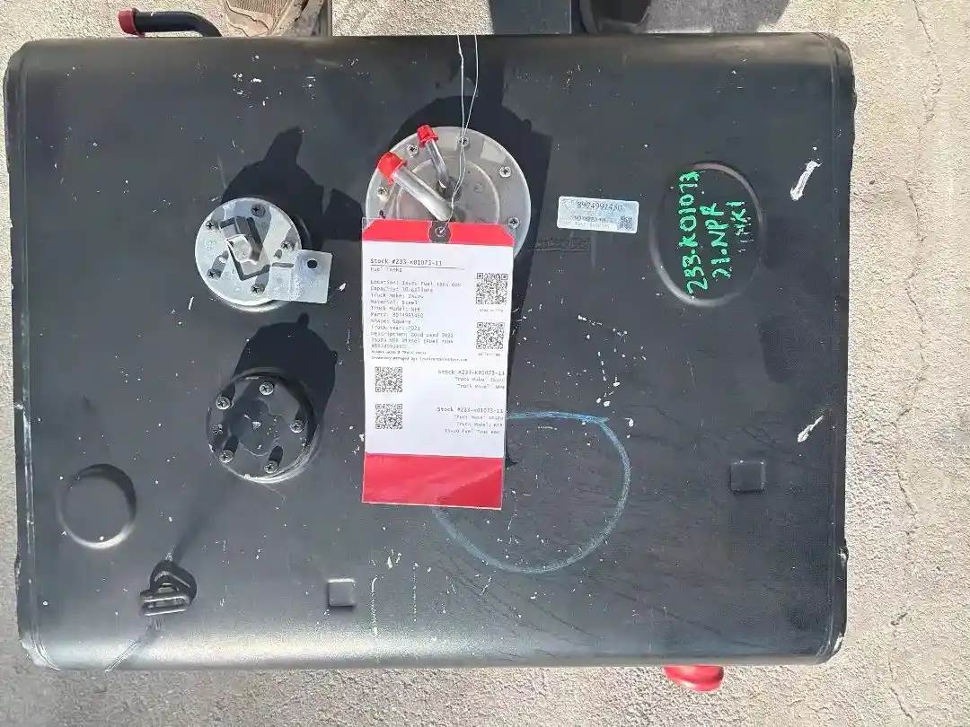 Good used 2021 Isuzu NPR Diesel (Fuel Tank #8974991450). Call for questions on price and shipping. All parts come with a 90 day warranty. All Fuel Tanks are drained of all fluids, cleaned, and Inspected before shipping. To check availability for any of our parts, call us or visit our website BusbeeTruckParts.com. (Interchange: 2008 2009 2010 2011 2012 2013 2014 2015 2016 2017 2018 2019 2020 2021 Isuzu NPR NRR NQR NPR-HD Chevrolet GMC W3500 W4500 W5500 4HK1-TC Diesel)., Capacity: 30 Gallons, Dimensions: 25”x21”x17”, Material: Steel, Shape: Square