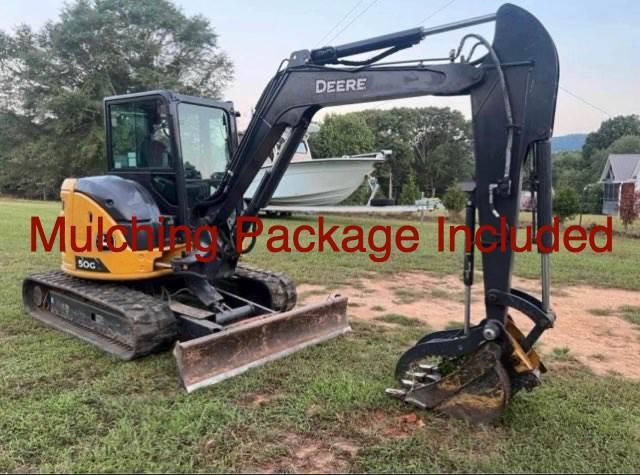 2021 Deere 50G EXCAVATOR with FAE Mulching Package. Runs up to 23.1 GPM. FAE L1/Ex with bite limiters and less than 150 hours on head. Runs 16-23 GPM, requires case drain, fitted with steel knives. Excavator and mulching head sold together.