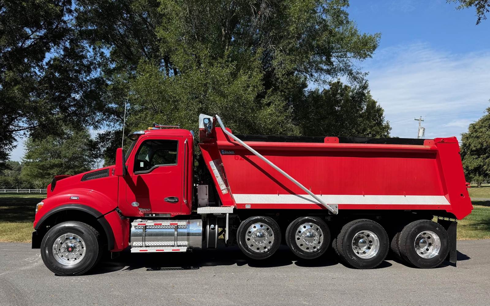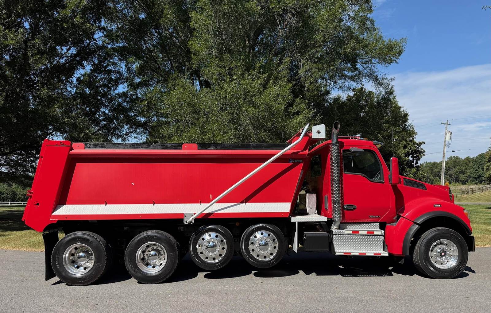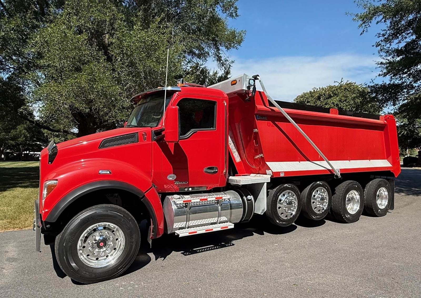 Quad Axle, 17' R/S Steel Dump w/54" Sides, MX13 Paccar 455 HP, Allison Automatic 6 Speed, 3 Stage Engine Brake, 4.10 Ratio, Double Frame, Chalmers, 20K FA, 46K RA, (2) 13,500 Steerable L/A, 256" WB, 23'7" Bridge, Diff Lock, Electric Tarp, Air Tailgate, P/S, A/C, AM/FM Bluetooth, Heated Mirrors, Cruise, Tilt/Tele Wheel, Power Windows, Locks, and Mirrors, Dual High Back Seats, 110 Gallon Aluminum Fuel Tank, 385/65R22.5 Steer Tires on Aluminum Wheels, 11R22.5 Drive Tires on Aluminum Wheels Outside, Chrome Bumper