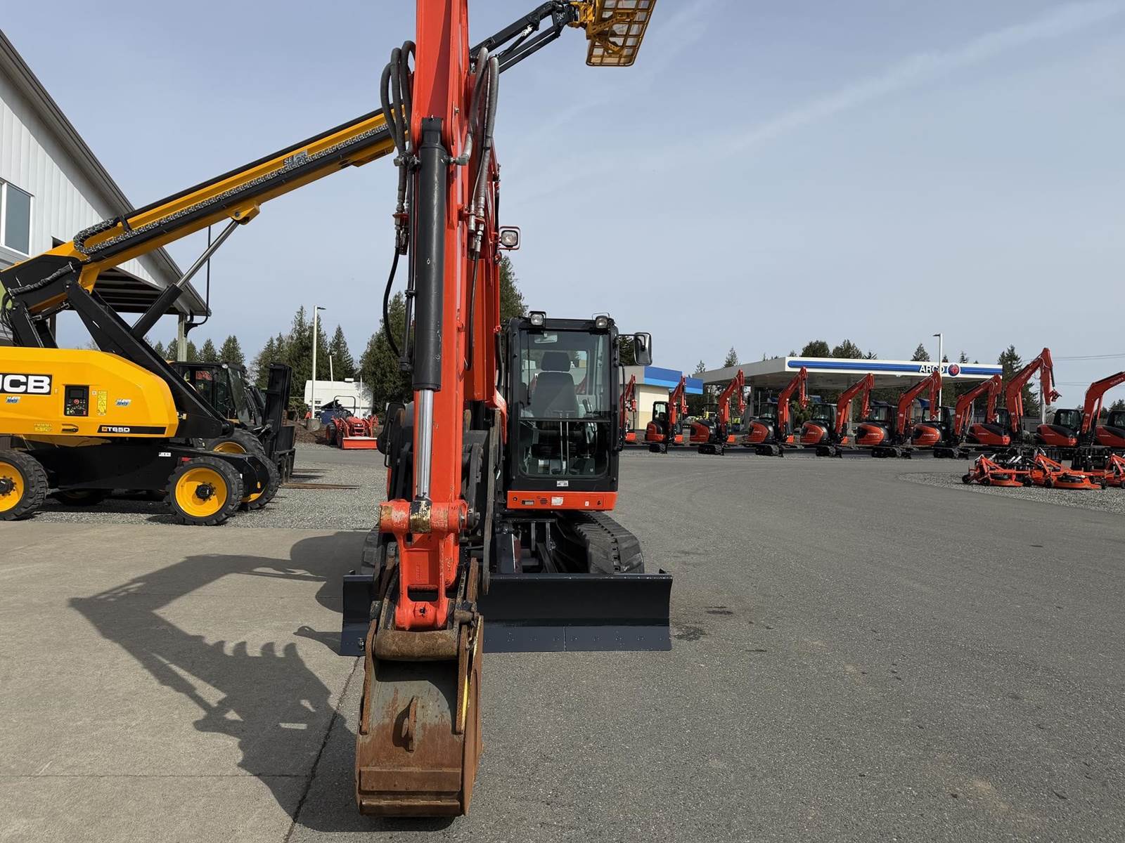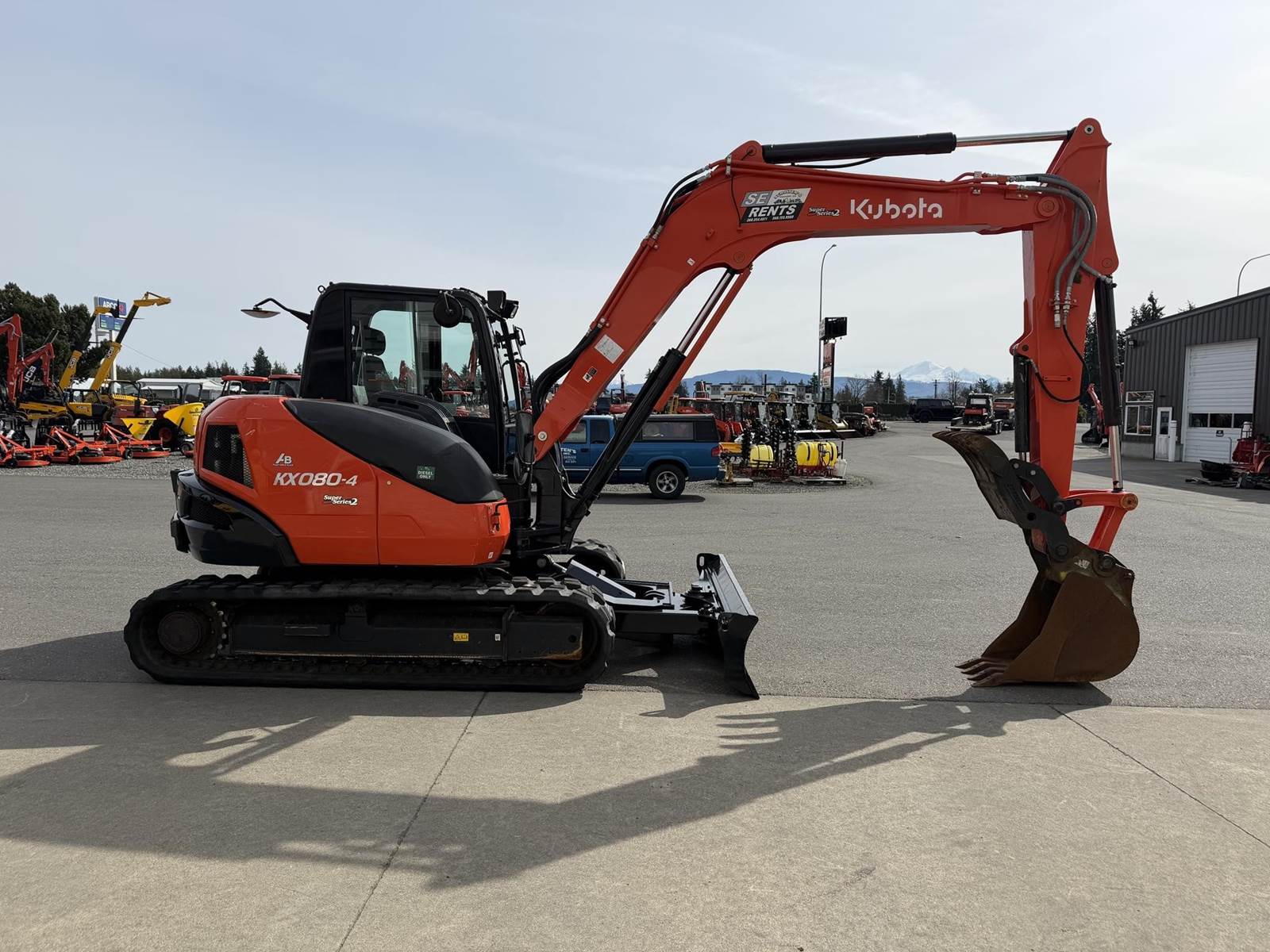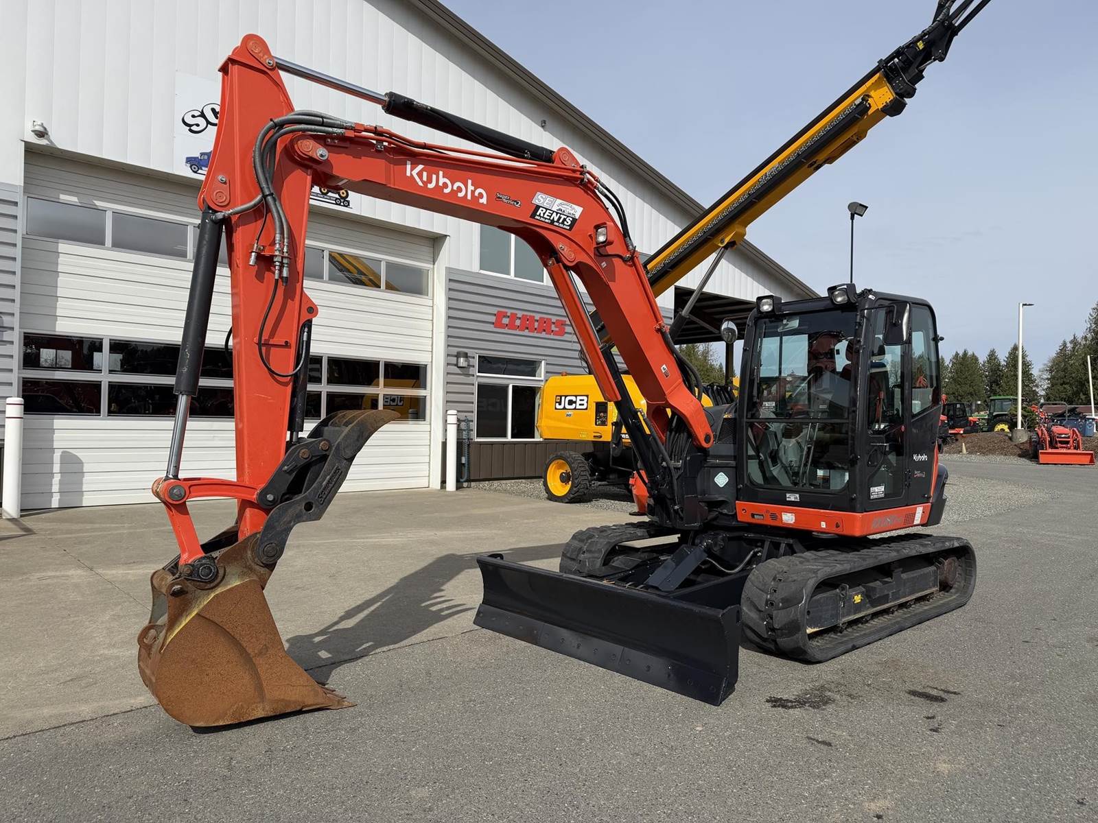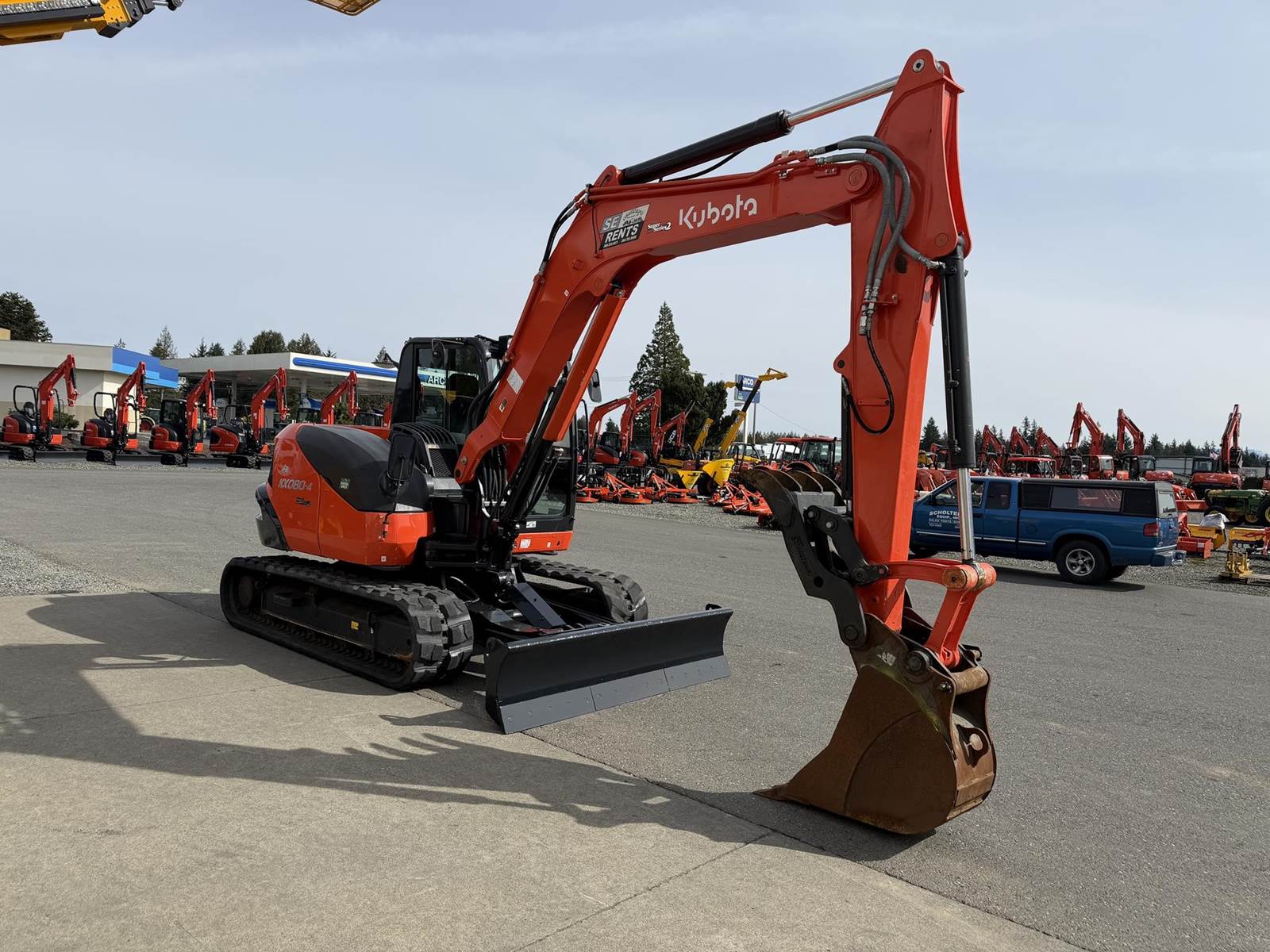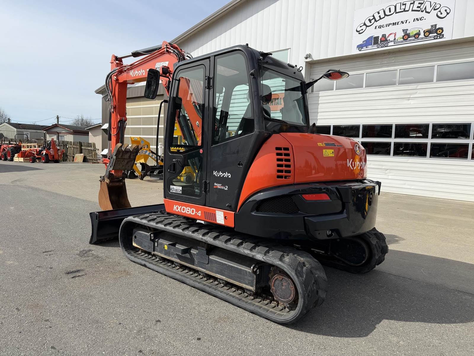 2021 KUBOTA KX080-4S2R3A Excavator - Kubota diesel engine, hydraulic thumb, proportional flow control of auxiliary circuits, two buckets, auto-shift, hydraulic angle blade, digital panel, deluxe suspension seat, heat and air conditioning. 23'-11.4" max digging height, 15'-1.1" max digging depth.