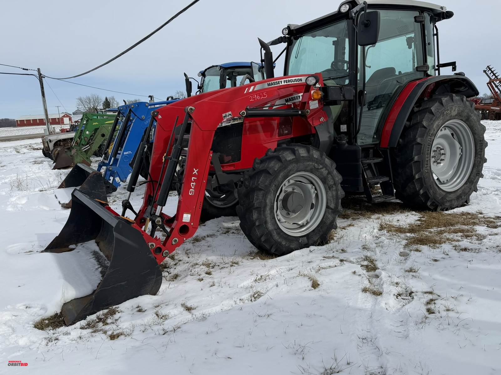 2021 Massey Ferguson 5711 4-WD loader tractor, Massey Ferguson 941X loader attachment with a 82" wide bucket, manual quick attach, 420/85R34 rear tires, 340/85R24 front tires, 540 PTO shaft, 2 point lift arms, 2 rear hydraulic remotes, rear 2-point arm controls, dual side cab doors, heat, A/C, AM/FM stereo, joystick loader controls, Buddy seat, 957 metered hours showing, Product ID #AGCMC290LMC000158, runs and operates.