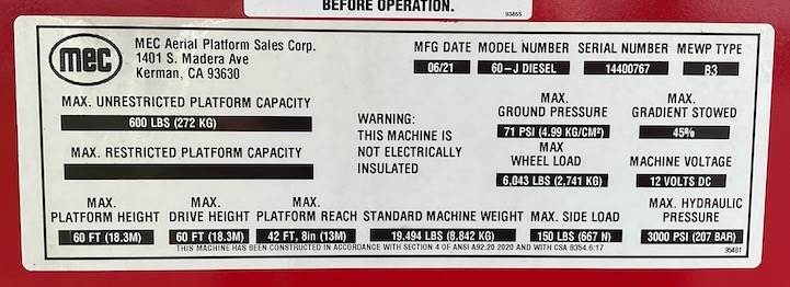 In conclusion, the 2021 MEC 60J-D Boom Lift provides high reach, powerful diesel performance, and proven MEC durability. Whether for construction, facility upkeep, or industrial applications, it’s built to perform reliably in tough conditions.