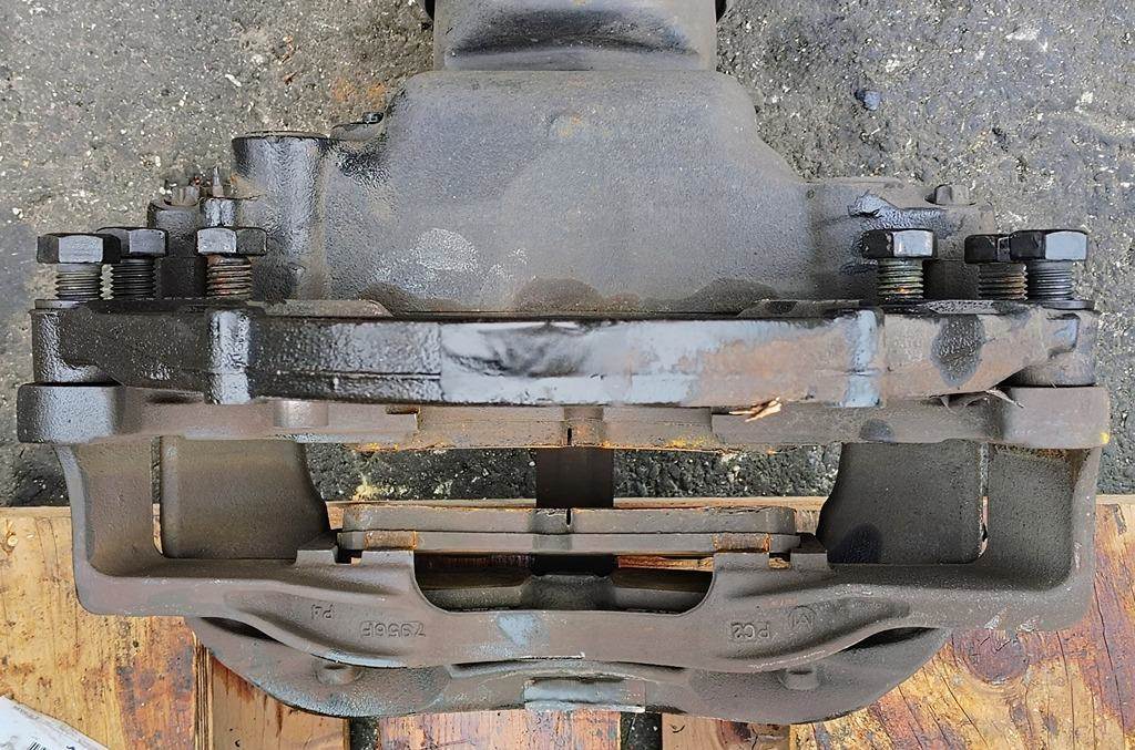 Meritor EX225L Rear Driver Side Air Disc Brakes w/ Torque Plate. P/N EX225L261CG207, Casting # 8039H, Pad Carrier Casting # 7956F, Torque Plate Casting # 3215L2508B