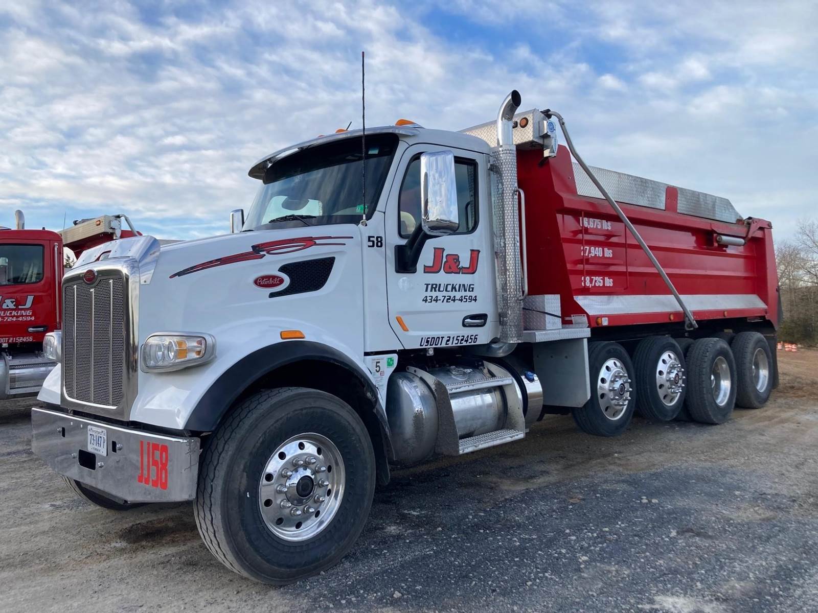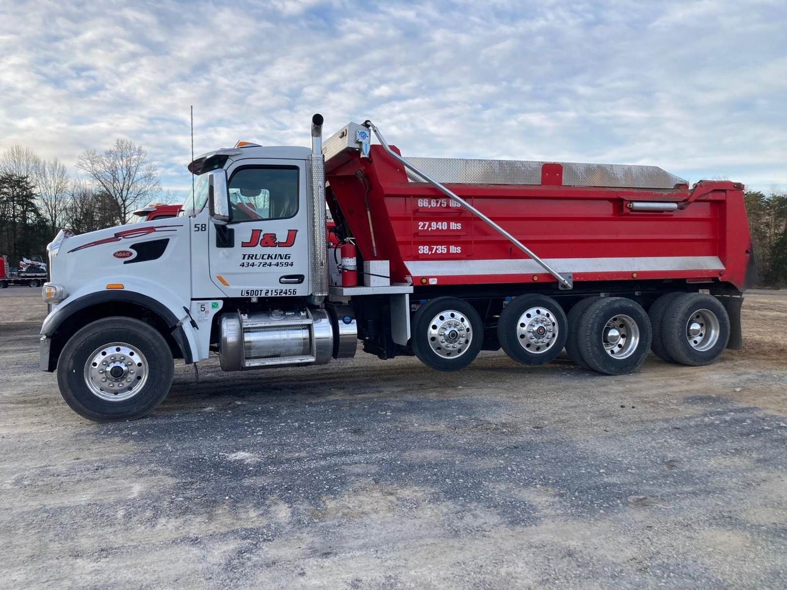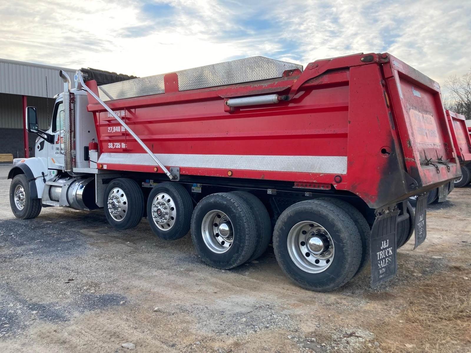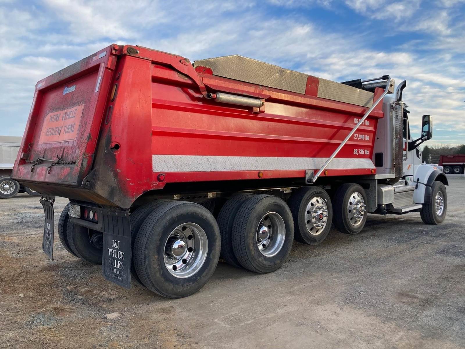 Quad Axle, 17.5' R/S Steel Dump w/48" Sides, High Lift Gate, MX13 Paccar 455 HP, Allison Automatic 6 Speed, 3.91 Ratio, 3 Stage Engine Brake, HaulMaax, Double Frame, 20K FA, 46KRA, (2) Steerable L/A, 270" WB, 24'10" Bridge, Dual Exhaust, Dual P/S Boxes, Diff Lock, Wheel Lock, Electric Tarp, Air/High Lift Tailgate, P/S, A/C, AM/FM Bluetooth, Heated Mirrors, Cruise, Tilt/Tele Wheel, Power Windows, Locks, and Mirrors, Dual High Back Seats, 100 Gallon Aluminum Fuel Tank, 315/80R22.5 Steer Tires on Aluminum Wheels, 11R22.5 Drive Tires on All Aluminum Wheels, Chrome Bumper, FLEET MAINTAINED, EMPTY WEIGHT 27,940, LEGAL IN VA FOR 19.4 TONS